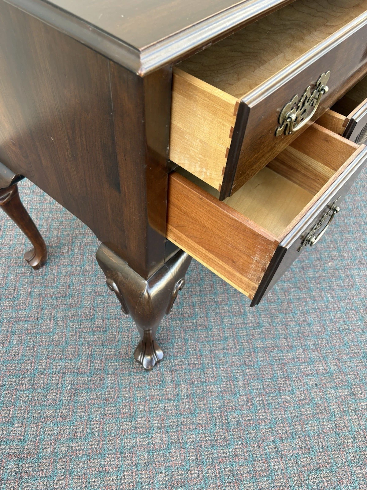 This charming Ethan Allen mahogany low boy dresser chest exudes the timeless elegance of Queen Anne style, seamlessly blending functionality with classic design. Crafted from rich mahogany, its smooth surface showcases the distinctive grain of the wood, while four spacious drawers provide ample storage for any bedroom. Sturdy and well-maintained, this piece is a testament to fine craftsmanship from the late 20th century, perfect for adding a touch of warmth and character to your home. Embrace the history and artistry of this lovely dresser, a true piece of Americana.