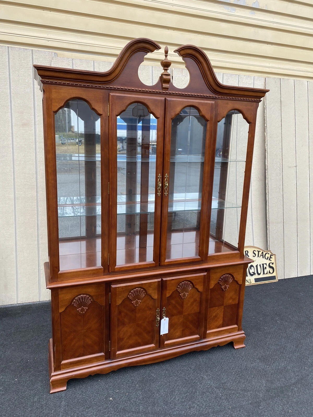 This elegant two-piece mahogany china cabinet breakfront beautifully showcases the artistry of mid-20th century craftsmanship. With its rich, warm tones and traditional design, it features four glass-panel doors that invite you to display cherished dishes or collectibles, accentuated by plate glass shelves and a gentle interior light. The handmade quality and sturdy construction promise both function and charm, making it a timeless addition to any home. This piece reflects not just style but a legacy of fine American furniture-making.