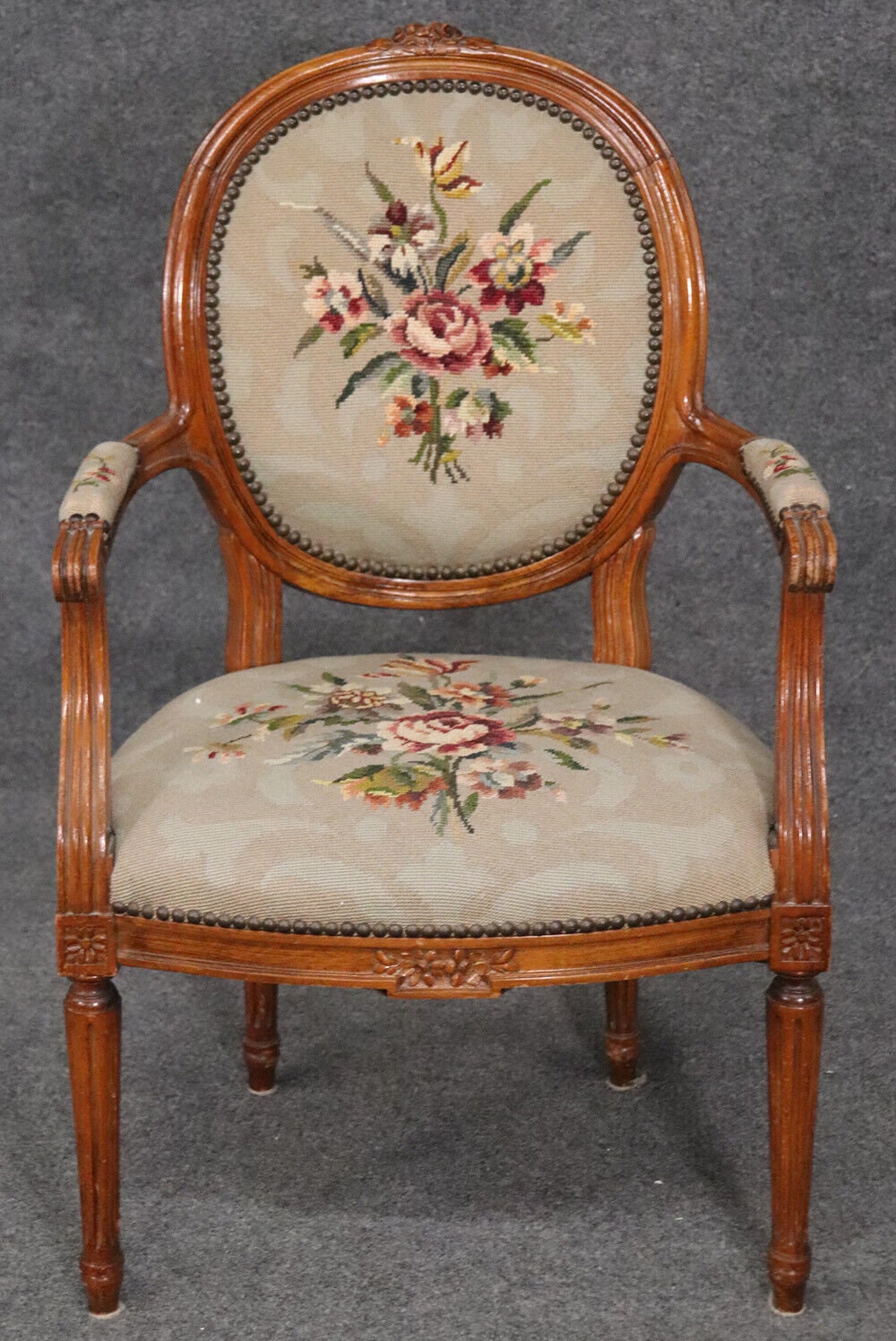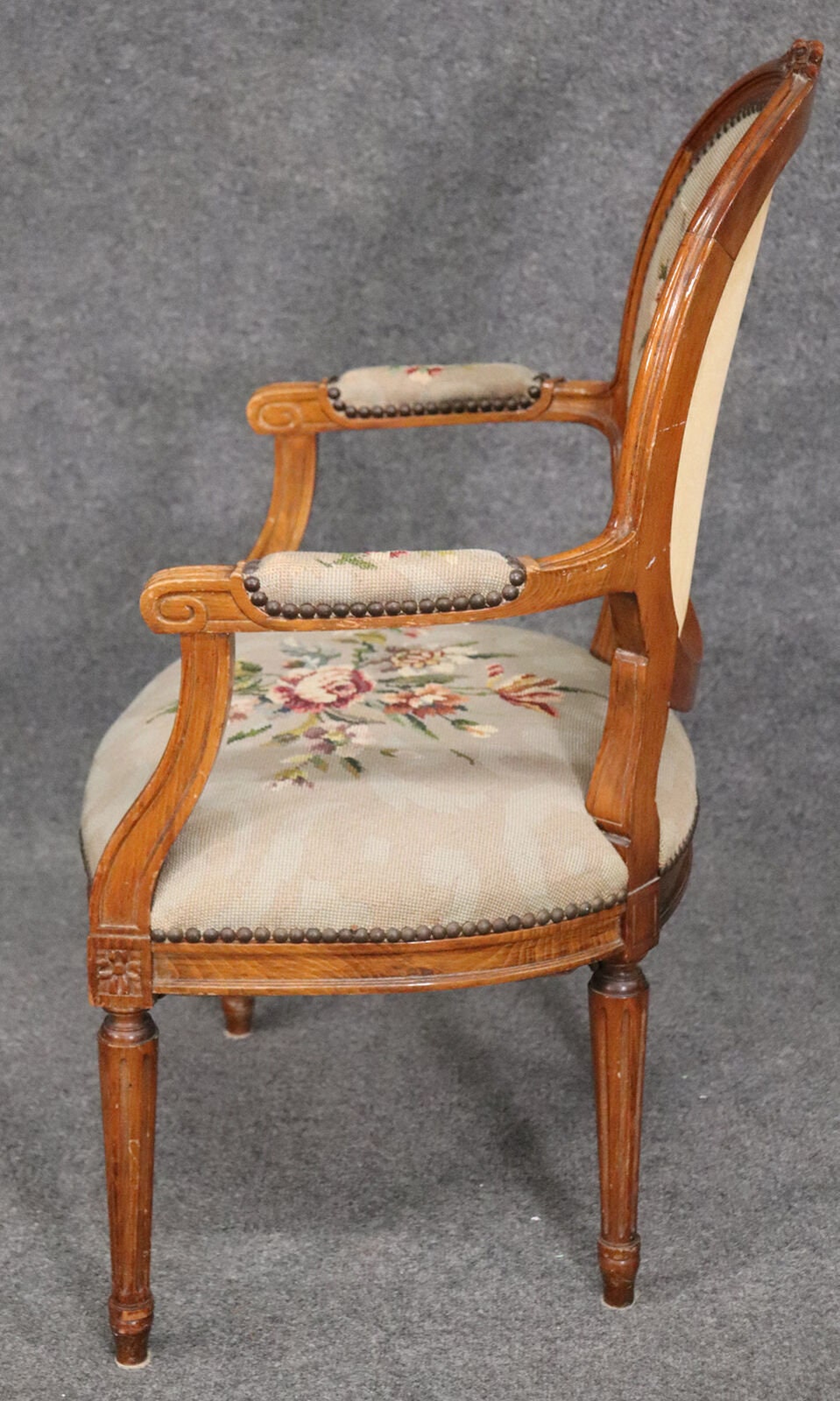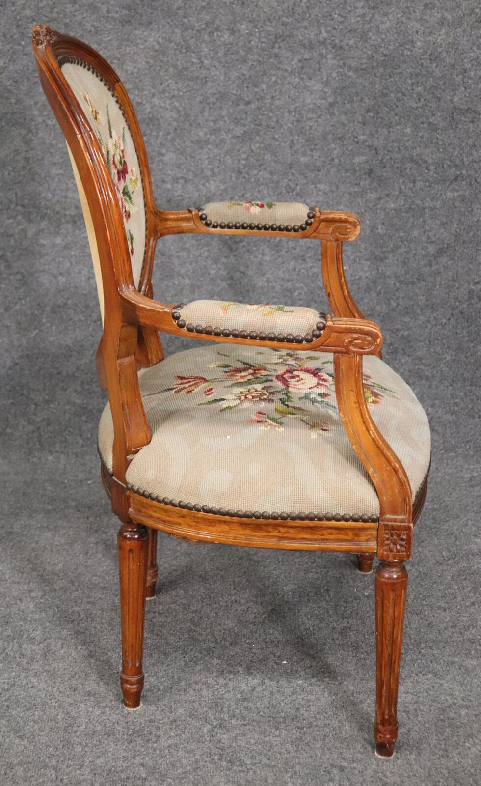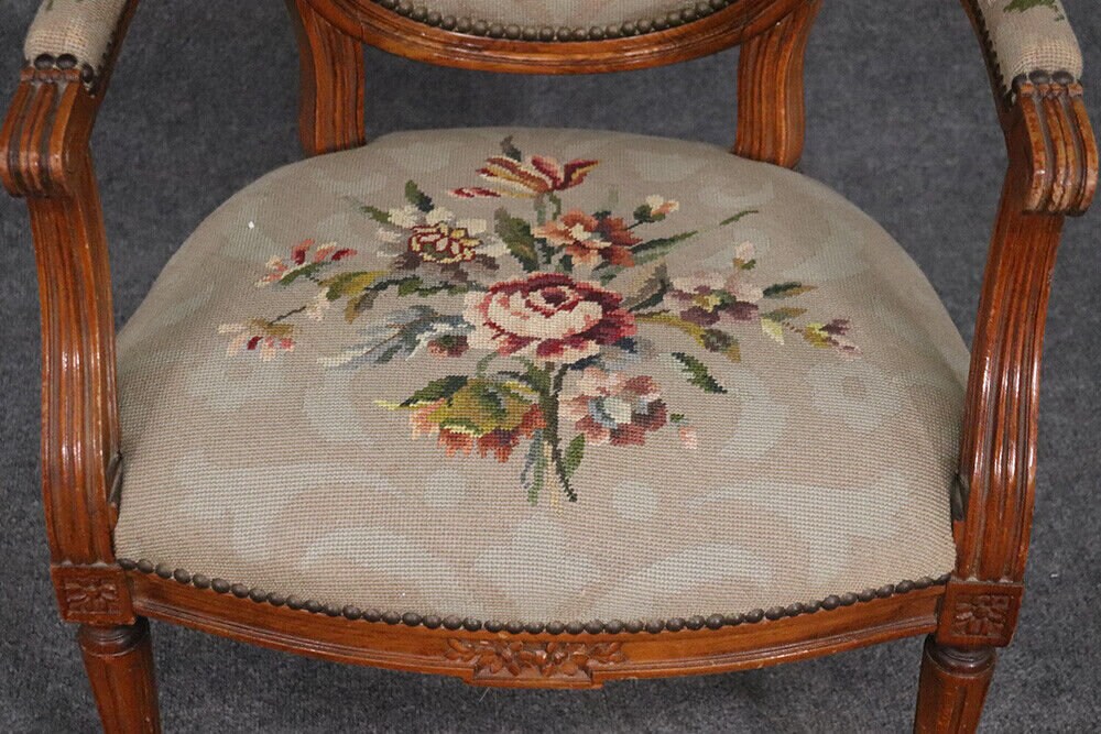 This beautiful French Louis XVI carved walnut fauteuil armchair is made of the highest quality! The chair is in good vintage condition and has beautiful needlepoint upholstery. If you look at the photos provided, you will see fine attention to detail in the carved frames which is a major indication of high quality craftsmanship as well as the floral design in the upholstery. This would be a wonderful addition to your living room, office, or any room of your choosing and is bound to bring a sense of class and luxury!