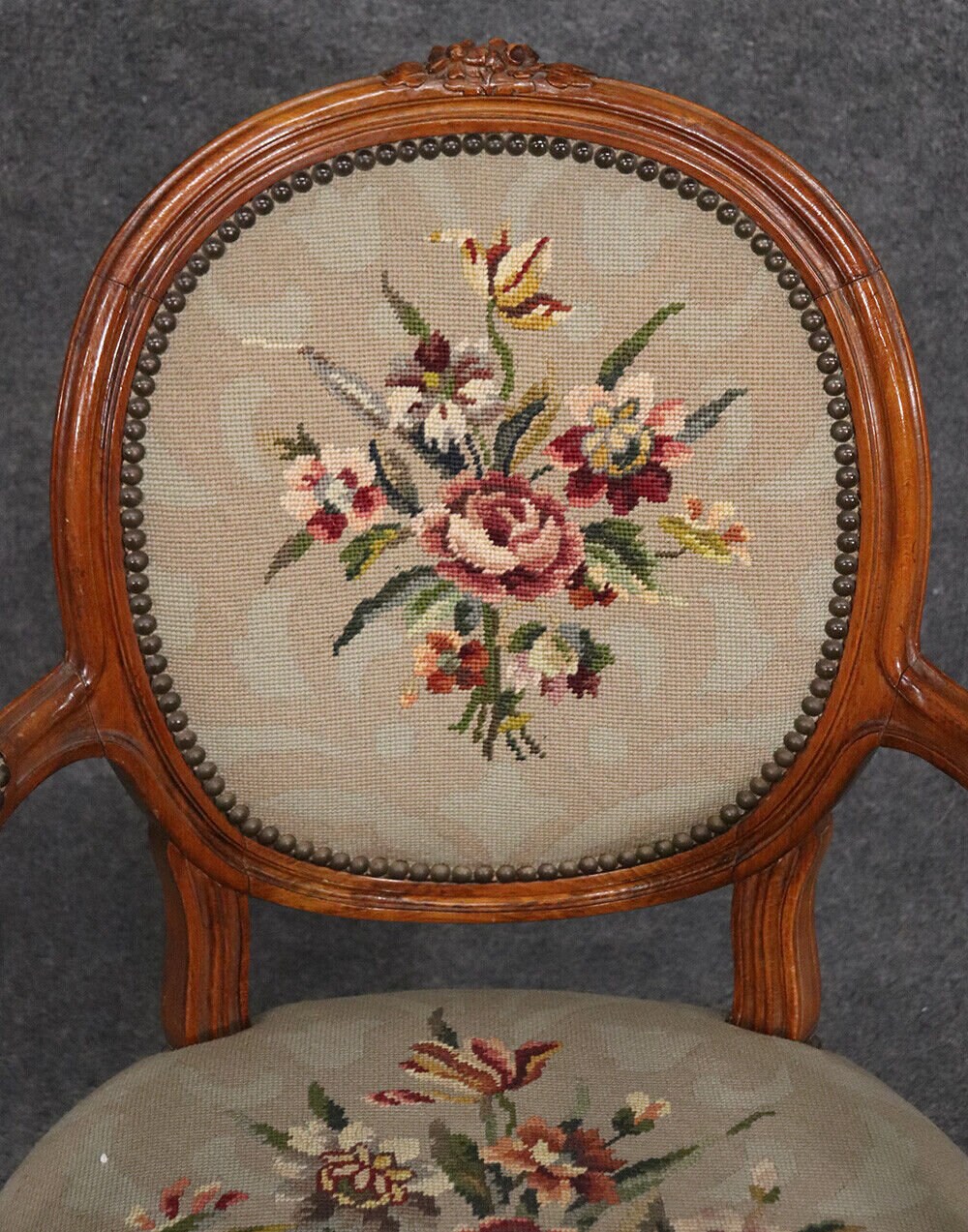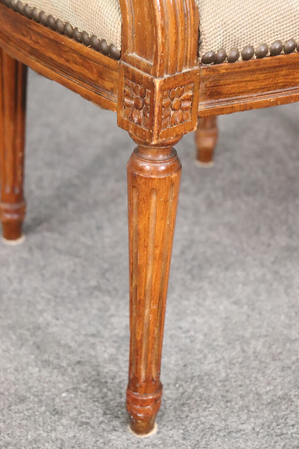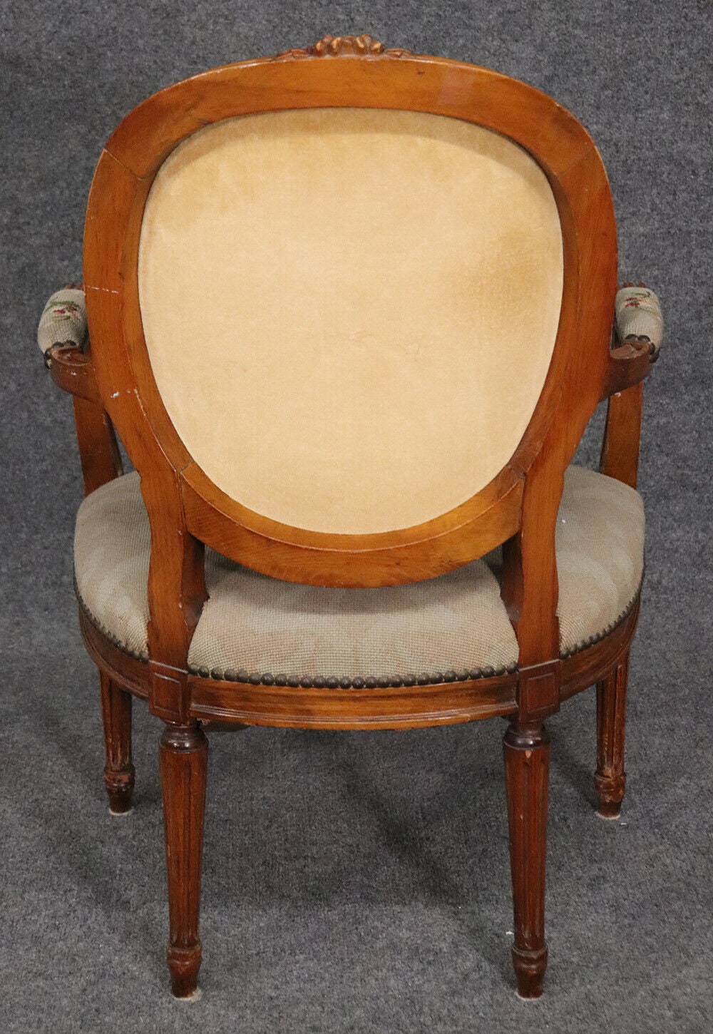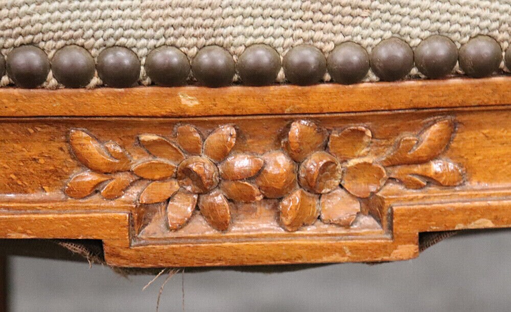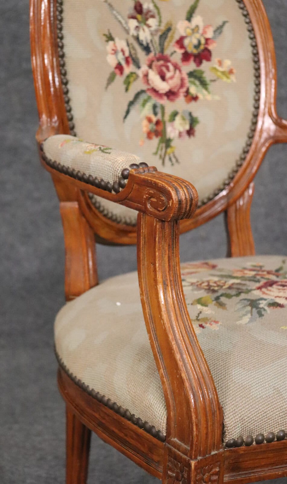 This beautiful French Louis XVI carved walnut fauteuil armchair is made of the highest quality! The chair is in good vintage condition and has beautiful needlepoint upholstery. If you look at the photos provided, you will see fine attention to detail in the carved frames which is a major indication of high quality craftsmanship as well as the floral design in the upholstery. This would be a wonderful addition to your living room, office, or any room of your choosing and is bound to bring a sense of class and luxury!