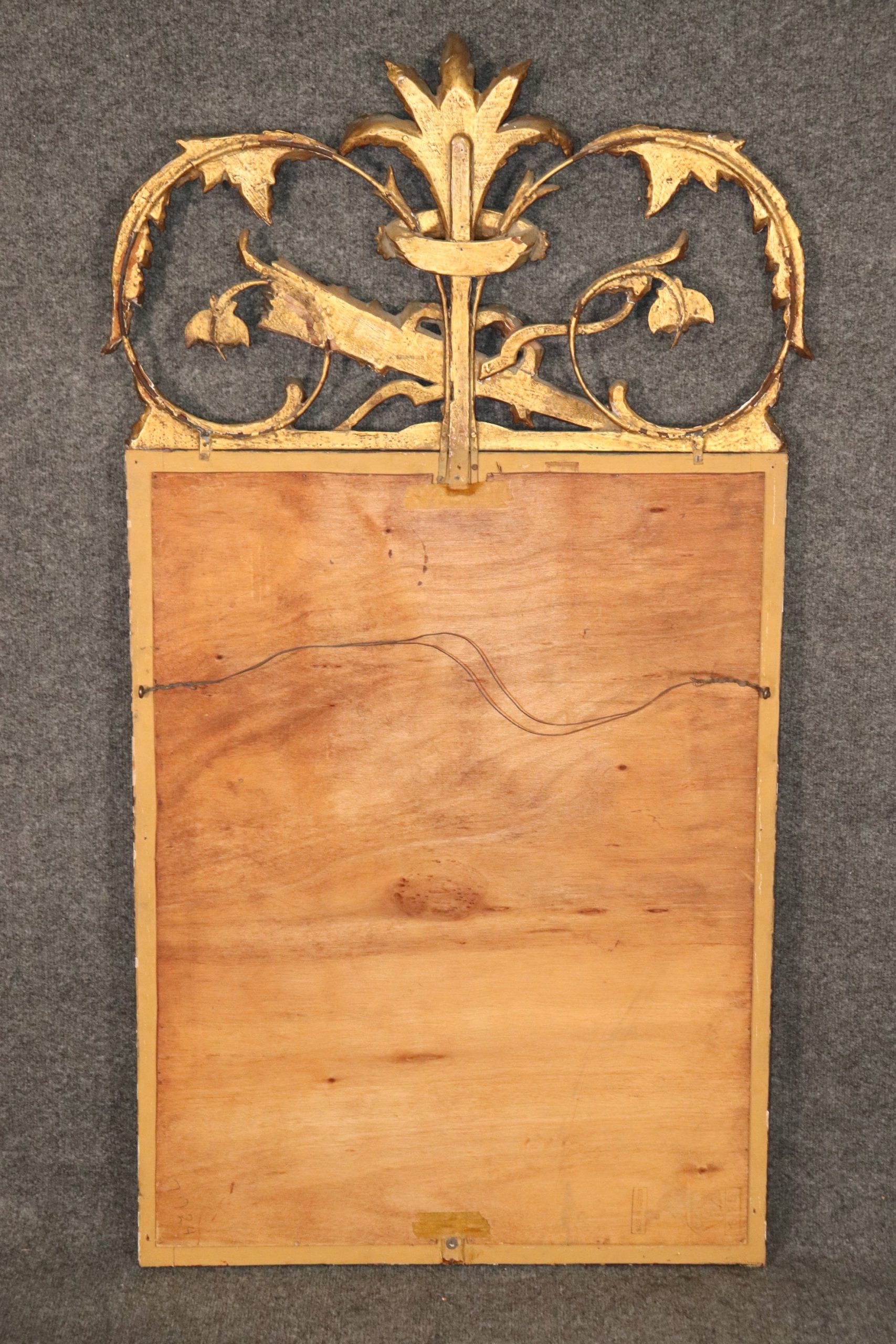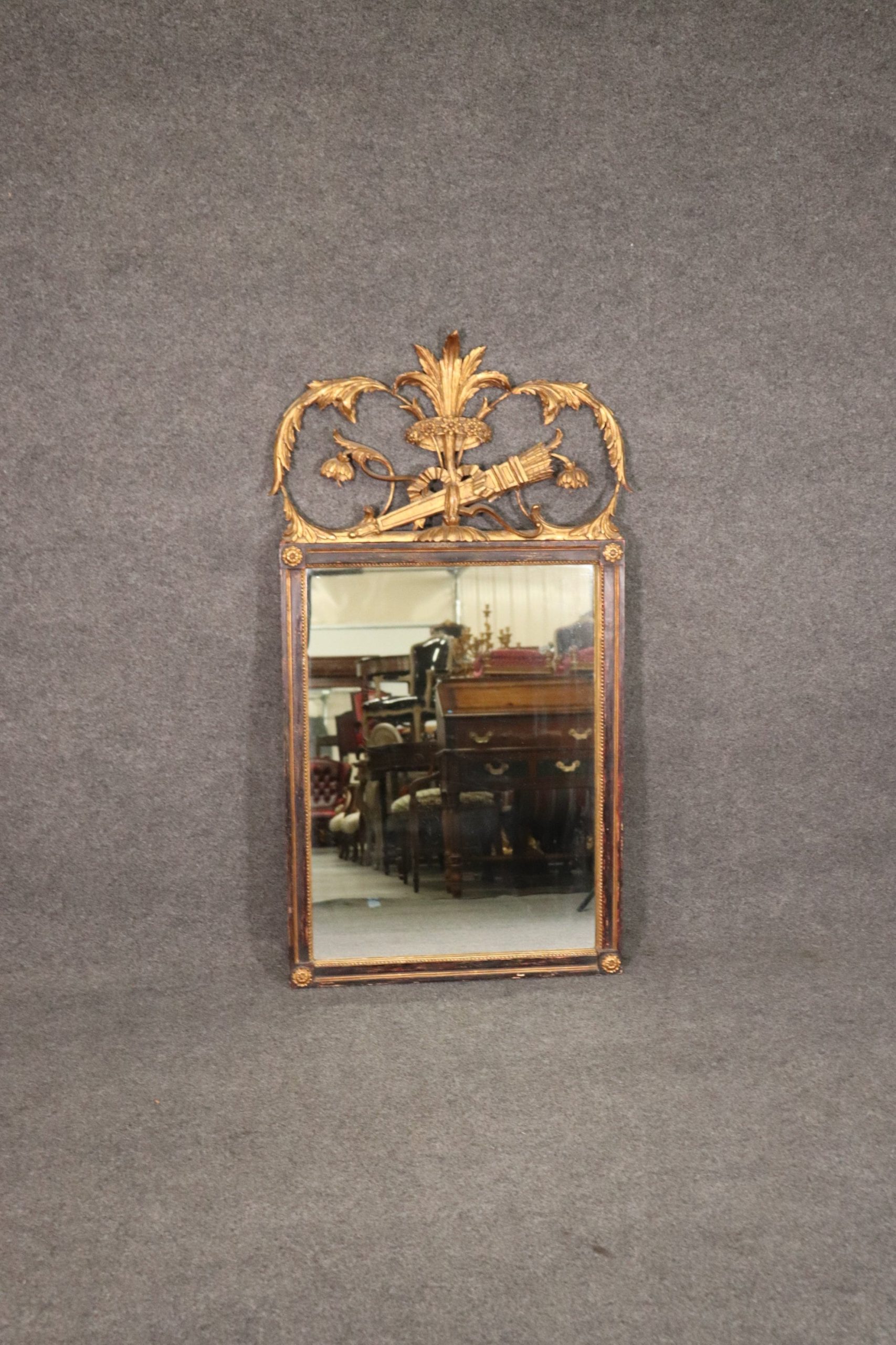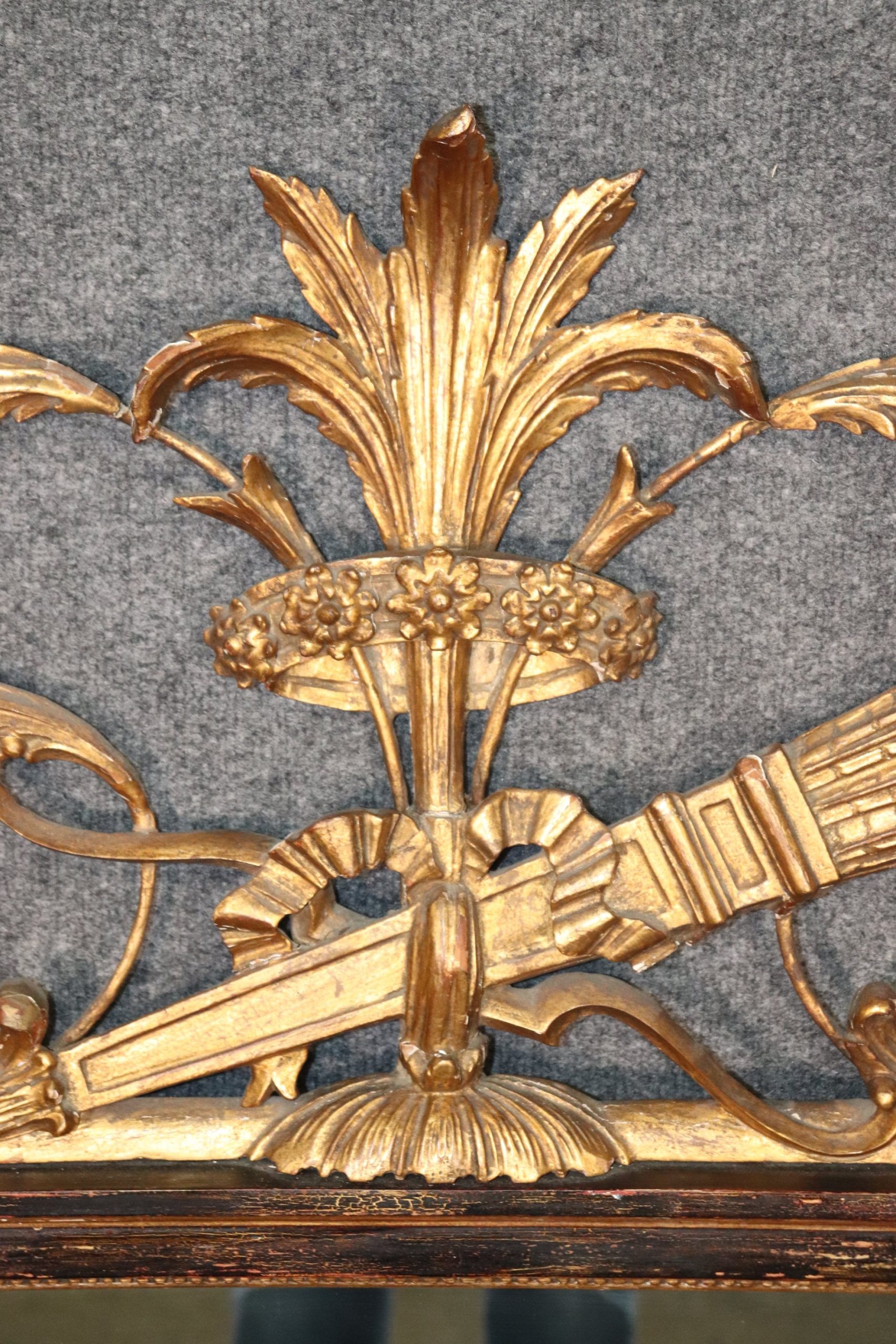 This is a gorgeous Louis XV style antique mirror designed in the French taste with a fine floral gilded motif with a quiver of arrows depicting the harvest or hunt. The mirror measures 52.25 tall x 29 wide x 1.5 inches deep and is Italian made.
