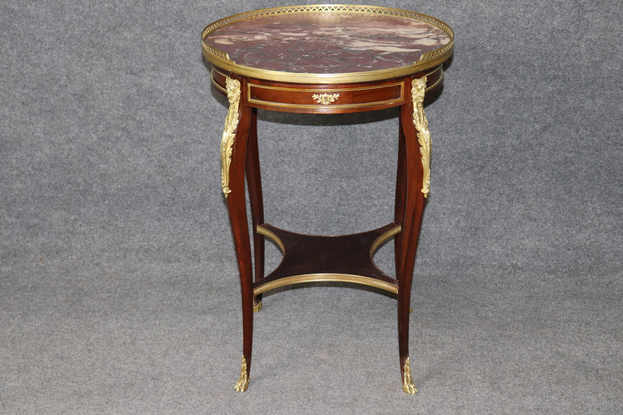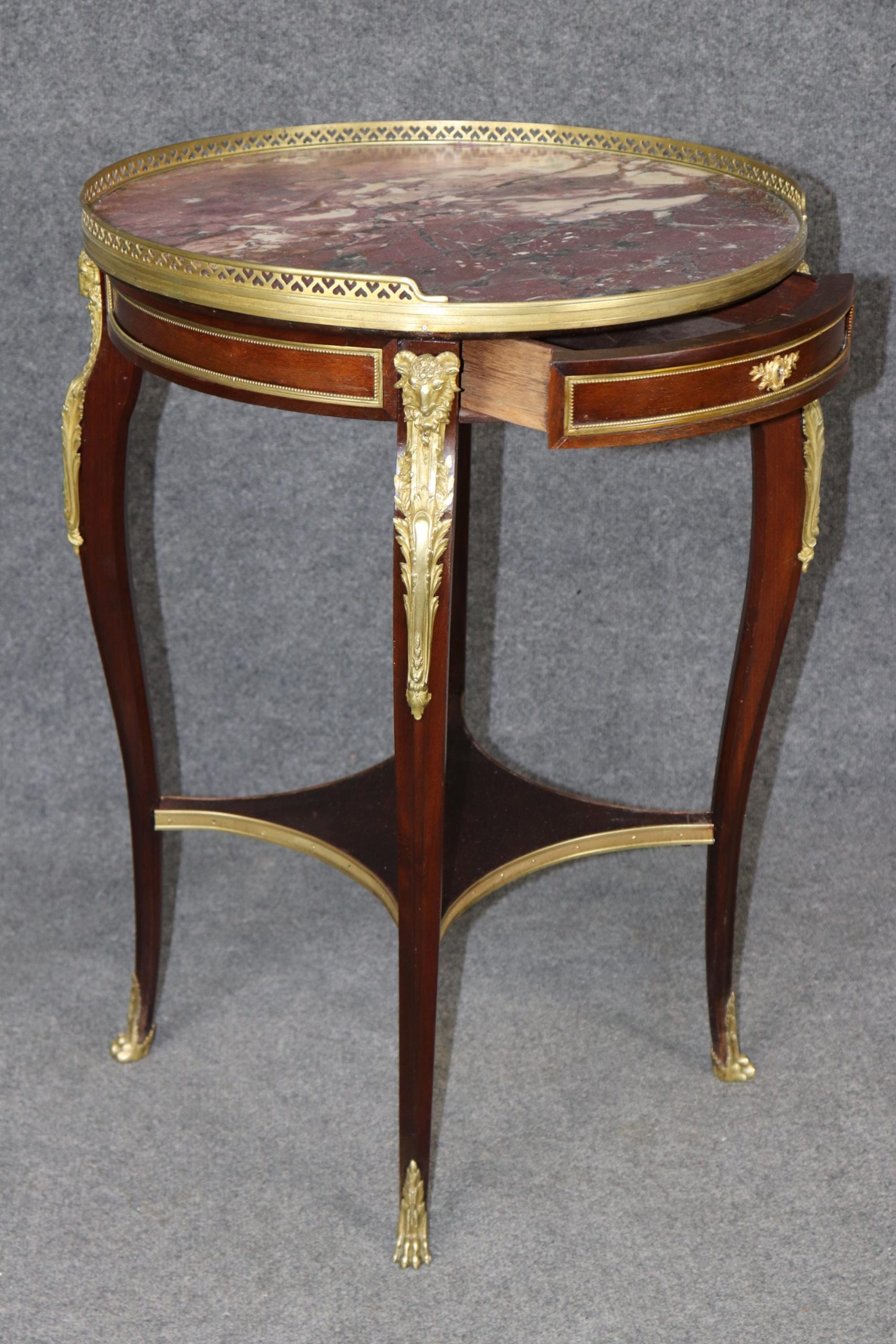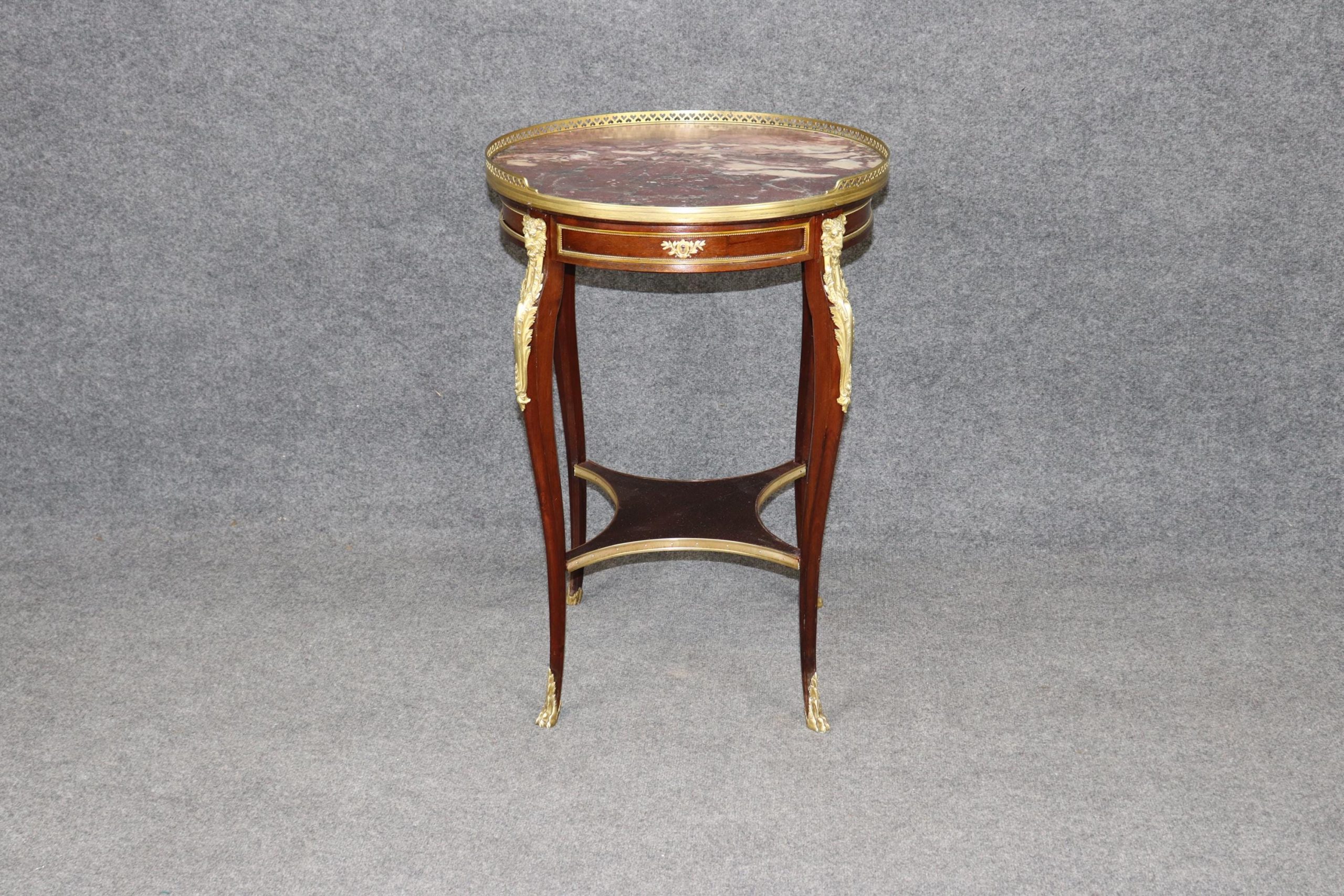 This French antique 19th Century Louis XV style bronze mounted marble top end table, by Millet, is made of the highest quality and is truly remarkable! Maison Millet was a Parisian furniture firm founded in 1853 by Théodore Millet that was active until 1918. It specialized in high-quality 18th-century style reproductions, particularly Louis XV and XVI, but also created modern-style pieces. This exceptional table will most definitely be a conversation starter! If you look at the photos provided, you can see the attention to detail in the bronze mounts. This table can be paired with just about any style you may already have in your home or place of choosing! This piece gives off an overwhelming sense of character and luxury and tells its own story as people catch themselves staring at it! Antique furniture and vintage pieces have stood the test of time and this desk is no exception. With its quality materials and great craftsmanship this is bound to last you and your family for many years to come. The table is in good antique condition with an old but professional repair to the marble, minor surface scratches as well as some minor tarnishing to the bronze mounts, as to be expected with an item of this age! Otherwise good condition.