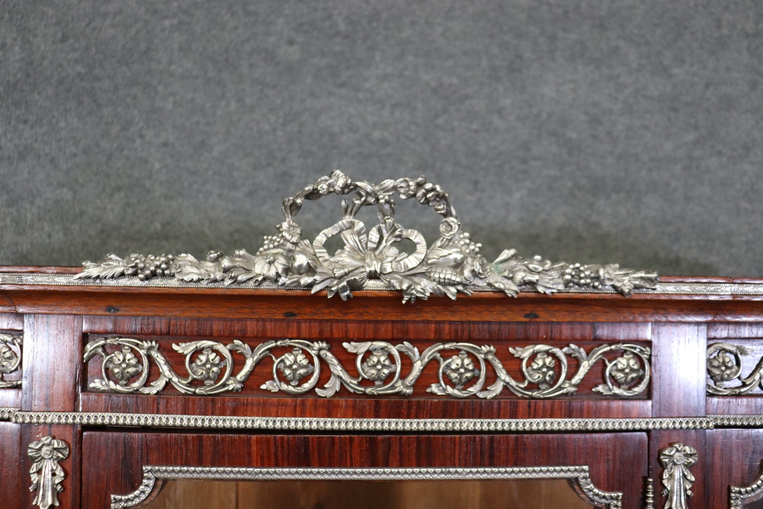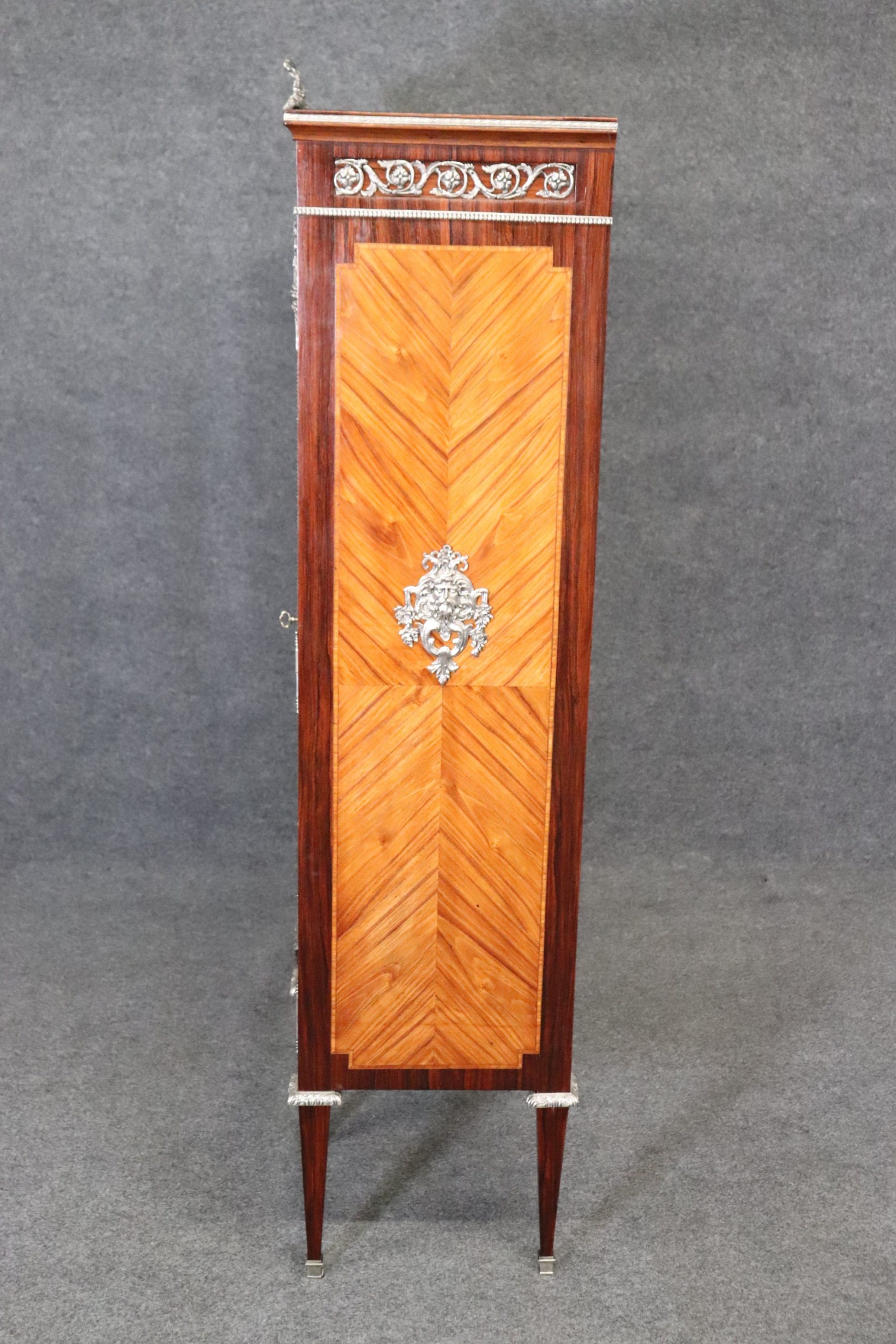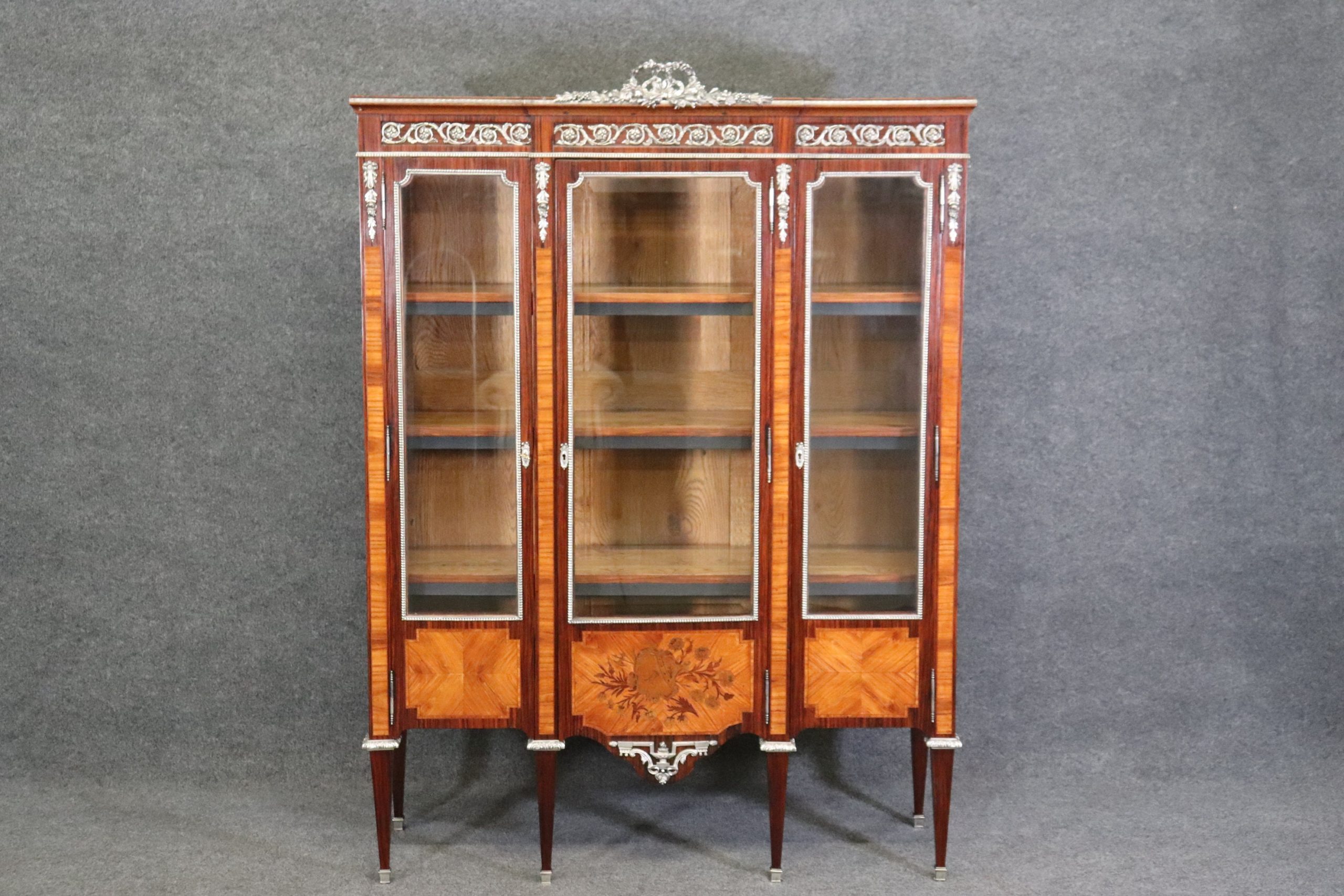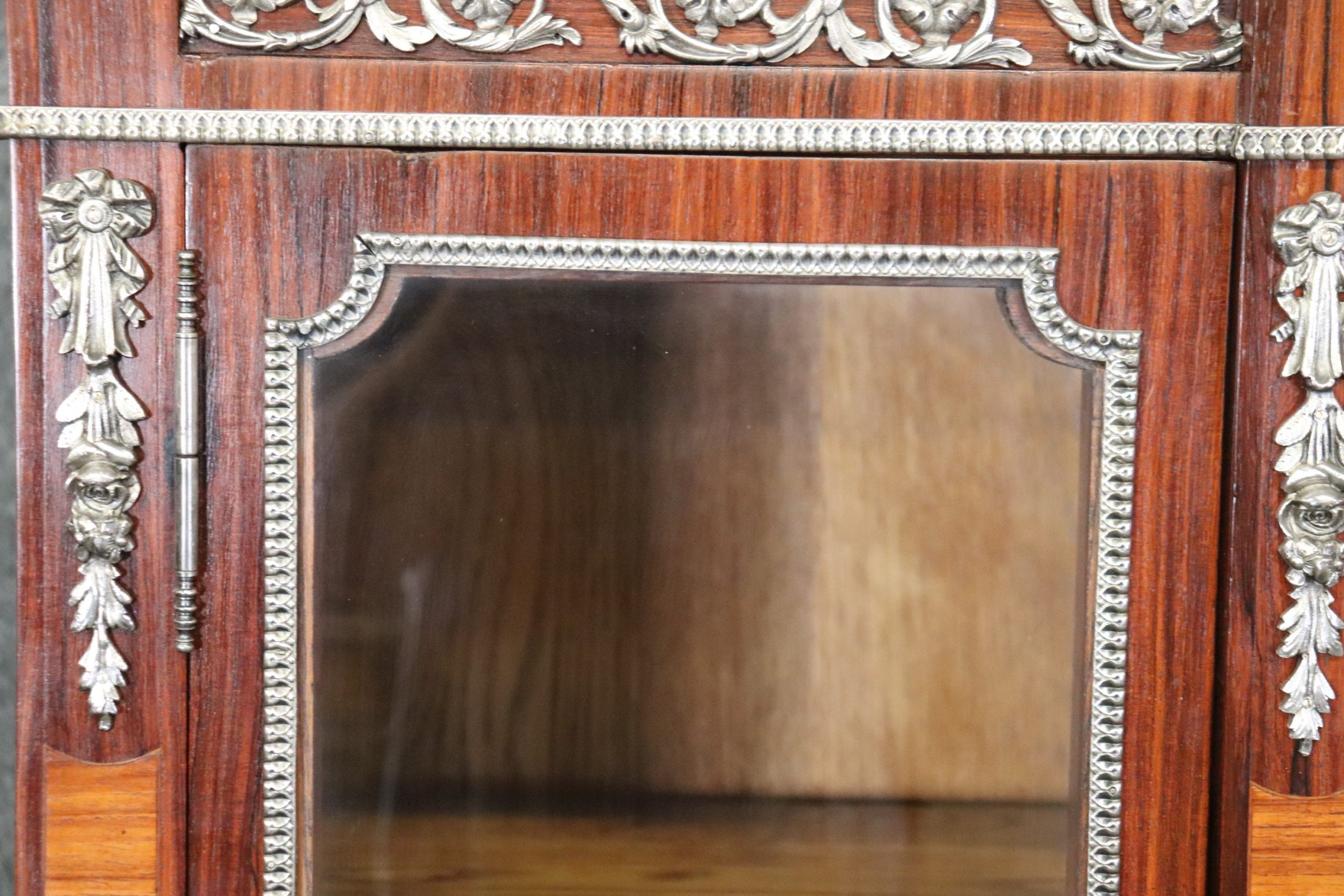 This French silver ormolu mounted 19th century Louis XVI style inlaid vitrine curio cabinet is of the highest quality! If you look at the photos provided, you can see the detail in the beautiful inlay as well as the silver mounts and accents! This piece is perfect for any home or office and will bring a sense of luxury and class into your place of choosing! The cabinet is also lighted! The piece has 3 shelves perfect for show casing some of your favorite objects all while keeping them safe and out of reach! The original owner Had all of the bronze ormolu mounts covered in silver plate a process that is SUPER expensive and probably cost around $5,000- $10,000 just for the mounts to be plated. This is an investment piece that will last you and your family years to come. The piece is in good antique condition with minor surface scratches, minor finish loss, and light oxidation to metal but otherwise good condition!