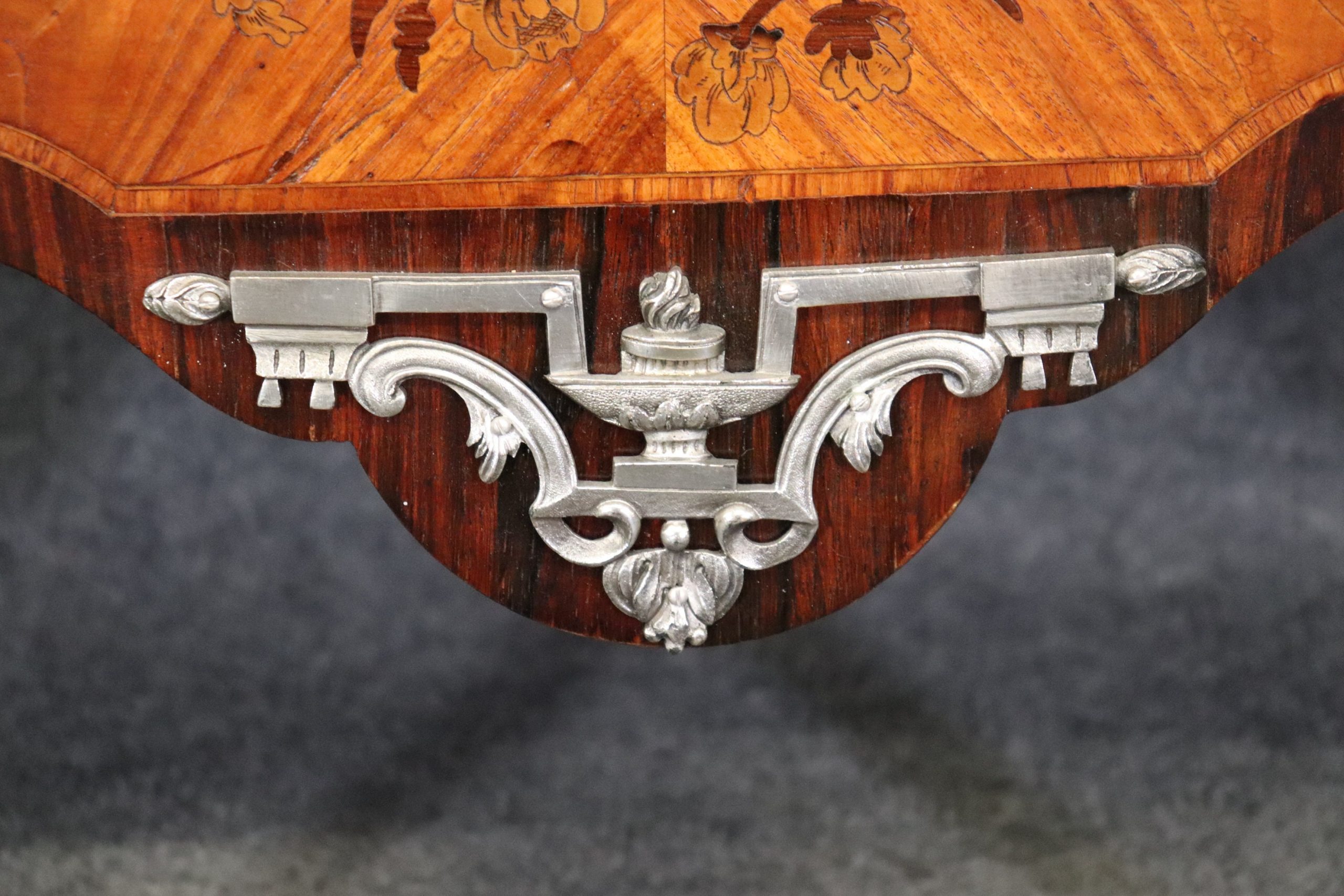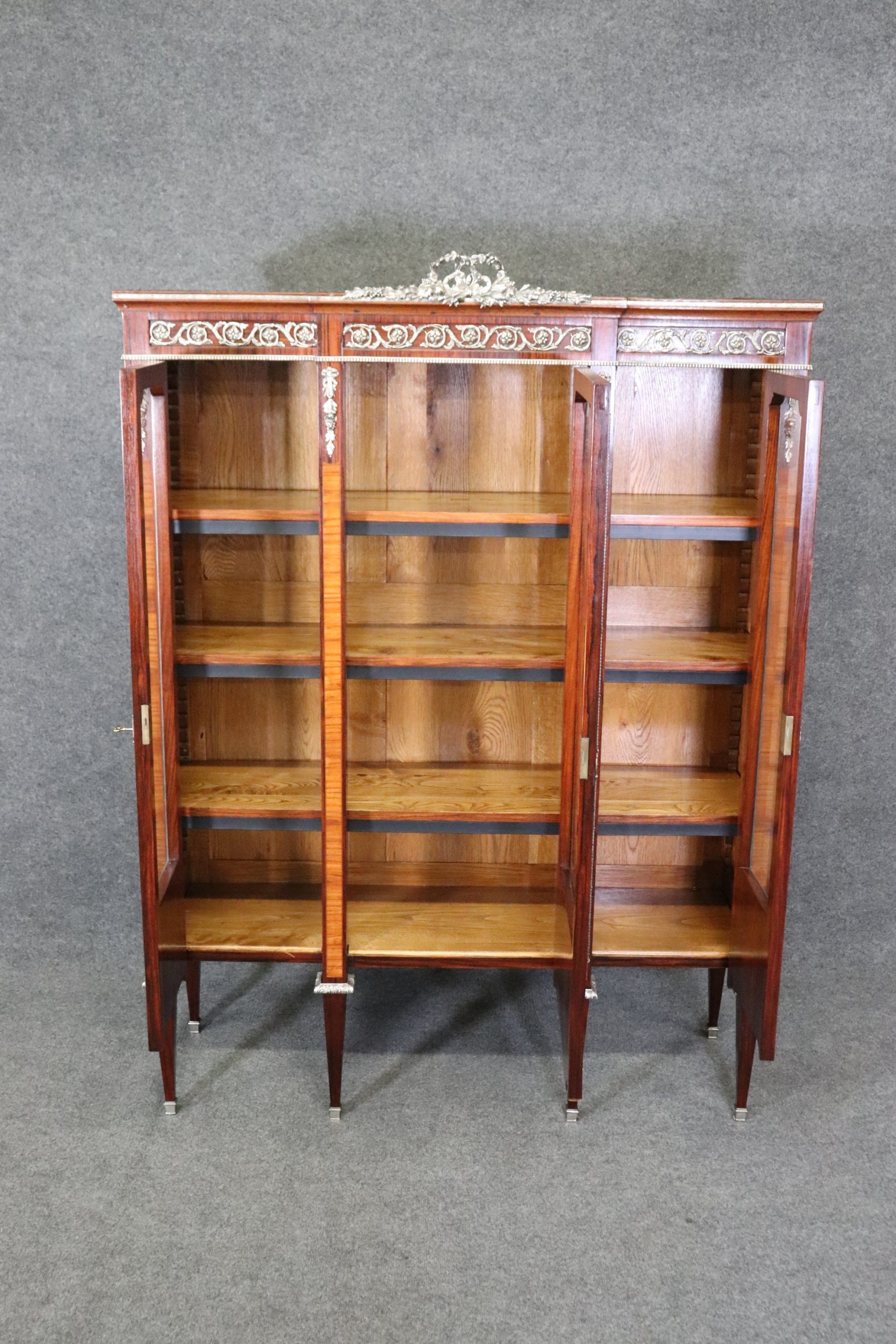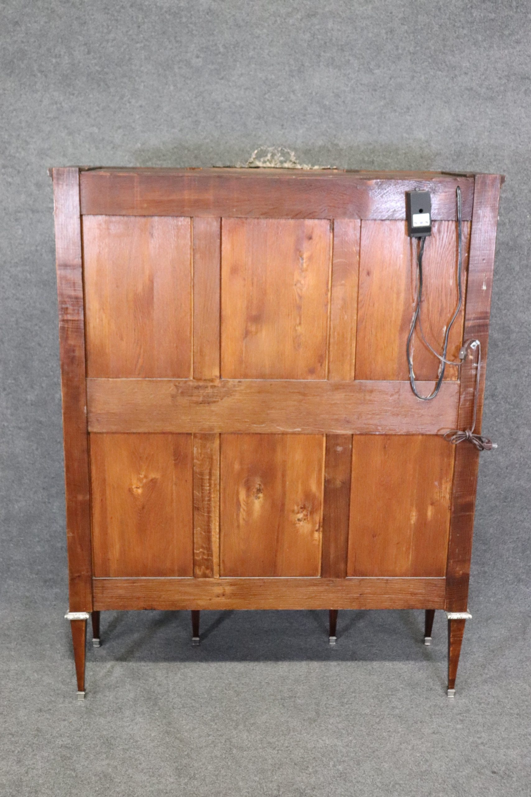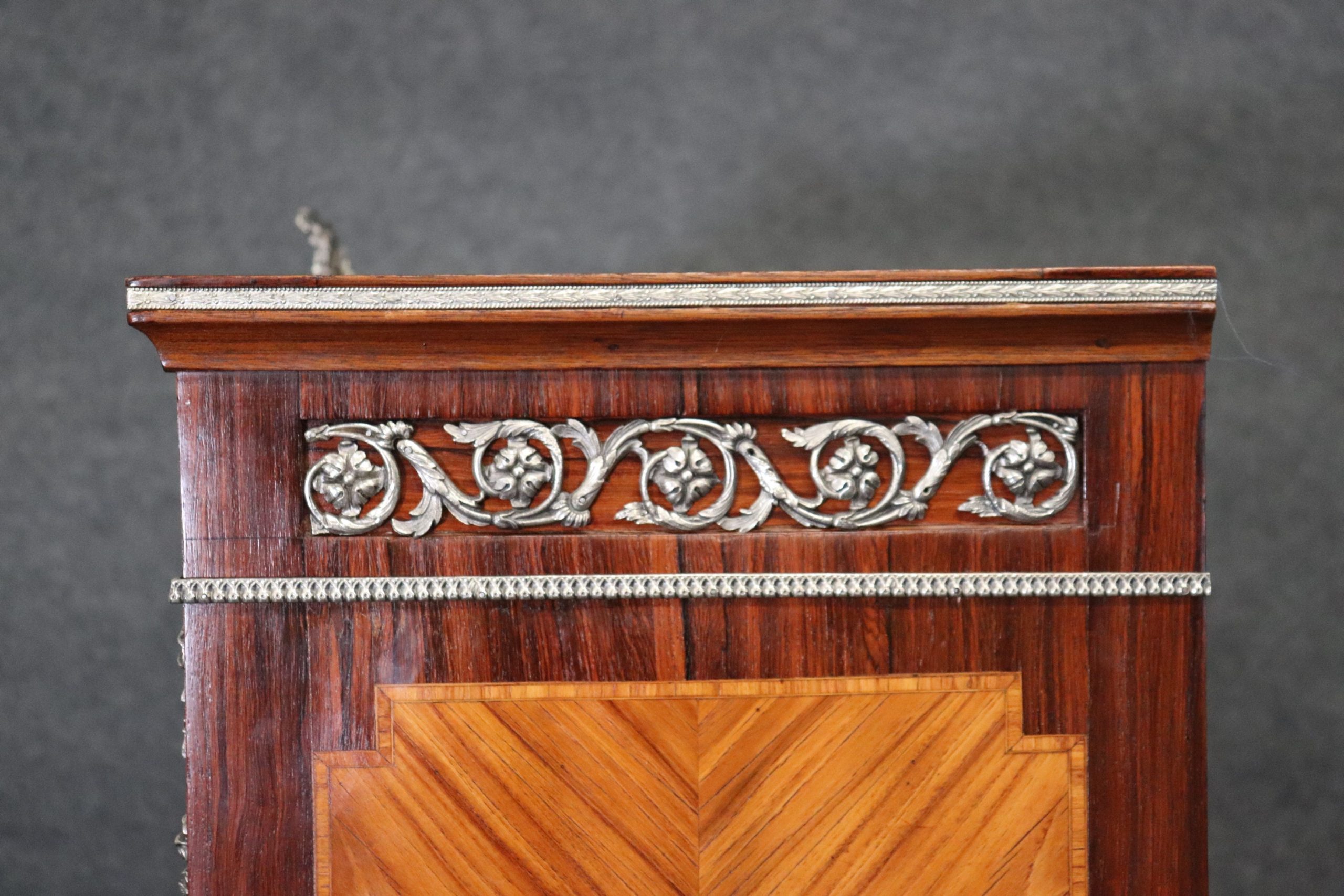 This French silver ormolu mounted 19th century Louis XVI style inlaid vitrine curio cabinet is of the highest quality! If you look at the photos provided, you can see the detail in the beautiful inlay as well as the silver mounts and accents! This piece is perfect for any home or office and will bring a sense of luxury and class into your place of choosing! The cabinet is also lighted! The piece has 3 shelves perfect for show casing some of your favorite objects all while keeping them safe and out of reach! The original owner Had all of the bronze ormolu mounts covered in silver plate a process that is SUPER expensive and probably cost around $5,000- $10,000 just for the mounts to be plated. This is an investment piece that will last you and your family years to come. The piece is in good antique condition with minor surface scratches, minor finish loss, and light oxidation to metal but otherwise good condition!