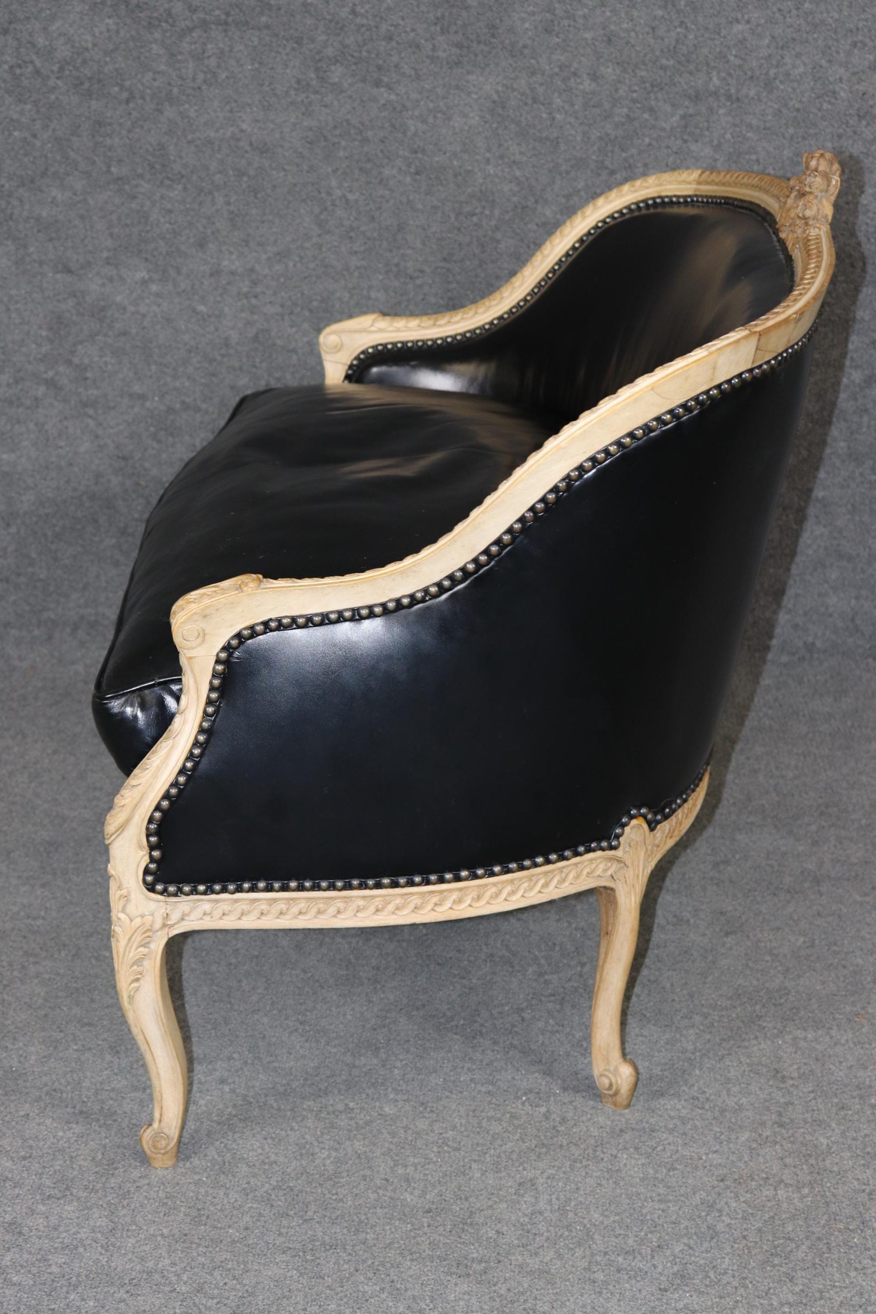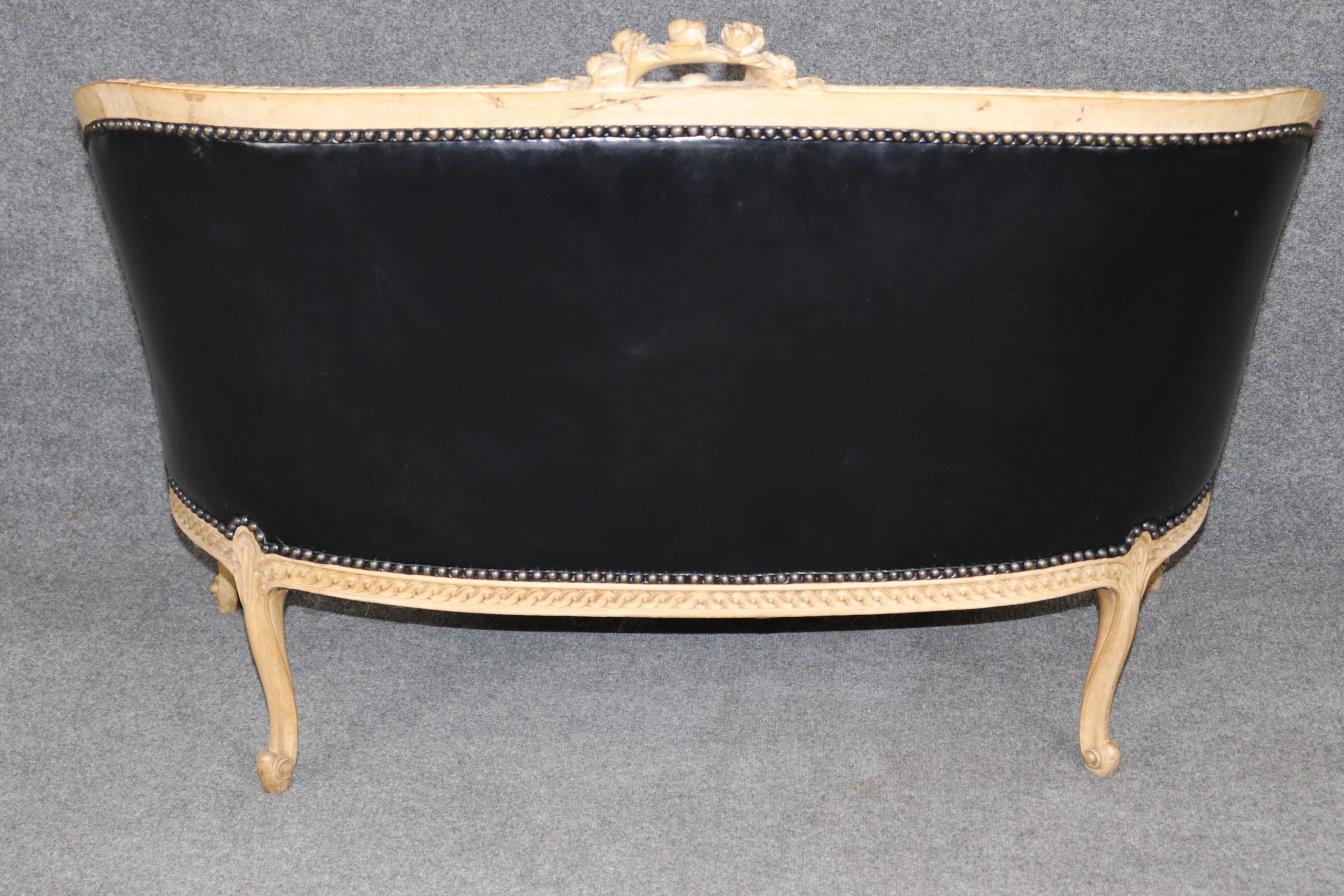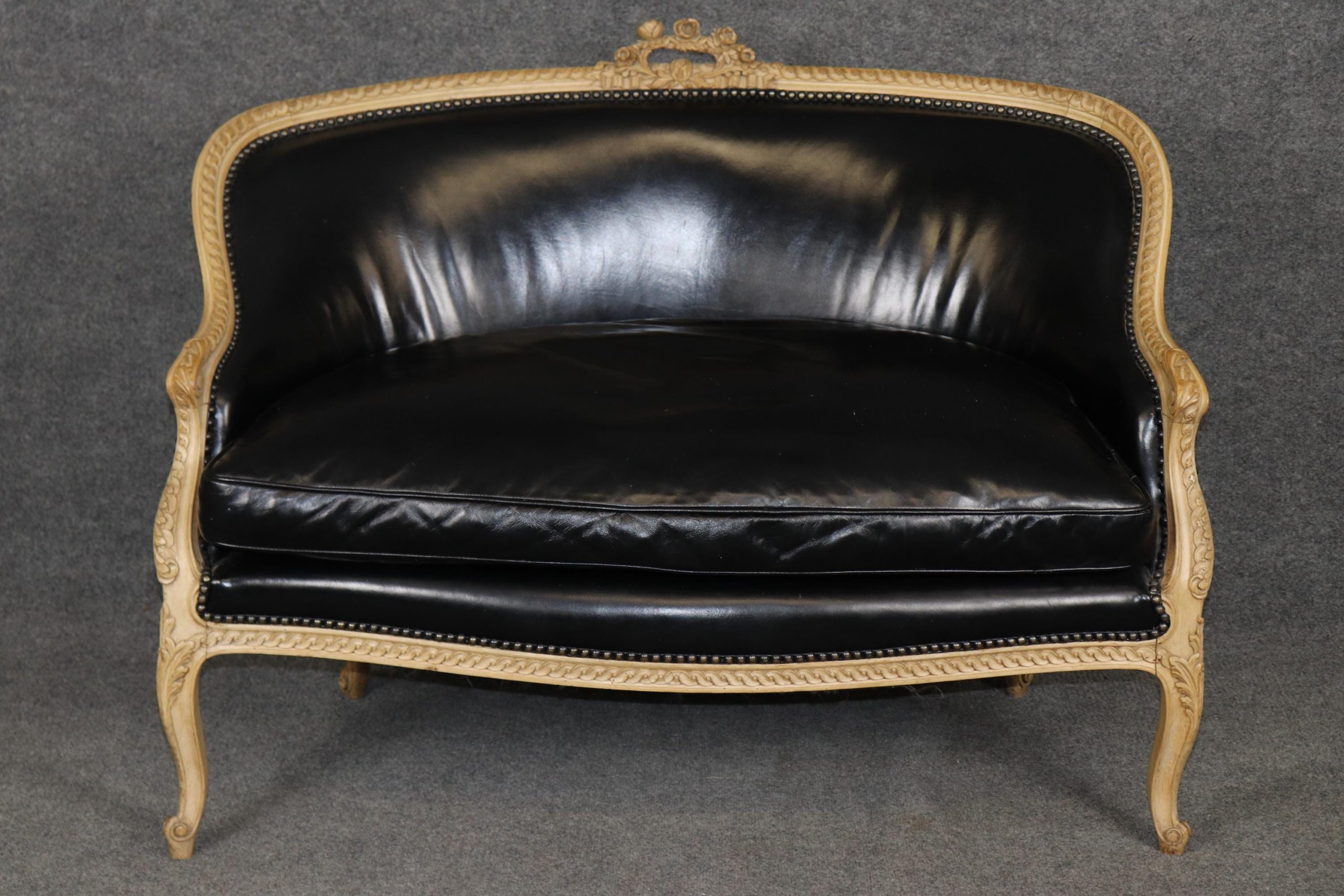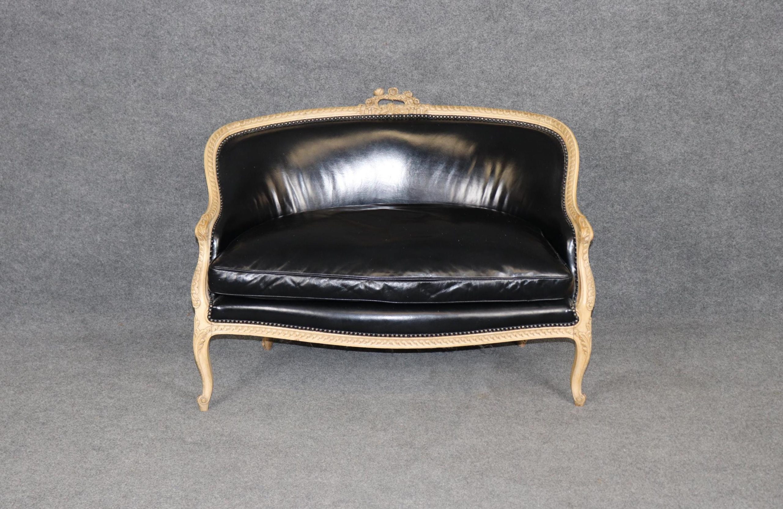 The settee is upholstered in luxurious black leather, a sophisticated complement to the warm tones of the wood. The leather adds a bold, dramatic presence while offering durability and comfort, making this piece as functional as it is beautiful. Its gently curved back, scrolled arms, and cabriole legs embody the graceful lines of the Louis XV Rococo style, while the sturdy construction ensures it remains a versatile seating option for everyday use.