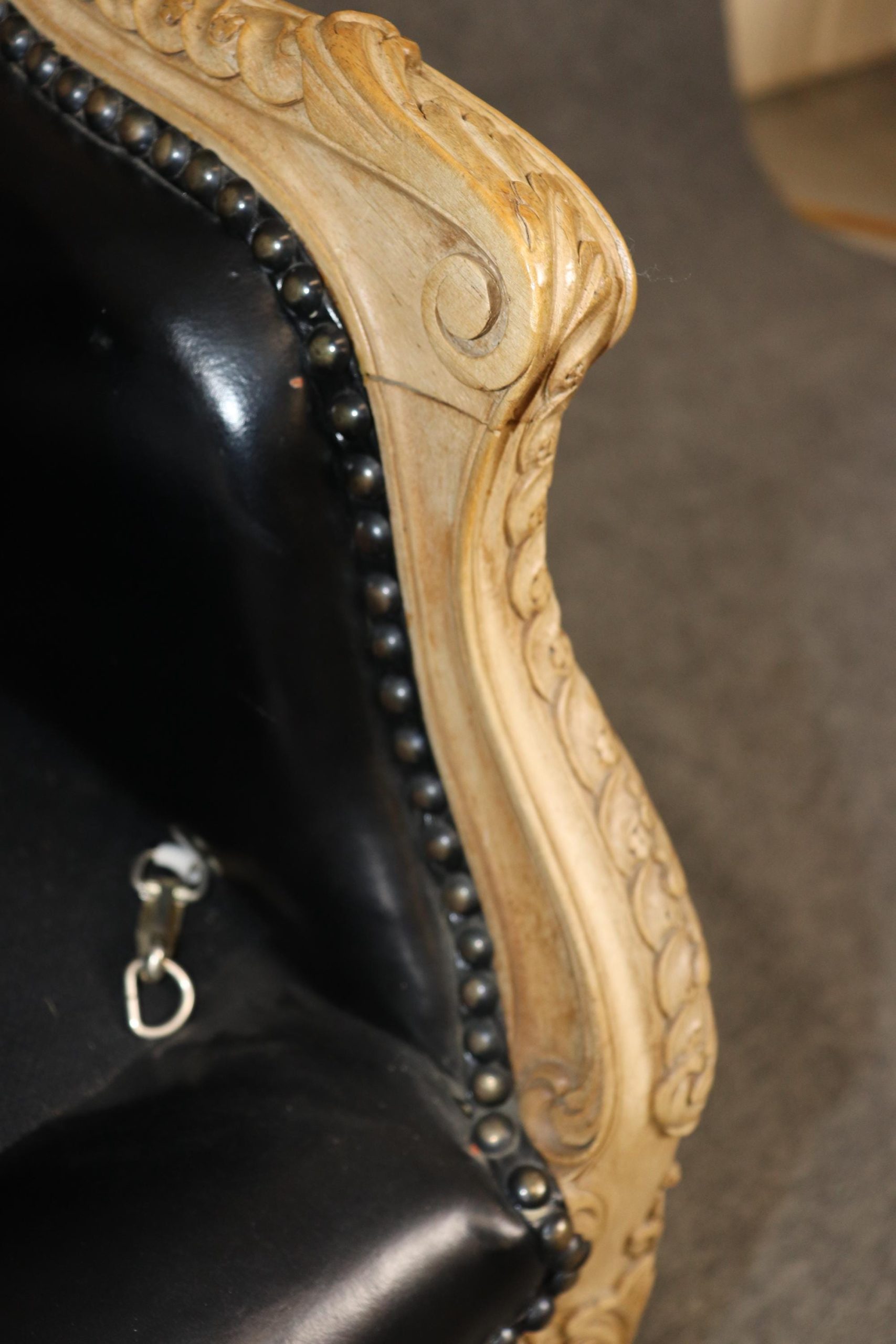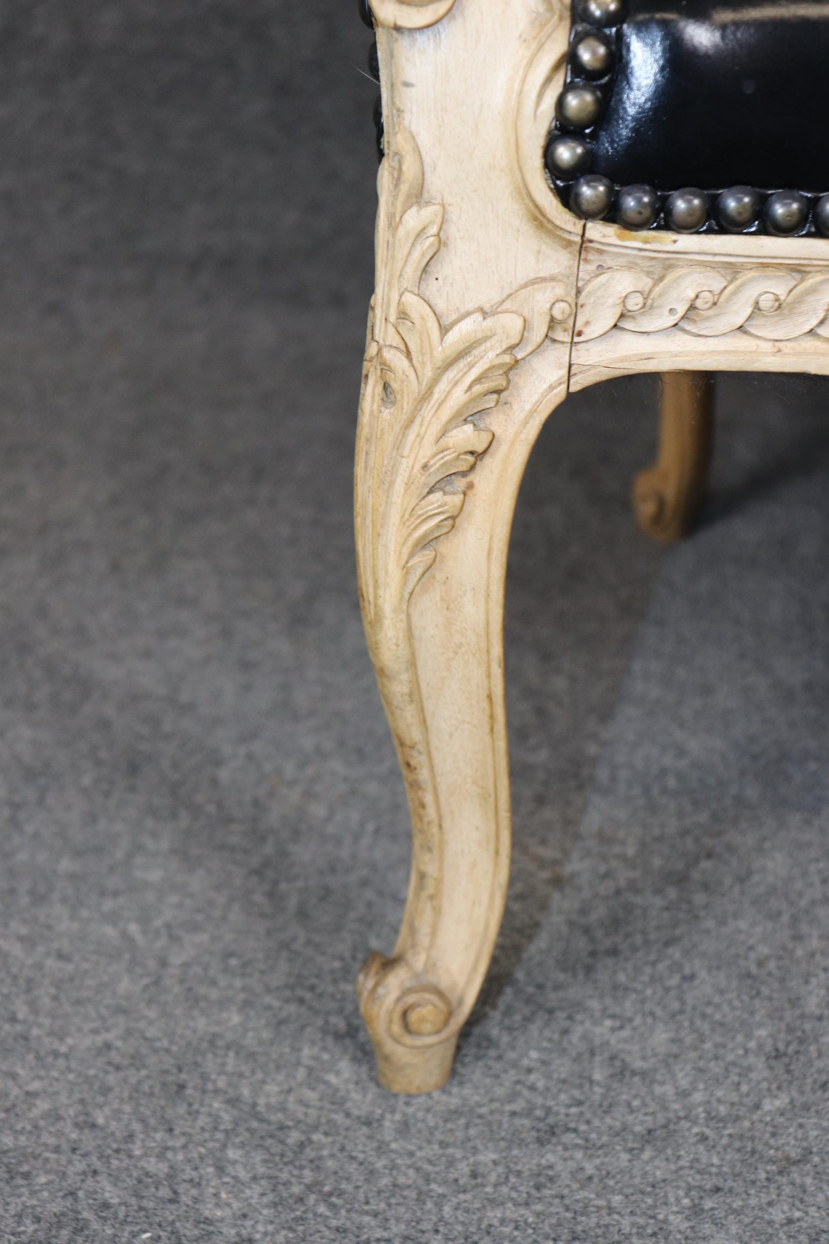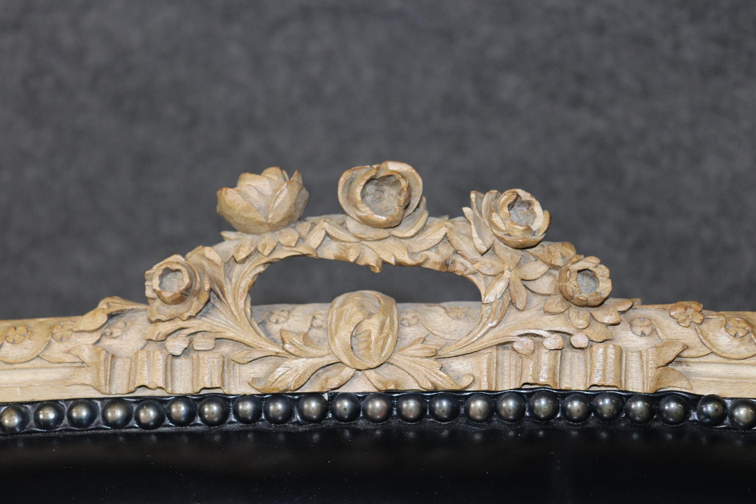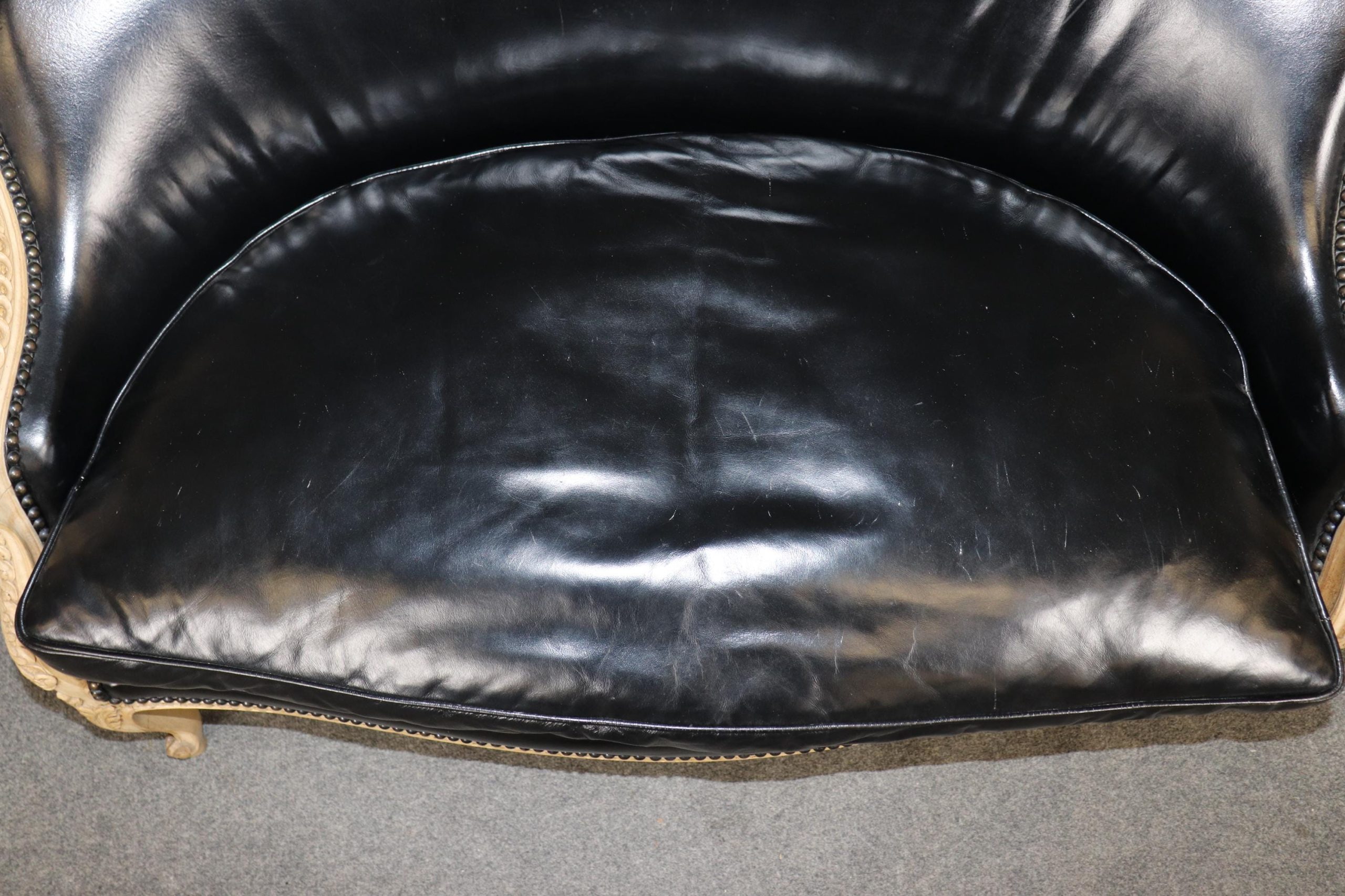The settee is upholstered in luxurious black leather, a sophisticated complement to the warm tones of the wood. The leather adds a bold, dramatic presence while offering durability and comfort, making this piece as functional as it is beautiful. Its gently curved back, scrolled arms, and cabriole legs embody the graceful lines of the Louis XV Rococo style, while the sturdy construction ensures it remains a versatile seating option for everyday use.