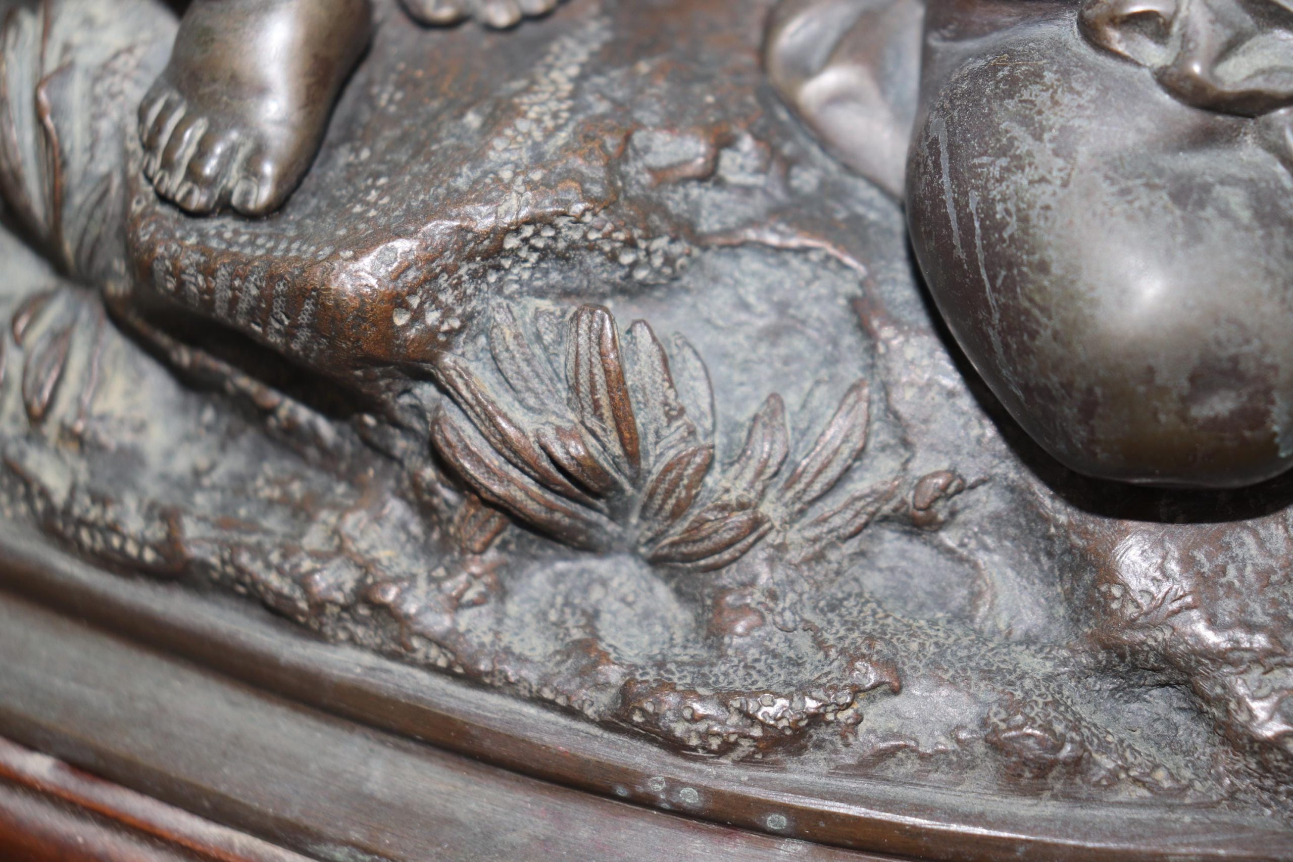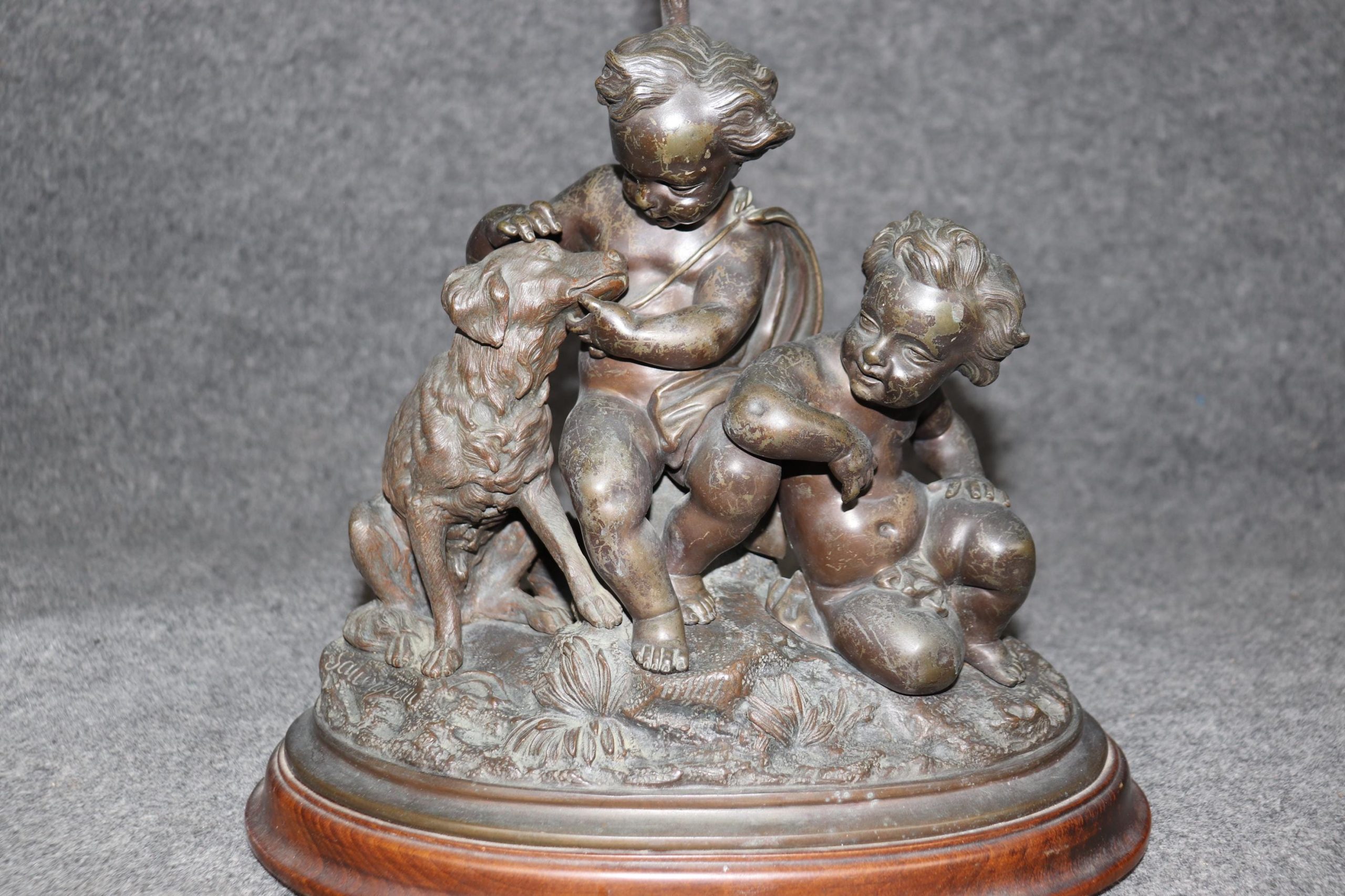 This stunning late 19th-century bronze lamp, signed by the celebrated French sculptor Louis Sauvageau, is a quintessential example of the opulence and artistry of the Louis XV style. The lamp features three charming cherub figures, skillfully cast in patinated bronze, perched gracefully on a carved walnut base adorned with a brass or bronze lap rod behind the sculpture which is attached to the wood base.