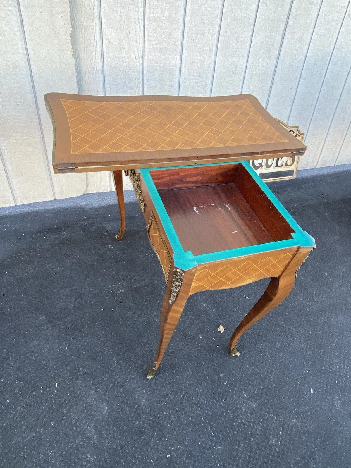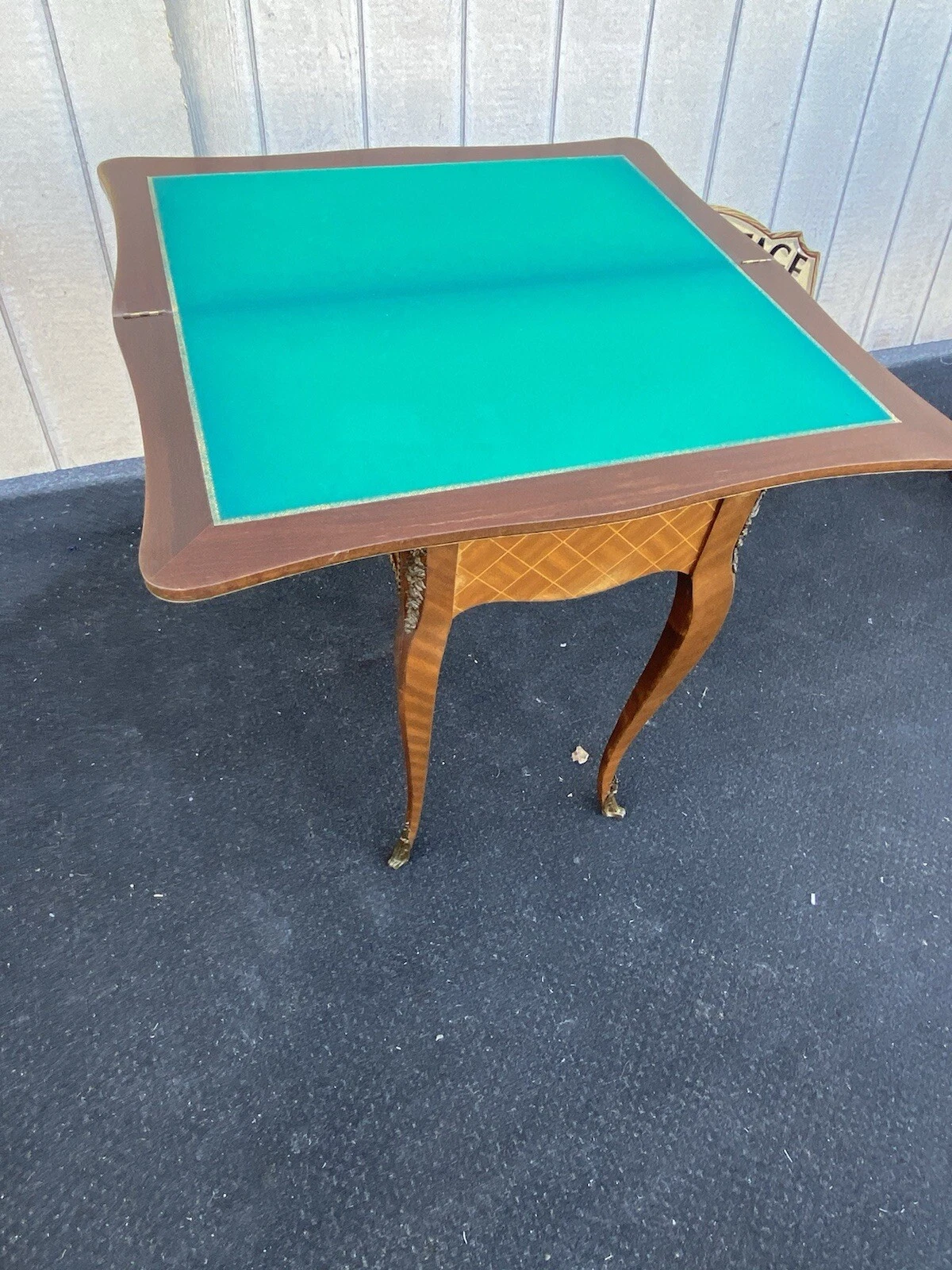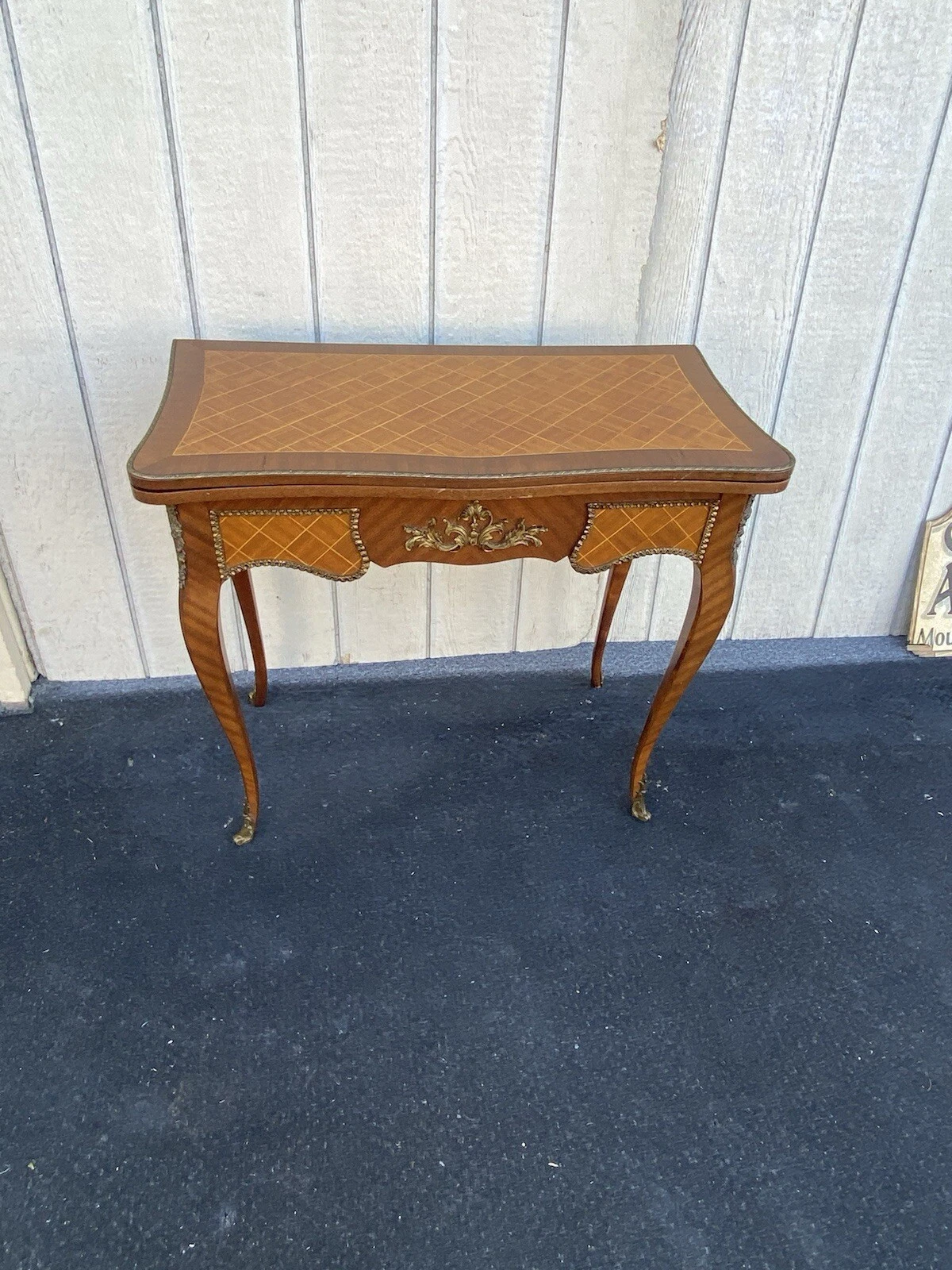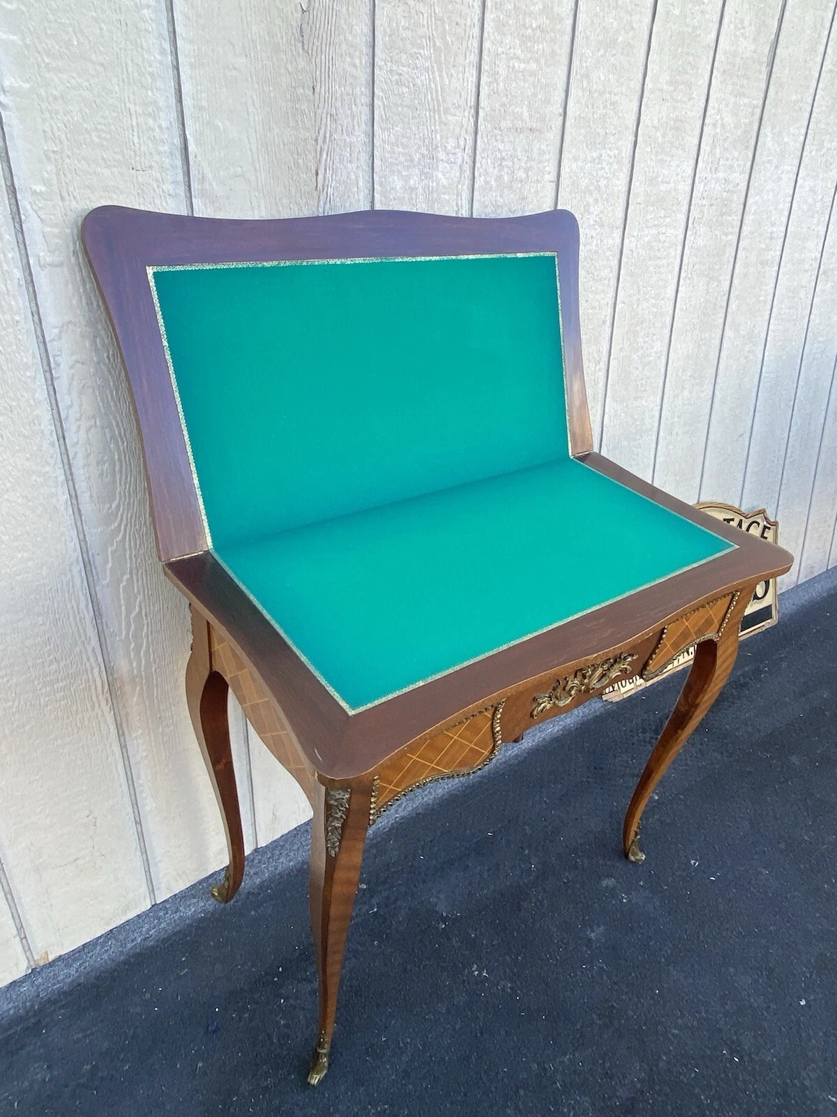 This charming French Country Louis XV flip-top game table effortlessly marries elegance and functionality, making it a delightful addition to any gathering space. Crafted with care, its rich wood finish and intricate bronze ormolu accents evoke the timeless craftsmanship of the post-war period, inviting stories and laughter around its surface. When opened, the table reveals a spacious top perfect for card games or cozy dinners, while its compact design allows for easy storage when not in use. A true conversation starter, this piece embodies the warmth and joy of family gatherings, reflecting our commitment to quality and tradition.