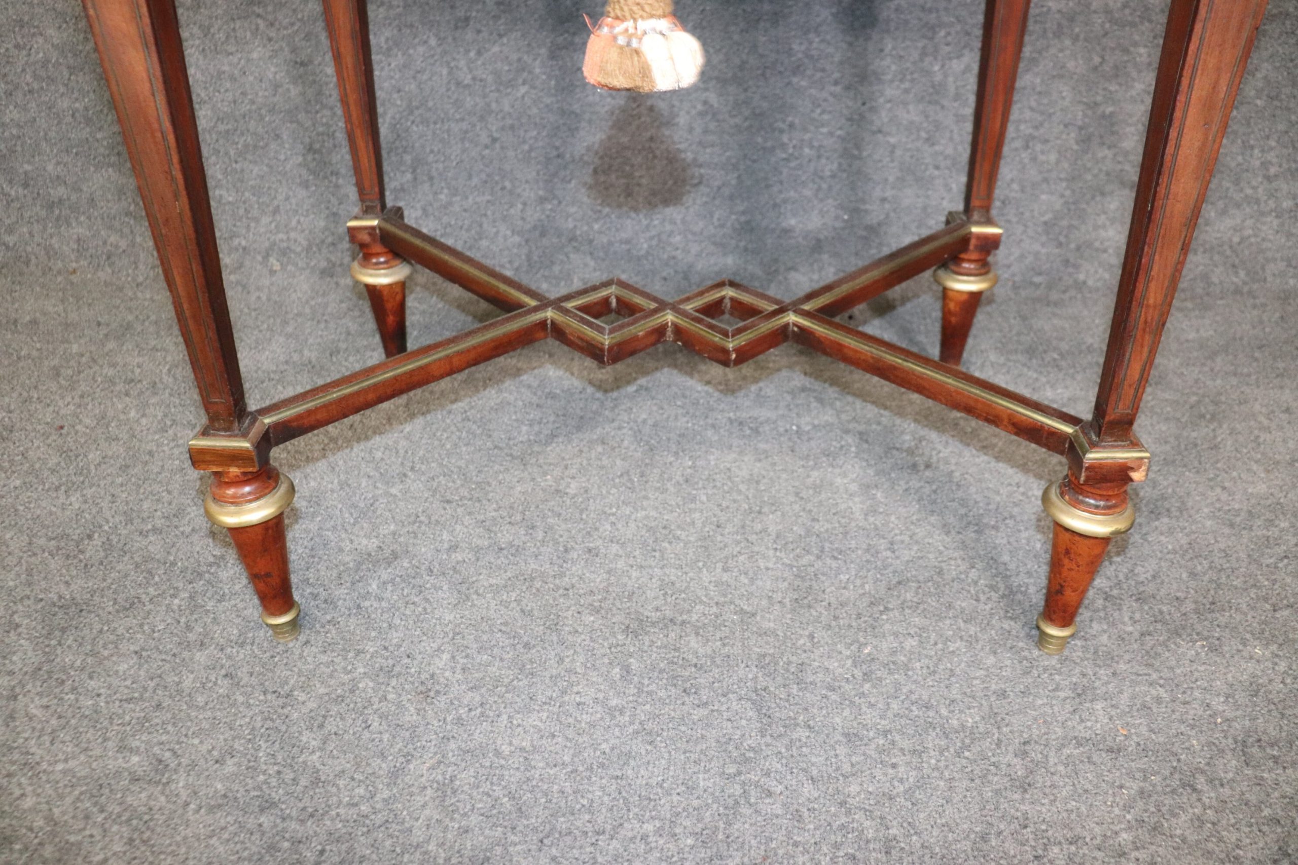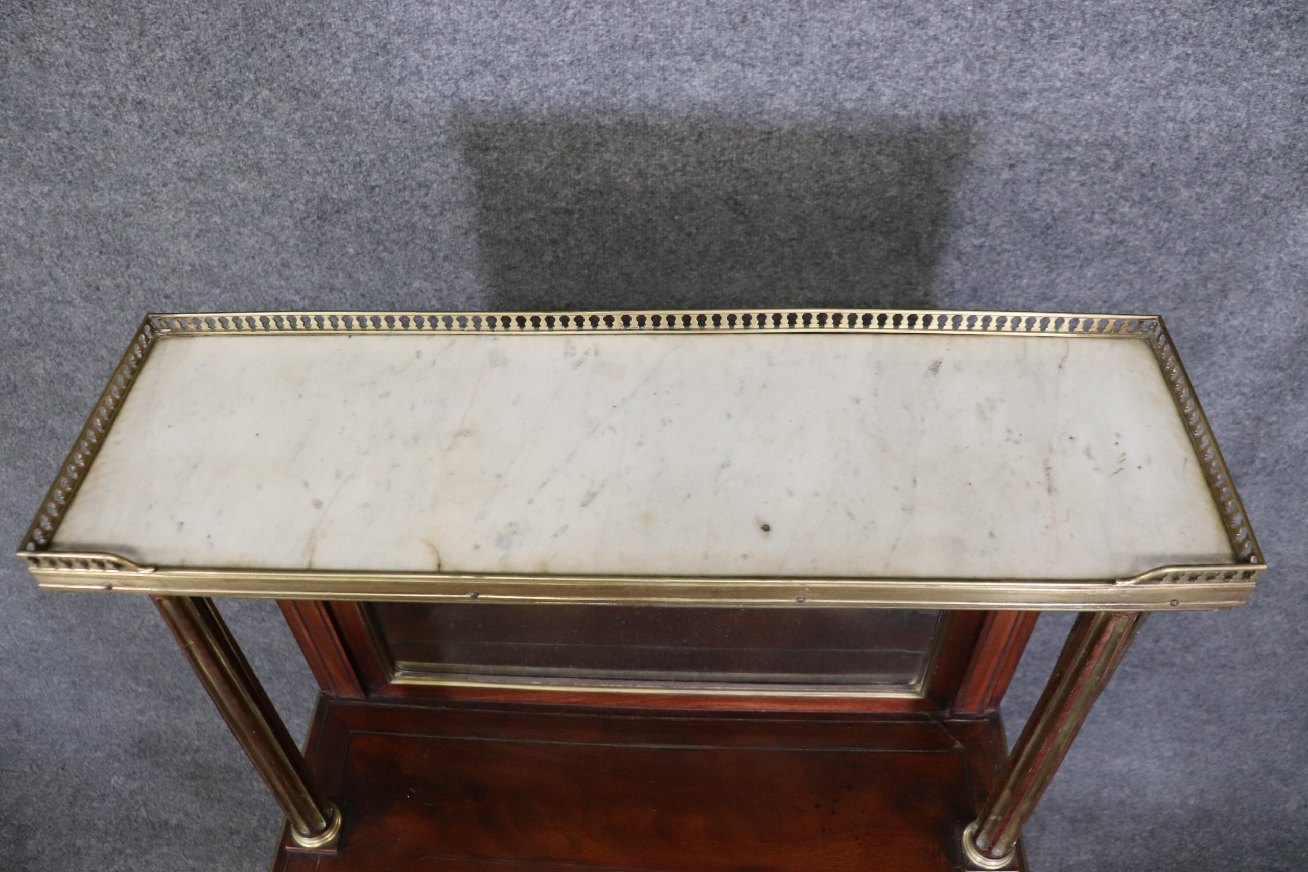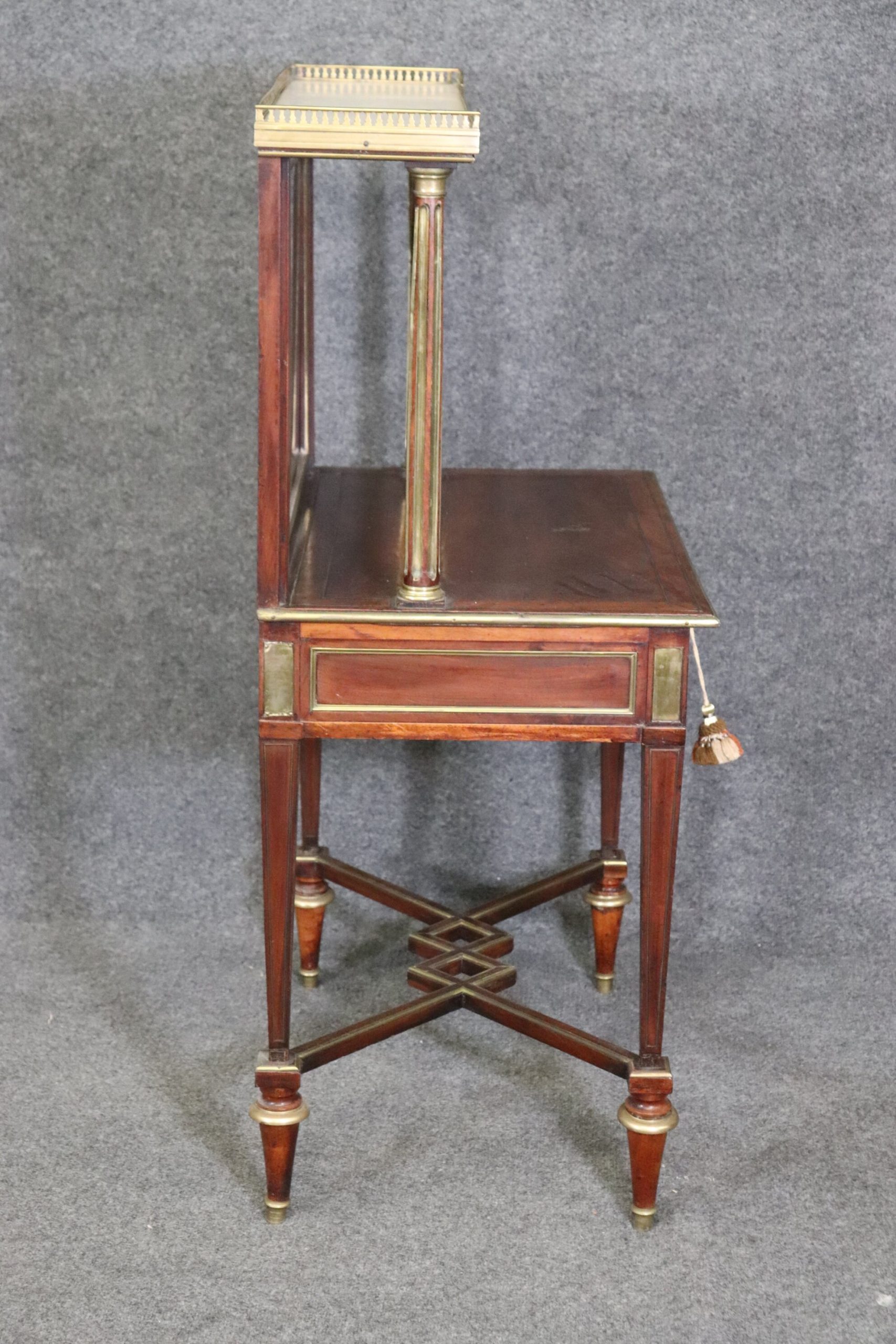This antique French Directoire style brass trimmed marble top vanity is really unique and made of the highest quality! If you take a look at the photos provided, you will see the attention to detail in the brass accents throughout the piece. This piece is also equipped with a lockable drawer under a leather top writing surface perfect for keeping your personal belongings safe and out of reach. This piece is perfect for use as a decorative object or can be used as a desk or vanity! This piece is in antique condition with scratches and finish loss to the wood from use.