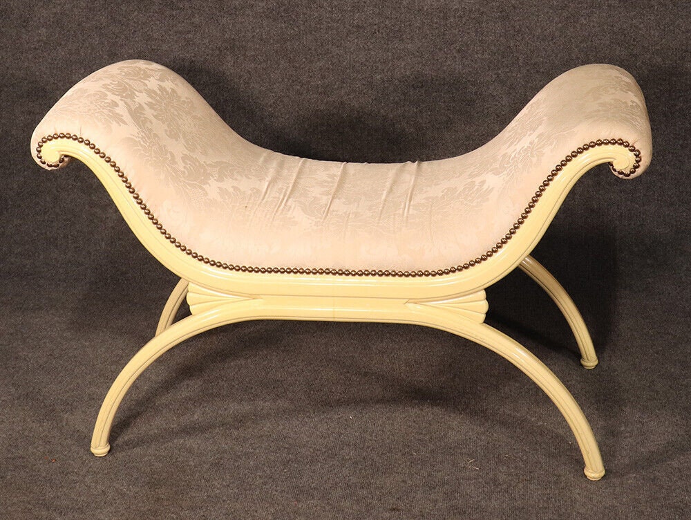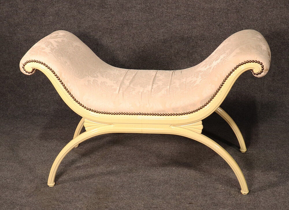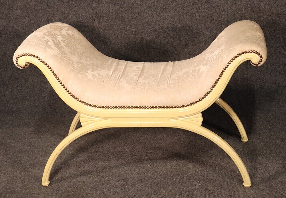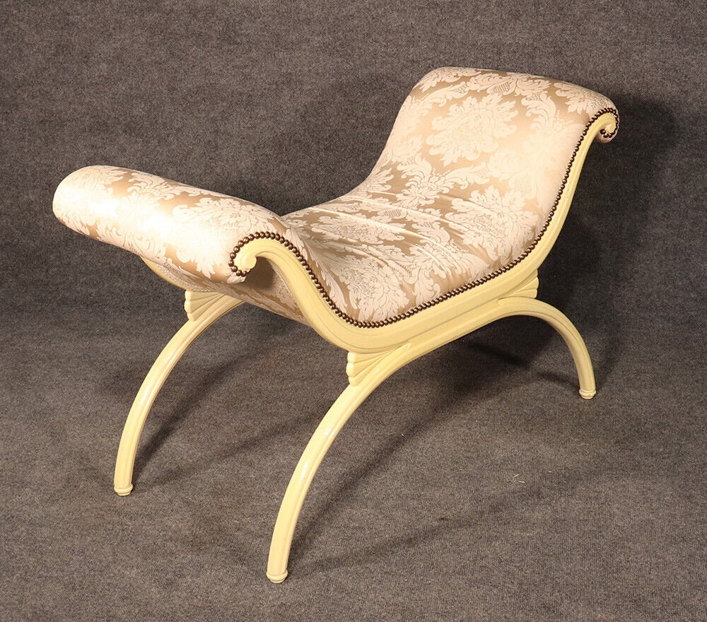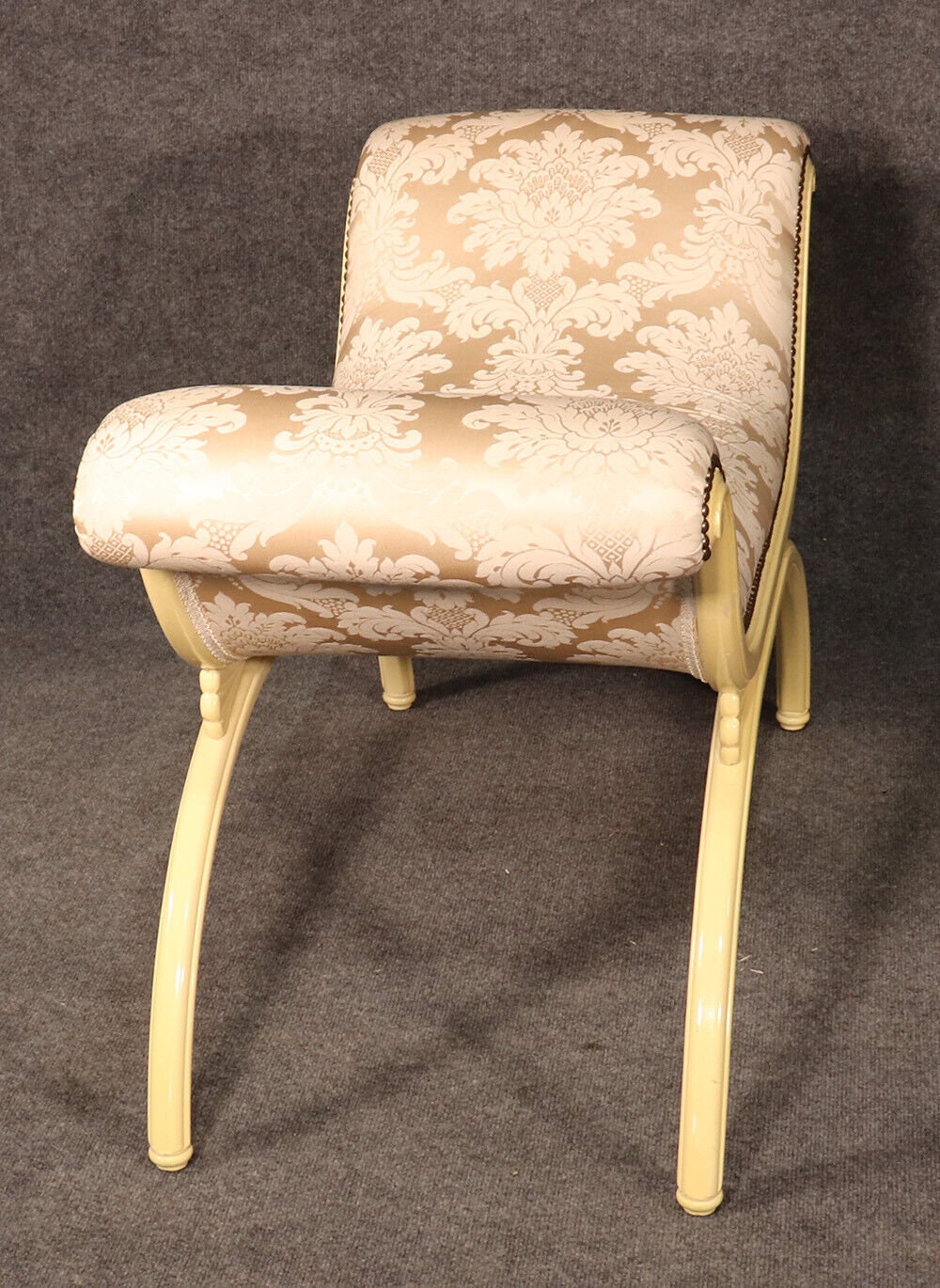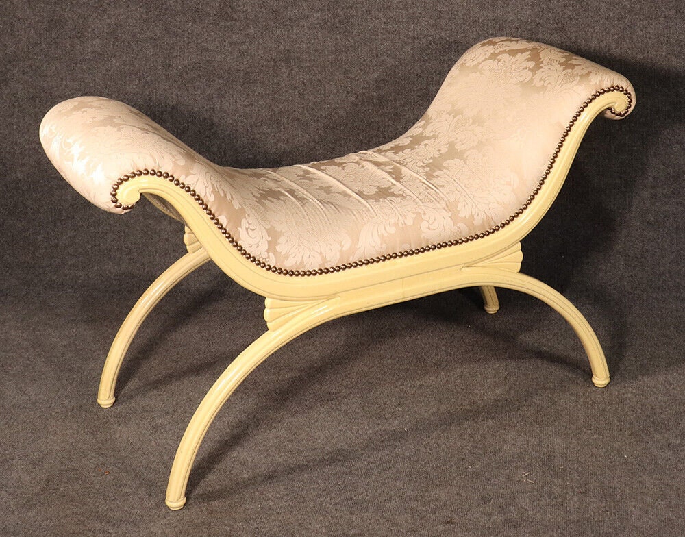 This French Hollywood Regency creme laquered boudoir window bench is a high quality piece upholstered in beautiful Damask silk! This boudoir window bench will add a nice sense of luxury into your living room, bedroom, office or other place of your choosing! The bench is in good vintage condition with light surface scratches to frame and some wear to the upholstery, as to be expected for a bench from the 1960’s.