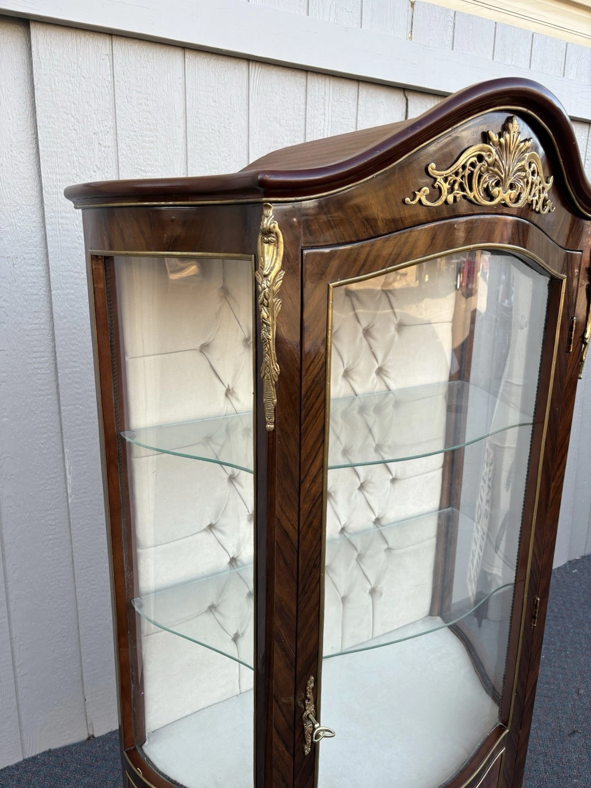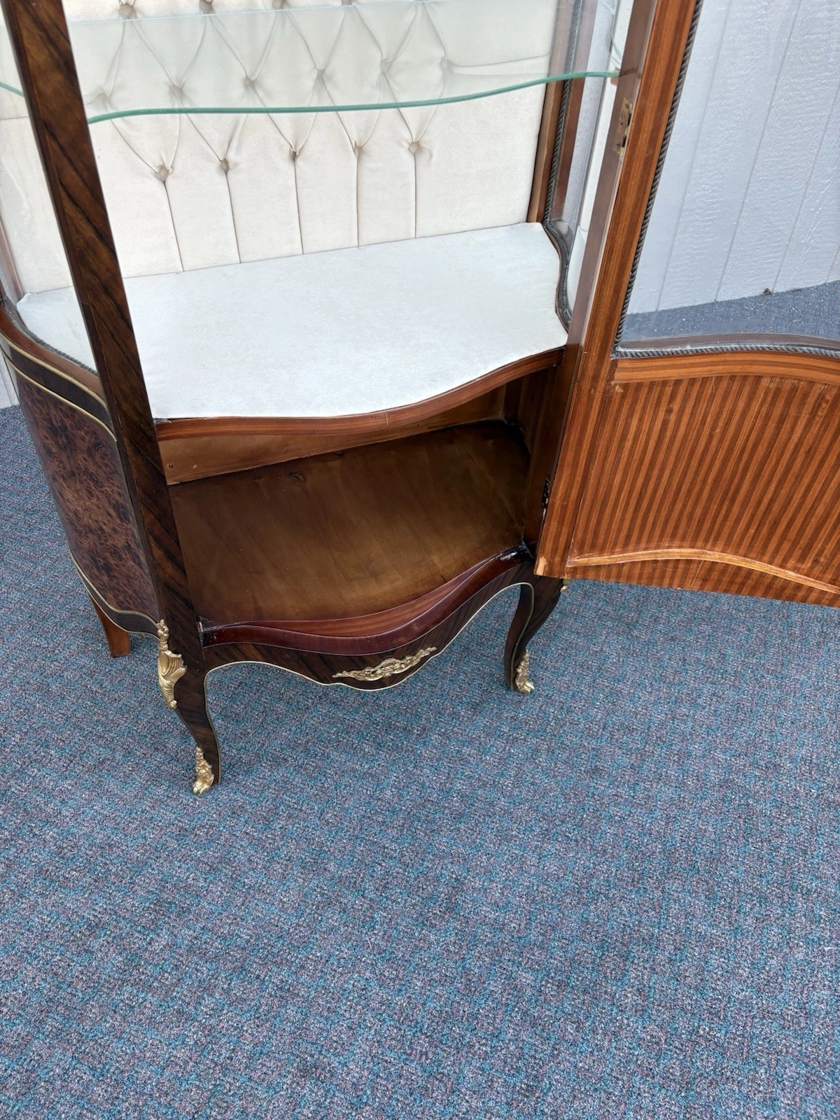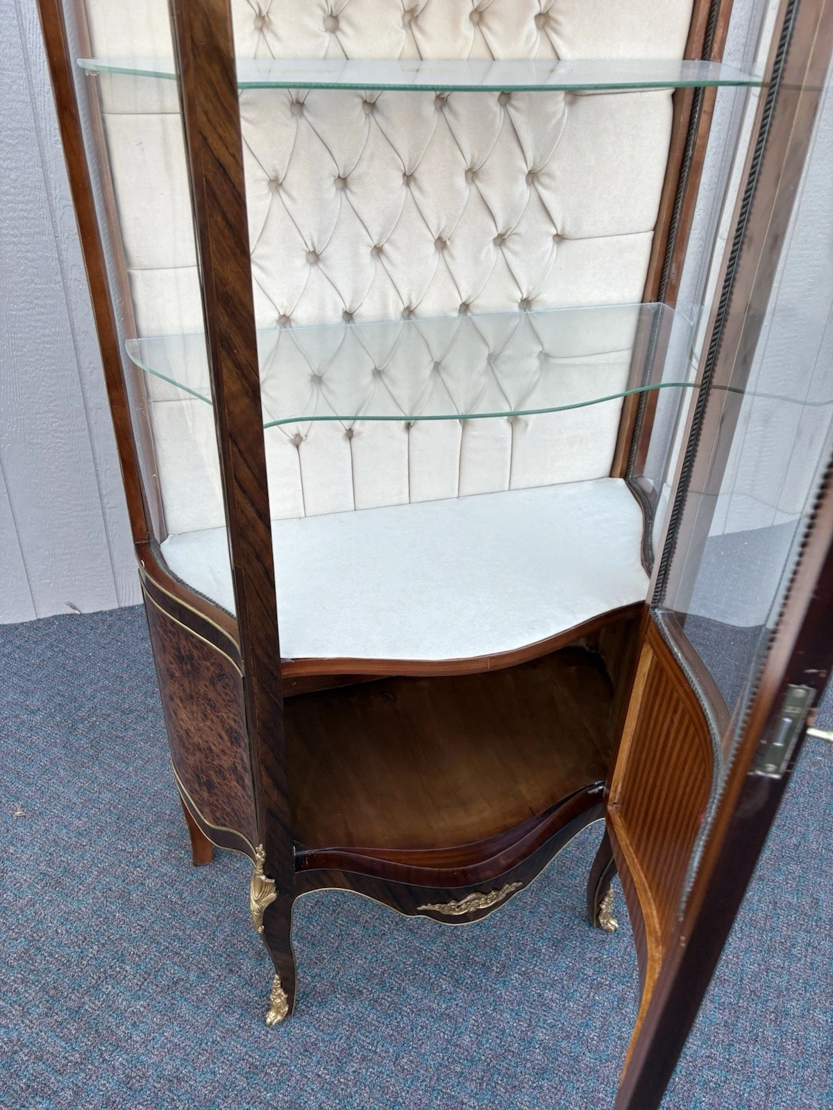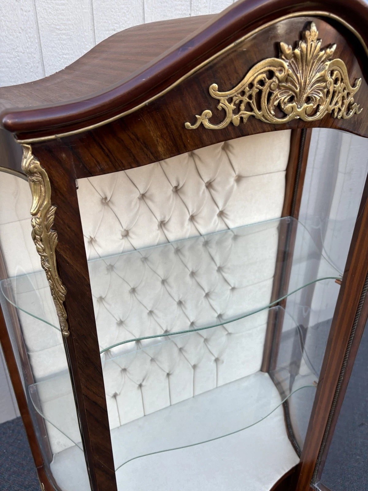 This exquisite French Louis XV curio cabinet showcases the elegance of a bygone era, beautifully crafted from rich satinwood and adorned with intricate bronze ormalu accents. The serpentine glass panels not only enhance its charm but also invite an intimate glimpse of your treasured collectibles displayed within its two shelves. Handcrafted with attention to detail, this cabinet serves as a stunning focal point, embodying the warmth and sophistication that only a family-owned antique can provide. Its unique character and historical significance make it a delightful addition to any home.