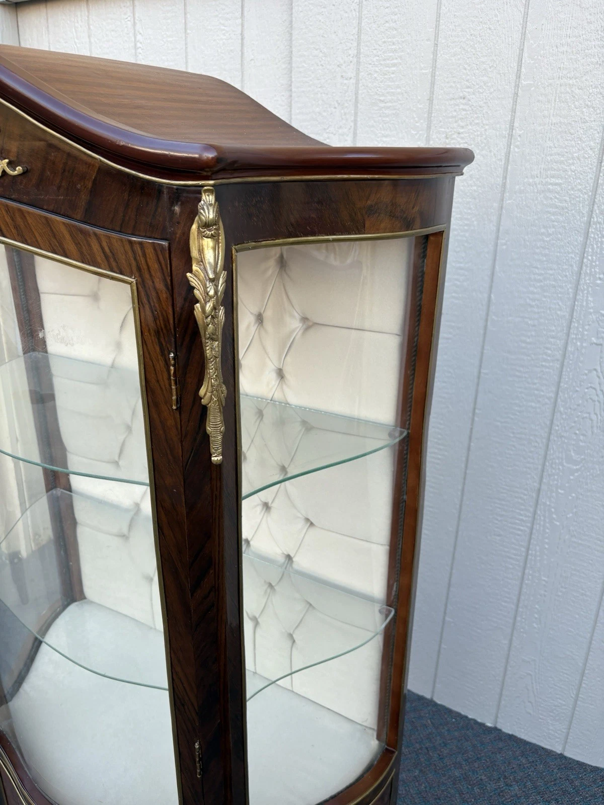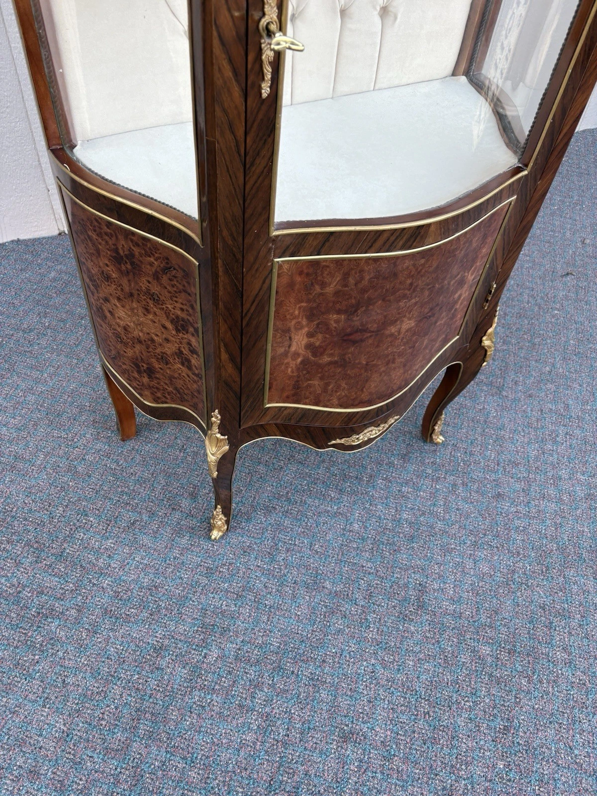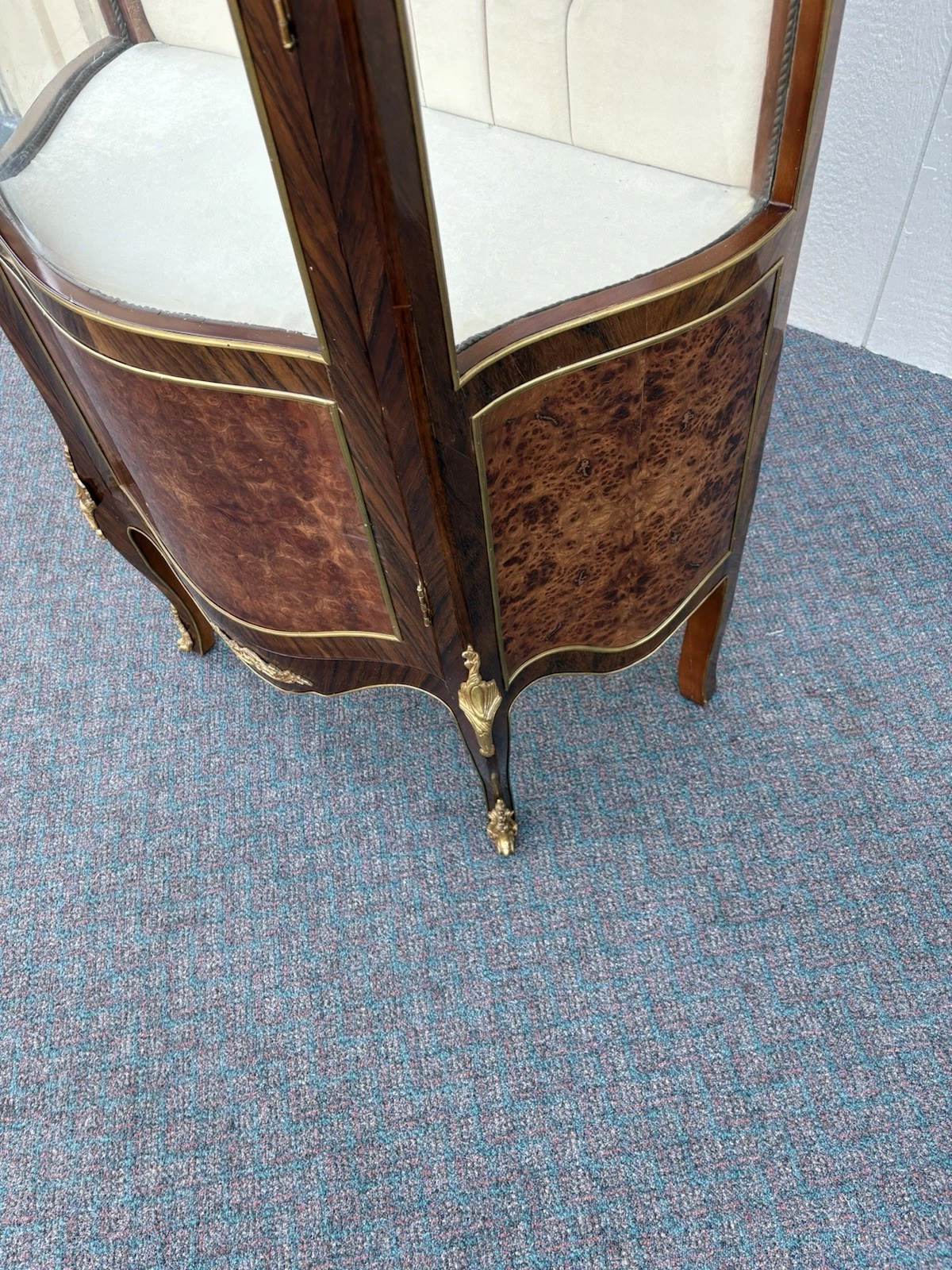This exquisite French Louis XV curio cabinet showcases the elegance of a bygone era, beautifully crafted from rich satinwood and adorned with intricate bronze ormalu accents. The serpentine glass panels not only enhance its charm but also invite an intimate glimpse of your treasured collectibles displayed within its two shelves. Handcrafted with attention to detail, this cabinet serves as a stunning focal point, embodying the warmth and sophistication that only a family-owned antique can provide. Its unique character and historical significance make it a delightful addition to any home.