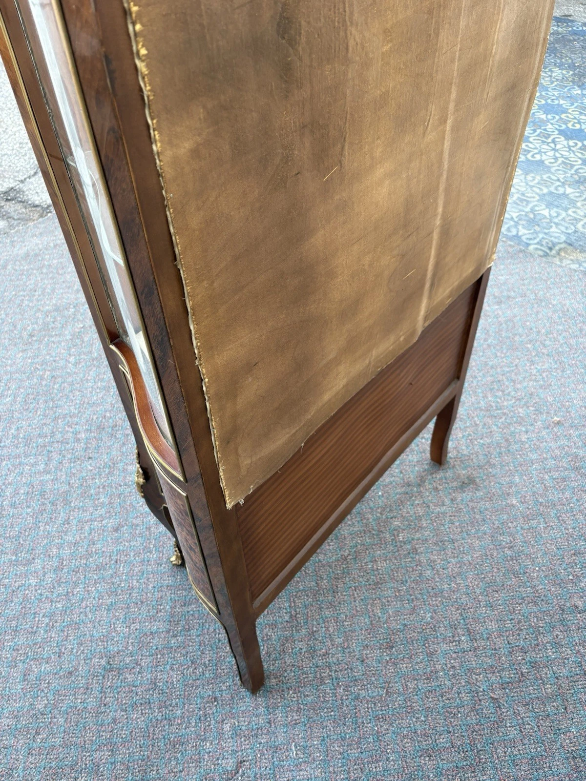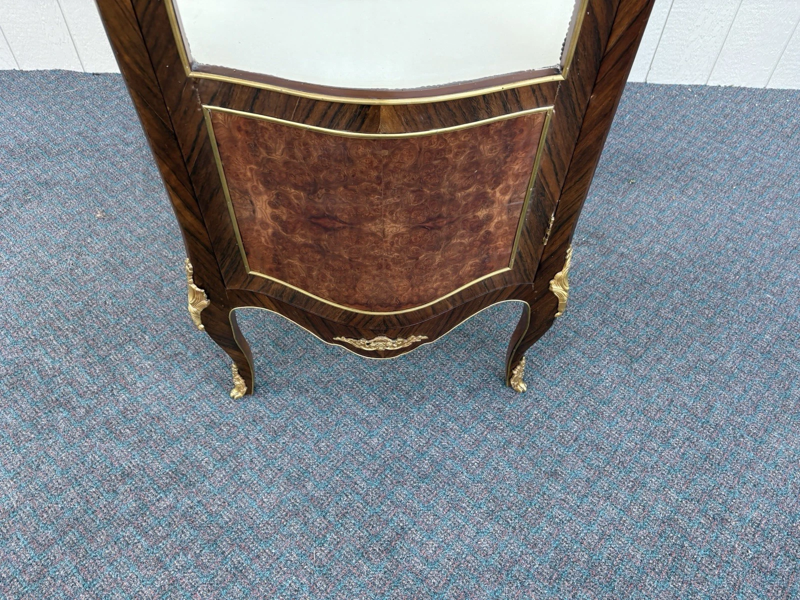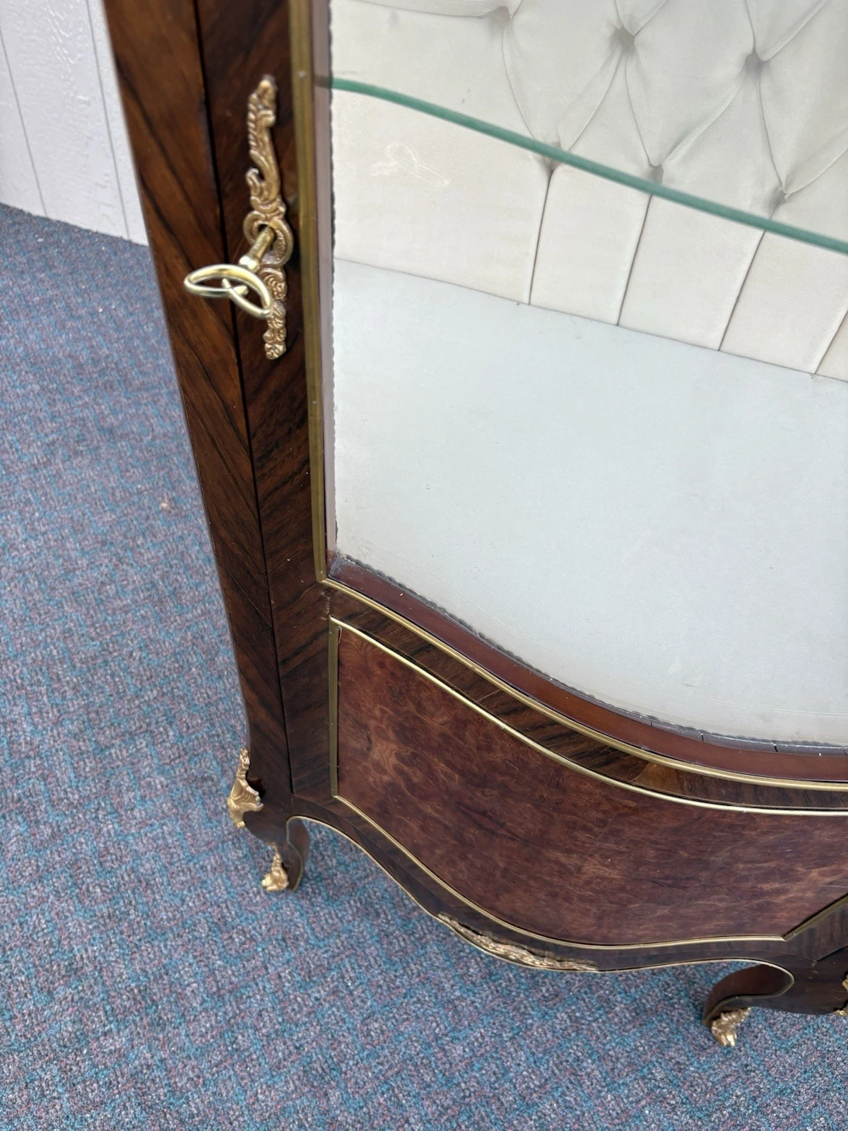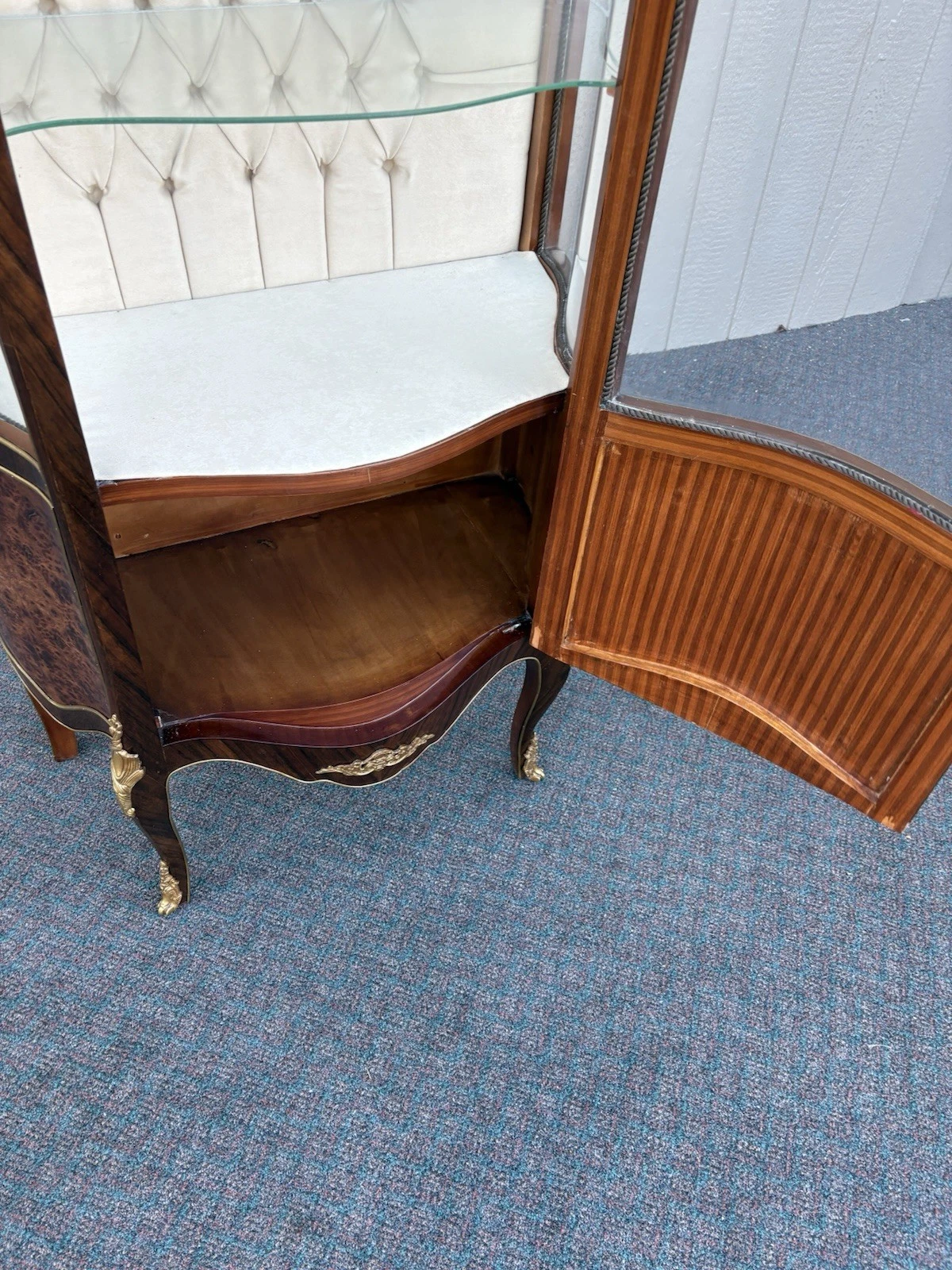 This exquisite French Louis XV curio cabinet showcases the elegance of a bygone era, beautifully crafted from rich satinwood and adorned with intricate bronze ormalu accents. The serpentine glass panels not only enhance its charm but also invite an intimate glimpse of your treasured collectibles displayed within its two shelves. Handcrafted with attention to detail, this cabinet serves as a stunning focal point, embodying the warmth and sophistication that only a family-owned antique can provide. Its unique character and historical significance make it a delightful addition to any home.