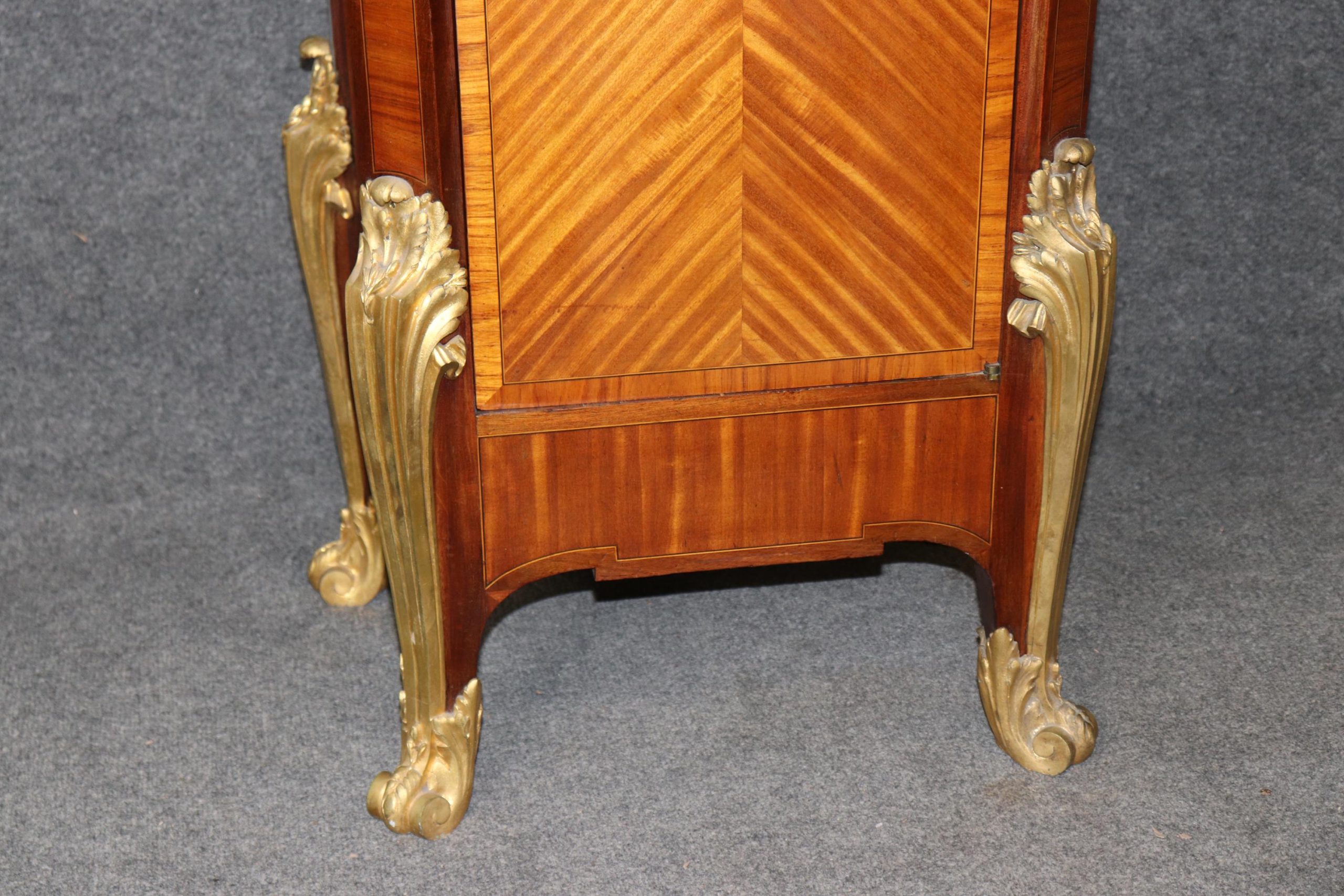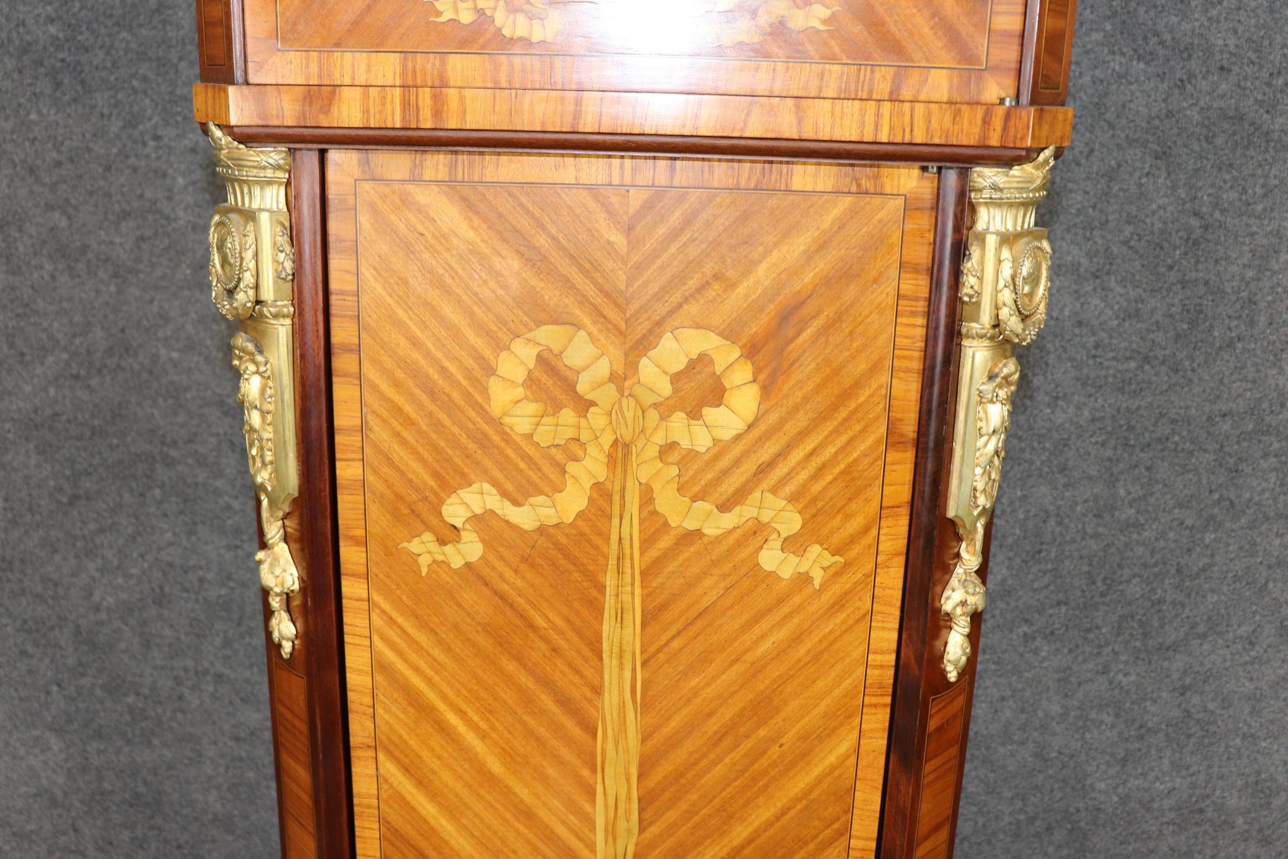 The clock stands as a testament to the golden age of French furniture making, when master craftsmen like Zwiener elevated functional objects to the level of fine art. The combination of superior marquetry work, exceptional bronze ormolu mounts, and prestigious hardware creates a piece that would be equally at home in a grand château or the most sophisticated contemporary interior.