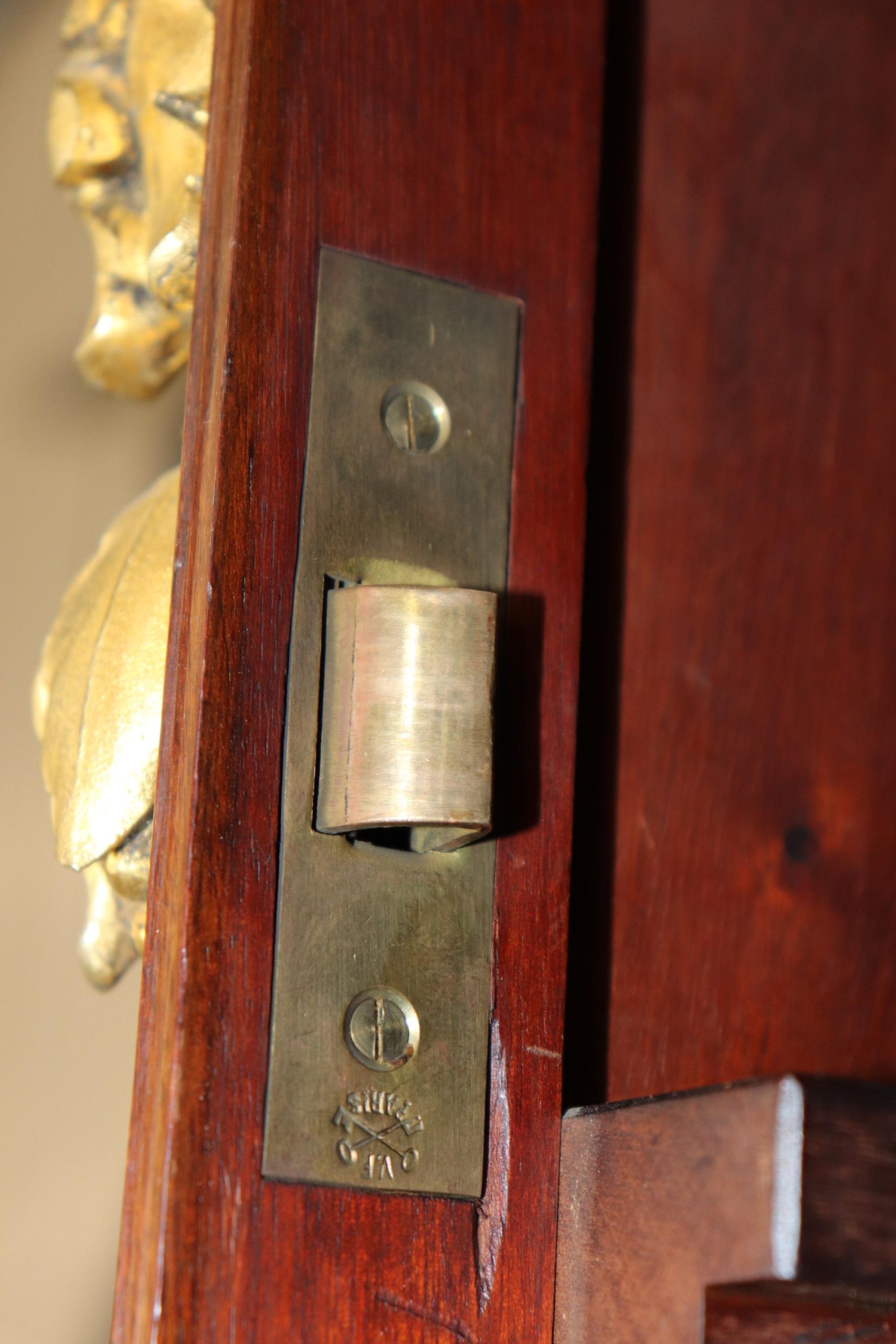 The movement operates with three weights and pendulum, representing the traditional longcase clock mechanism that has kept precise time for generations. The locks and latches bear the prestigious mark of Vachette Frères Paris, renowned locksmiths whose work graced the finest French furniture of the period. This attribution adds significant provenance value, as Vachette Frères was the preferred locksmith for many of Paris’s most distinguished ébénistes.