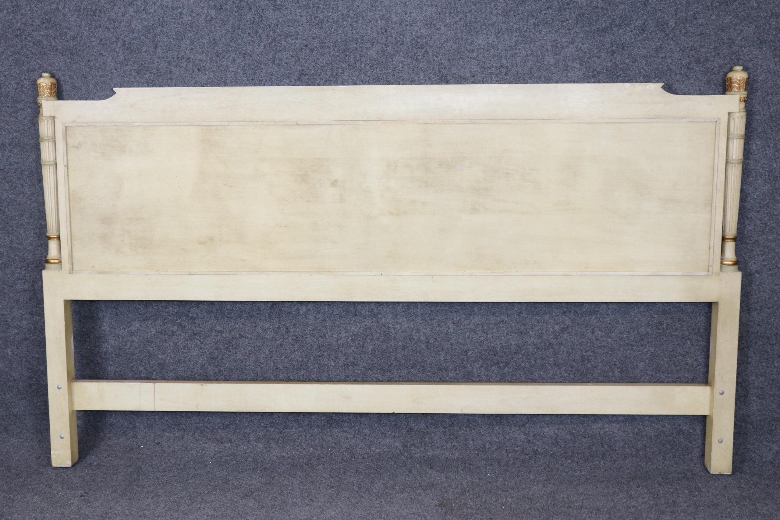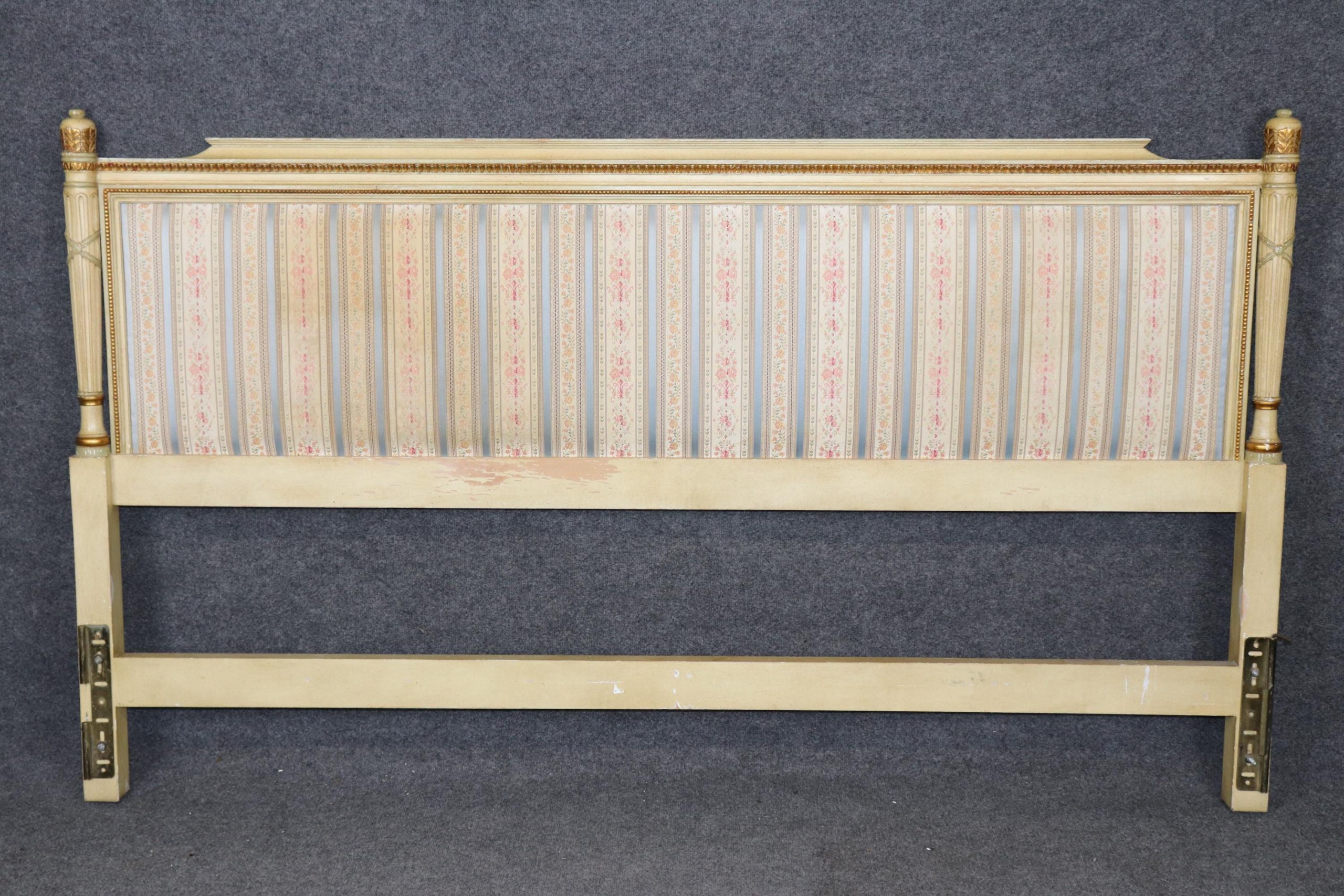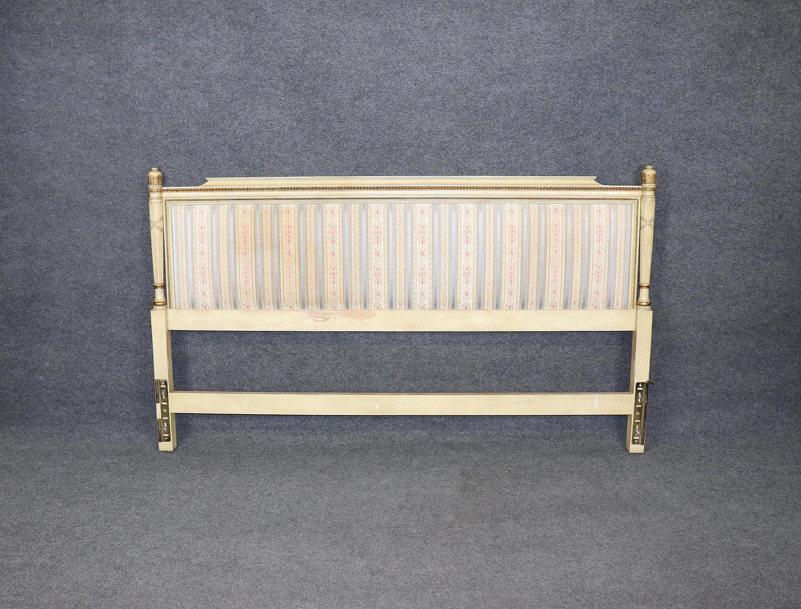 Infuse your bedroom with the timeless elegance of French neoclassical design with this exquisite French Louis XVI style king size headboard, beautifully paint decorated and adorned with subtle gilt detailing. Crafted in the mid-20th century, this refined piece echoes the sophistication of 18th-century French court furnishings, blending antique inspiration with a romantic, timeworn aesthetic.