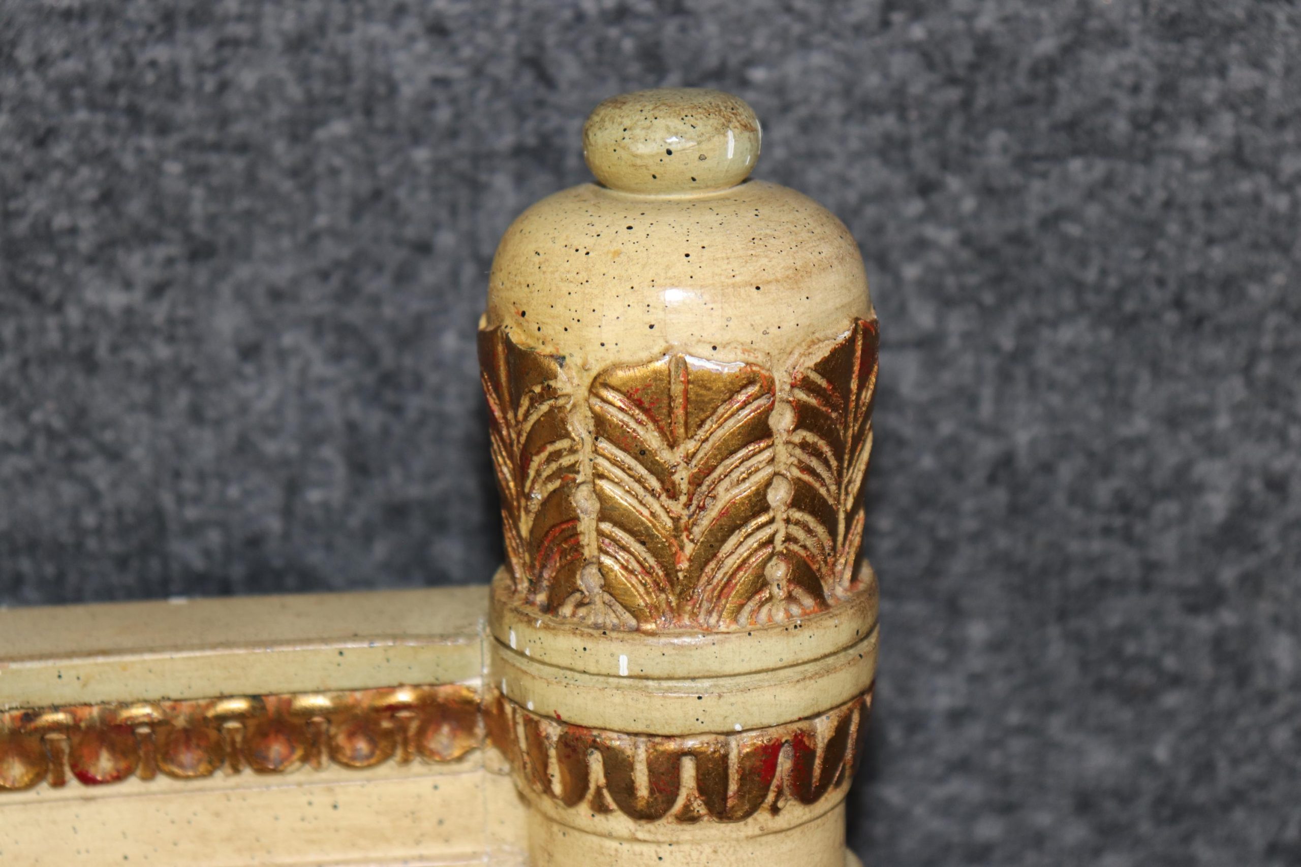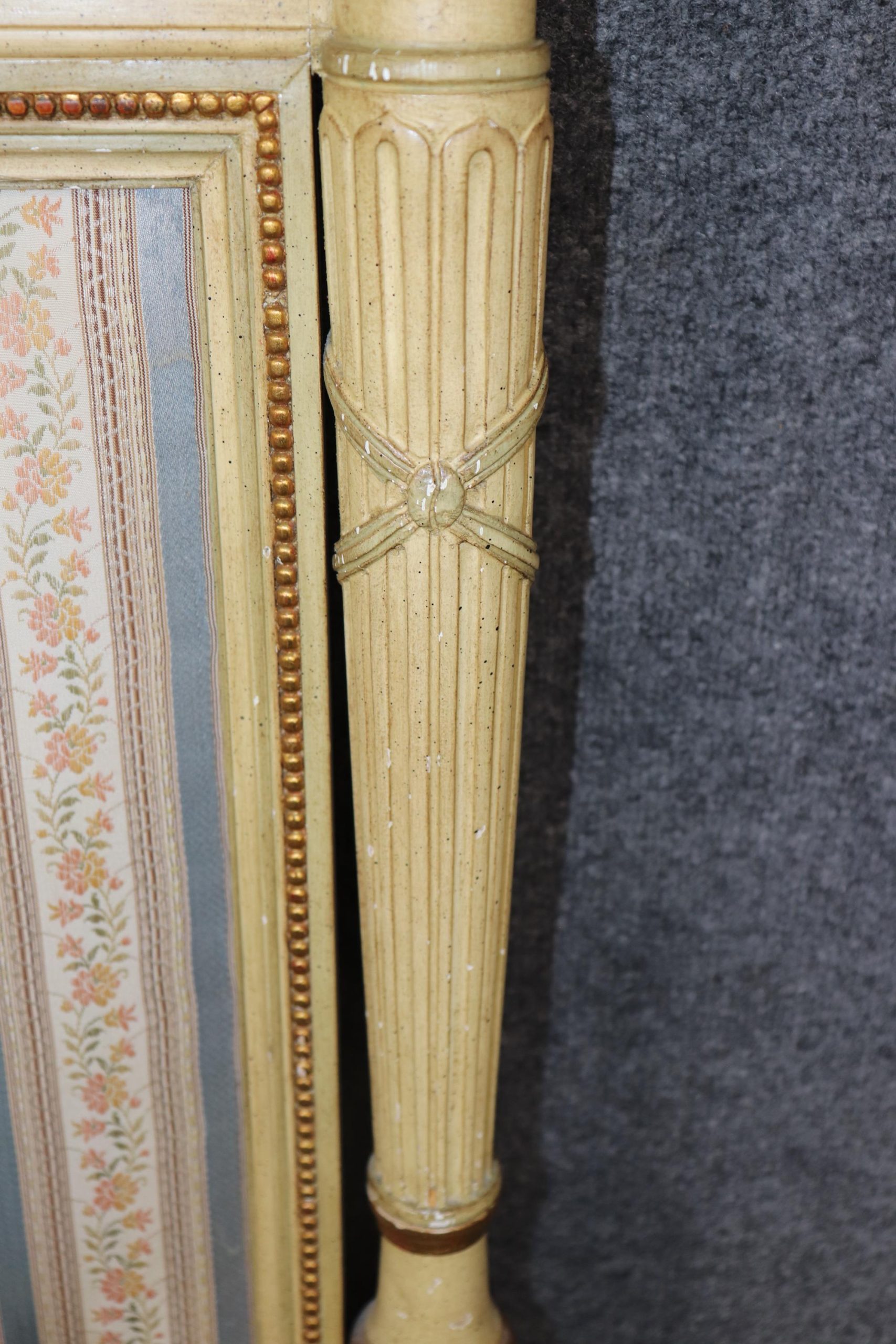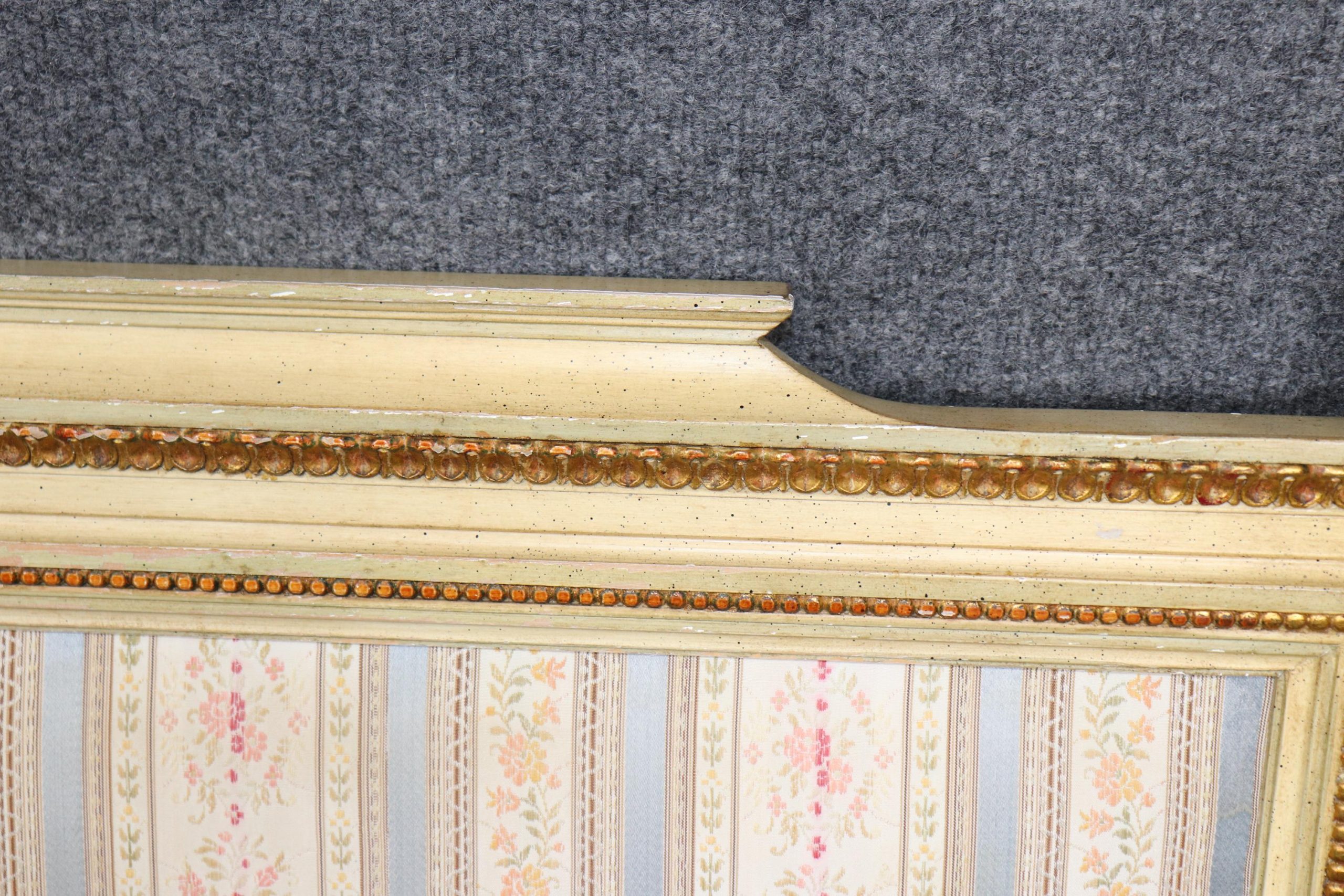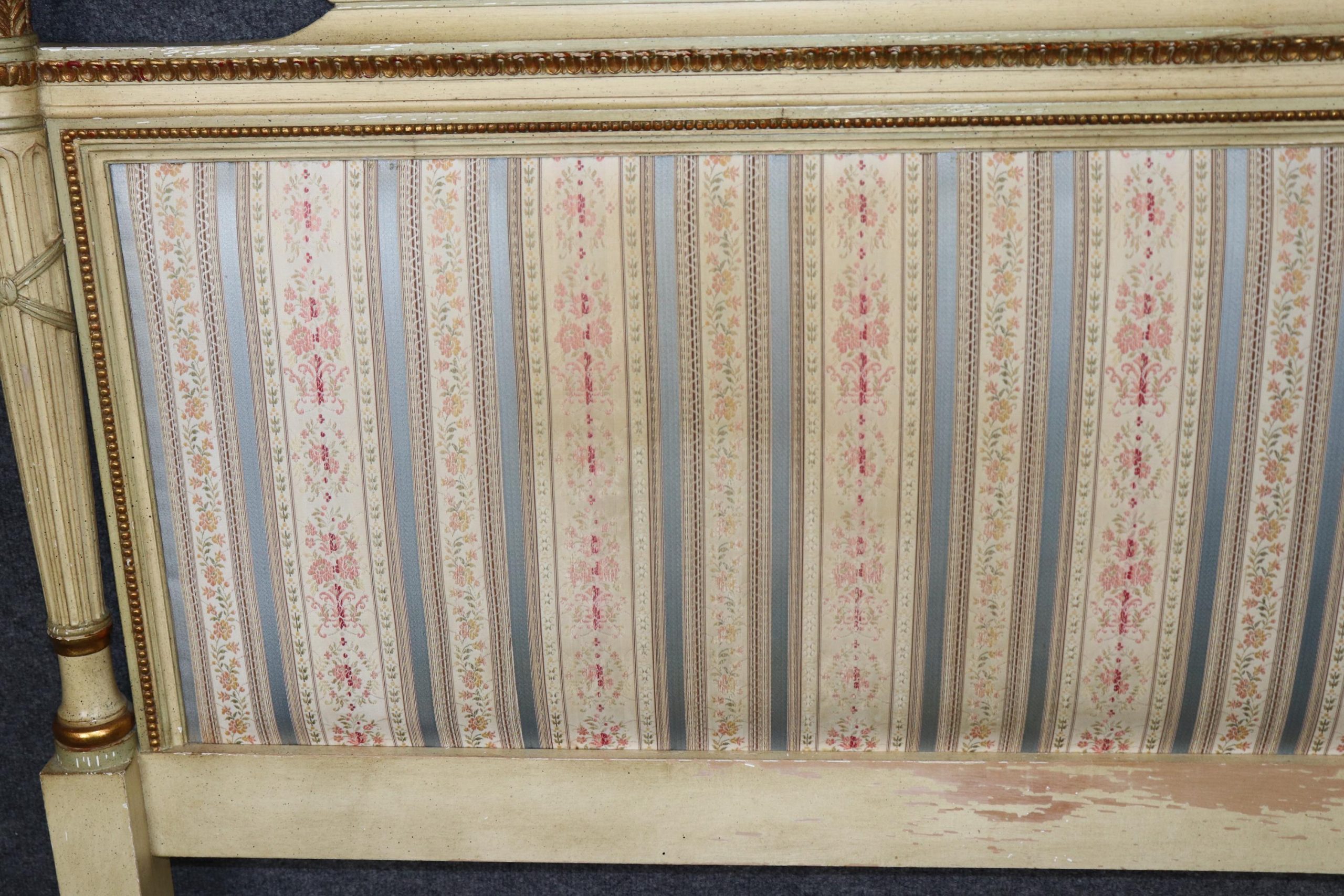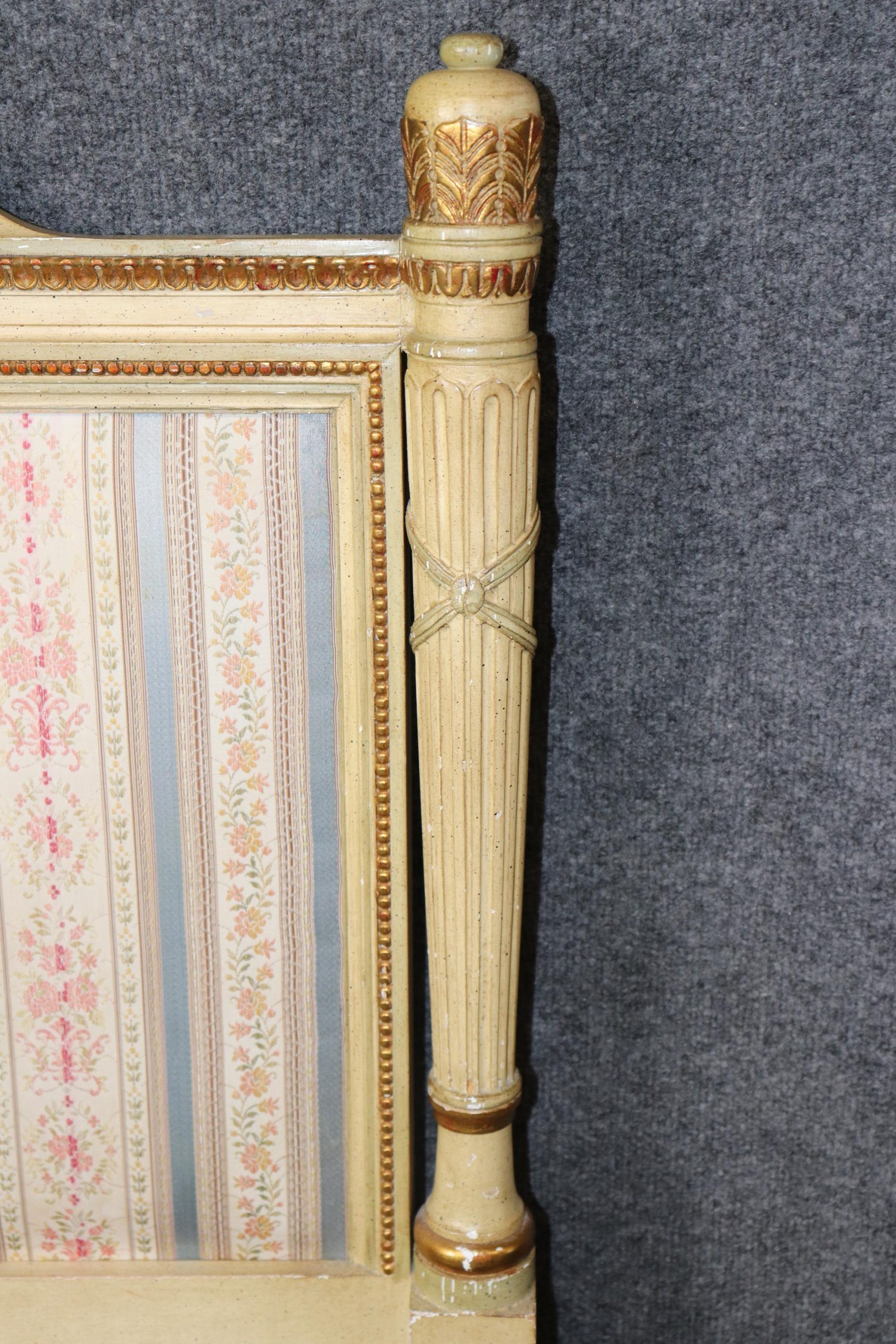 The headboard features a gracefully shaped rectangular form with fluted corner posts, classic Louis XVI style molding, and carved rosette medallions that exemplify the delicate artistry of the period. The frame is finished in a soft, distressed cream paint, tastefully accented with hand-applied gold highlights that bring depth, texture, and a warm sense of patina. The natural wear and aged imperfections in the finish lend the piece an authentic antique charm, perfect for those who appreciate wabi-sabi beauty or shabby chic interiors.