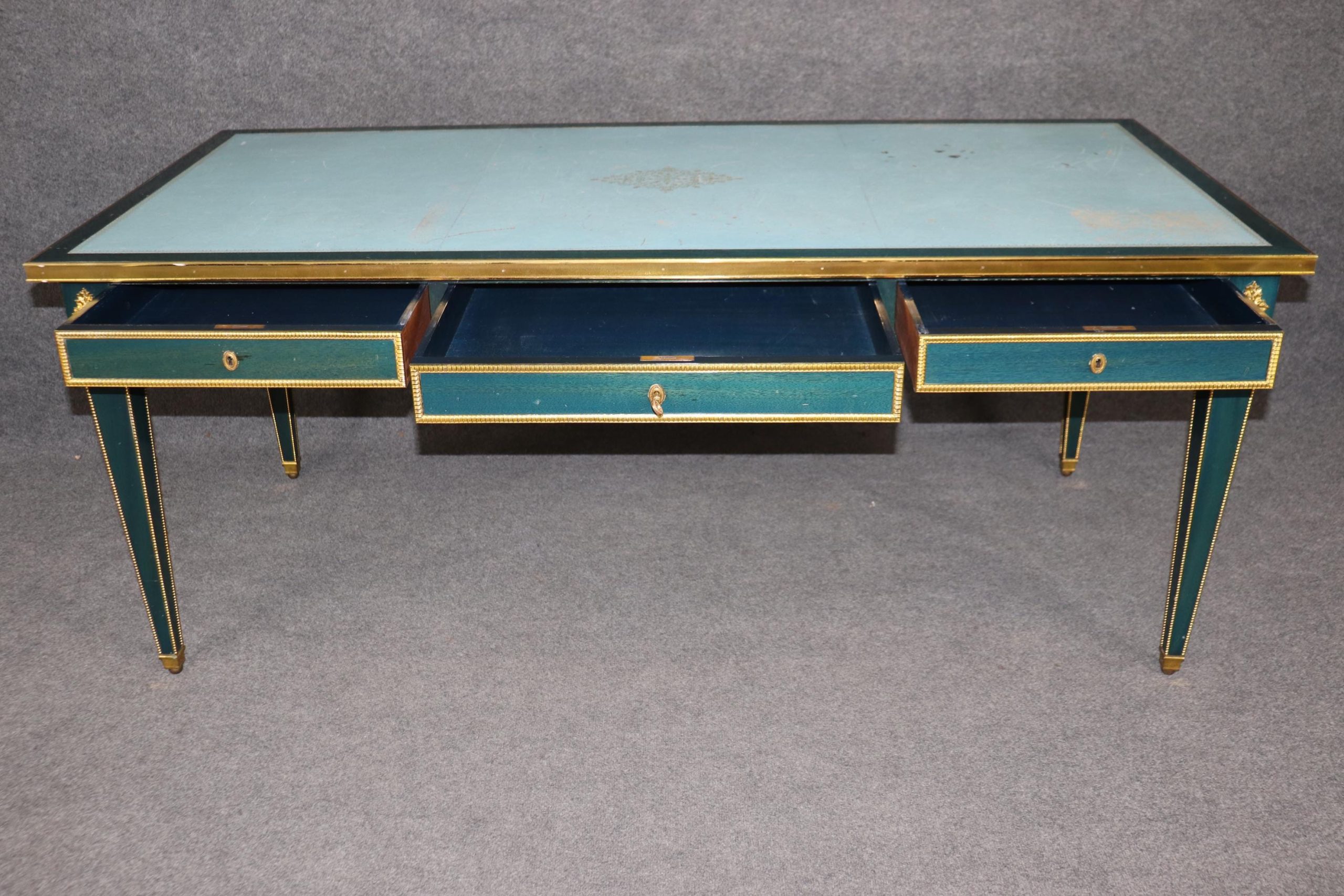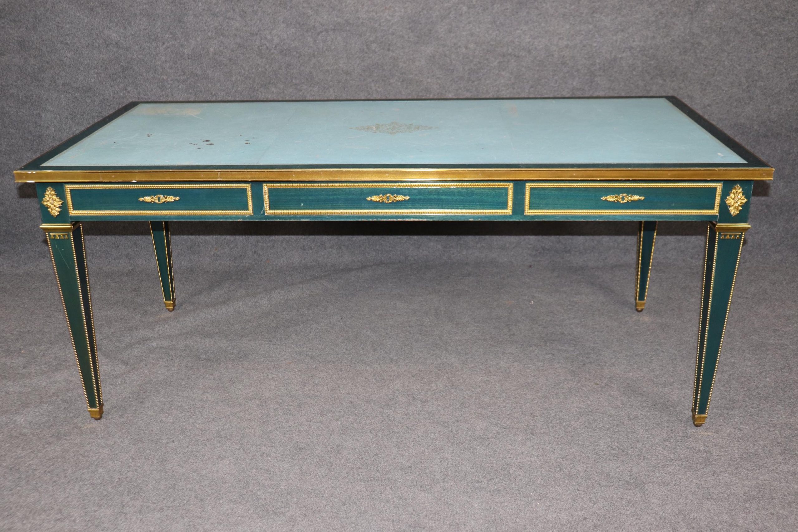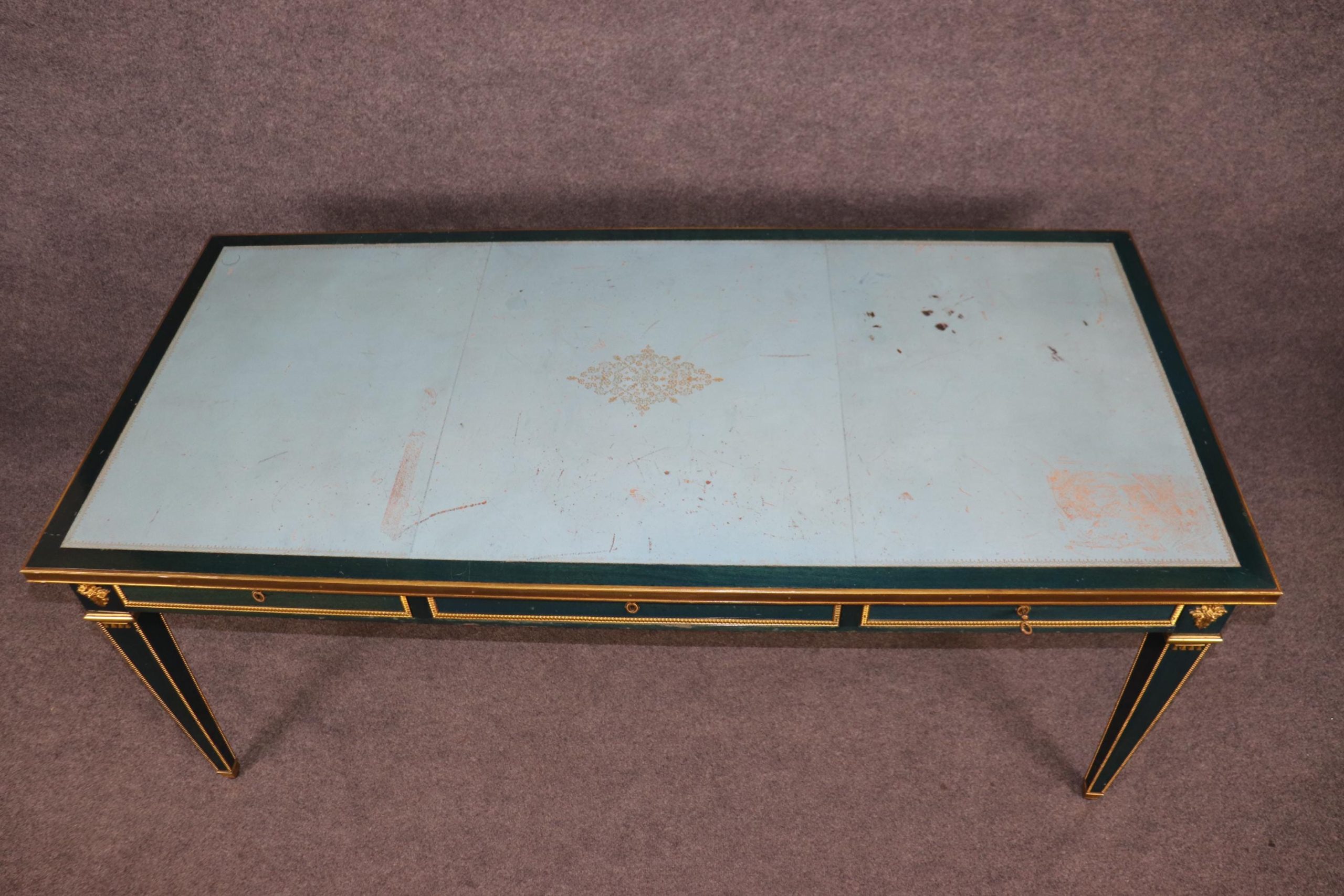 This vintage French Louis XVI style blue leather top bureau plat by Maurice Hirch (likely for Maison Jansen) is made of the highest quality and is truly remarkable! This exceptional table will most definitely be a conversation starter! This table can be paired with just about any style you may already have in your home or place of choosing! The desk is equipped with 3 locking drawers, perfect for safely storing your belongings. This piece gives off an overwhelming sense of character and luxury and tells its own story as people catch themselves staring at it! Antique furniture and vintage pieces have stood the test of time and this bureau plat is no exception. With its quality materials and great craftsmanship this is bound to last you and your family for many years to come. Maurice Hirch was known for making furniture for the design firm Maison Jansen in the mid 20th century towards the end of the firms life. The desk is in good vintage condition with minor surface scratches to the frame and wear to the leather, as to be expected with an item of this age! Otherwise good condition.