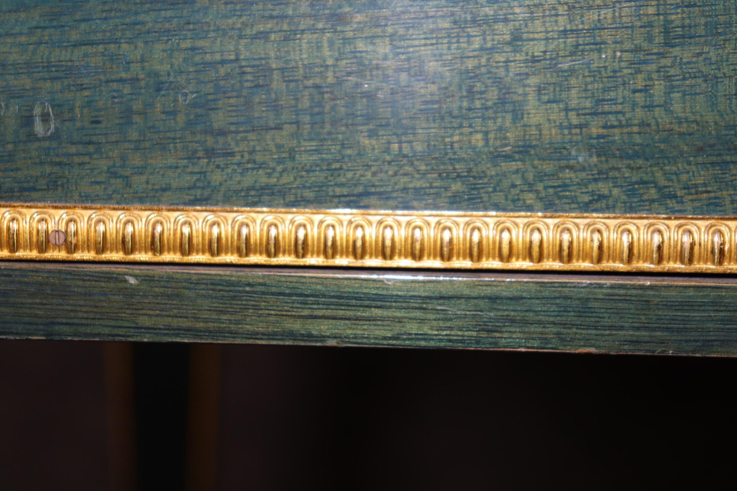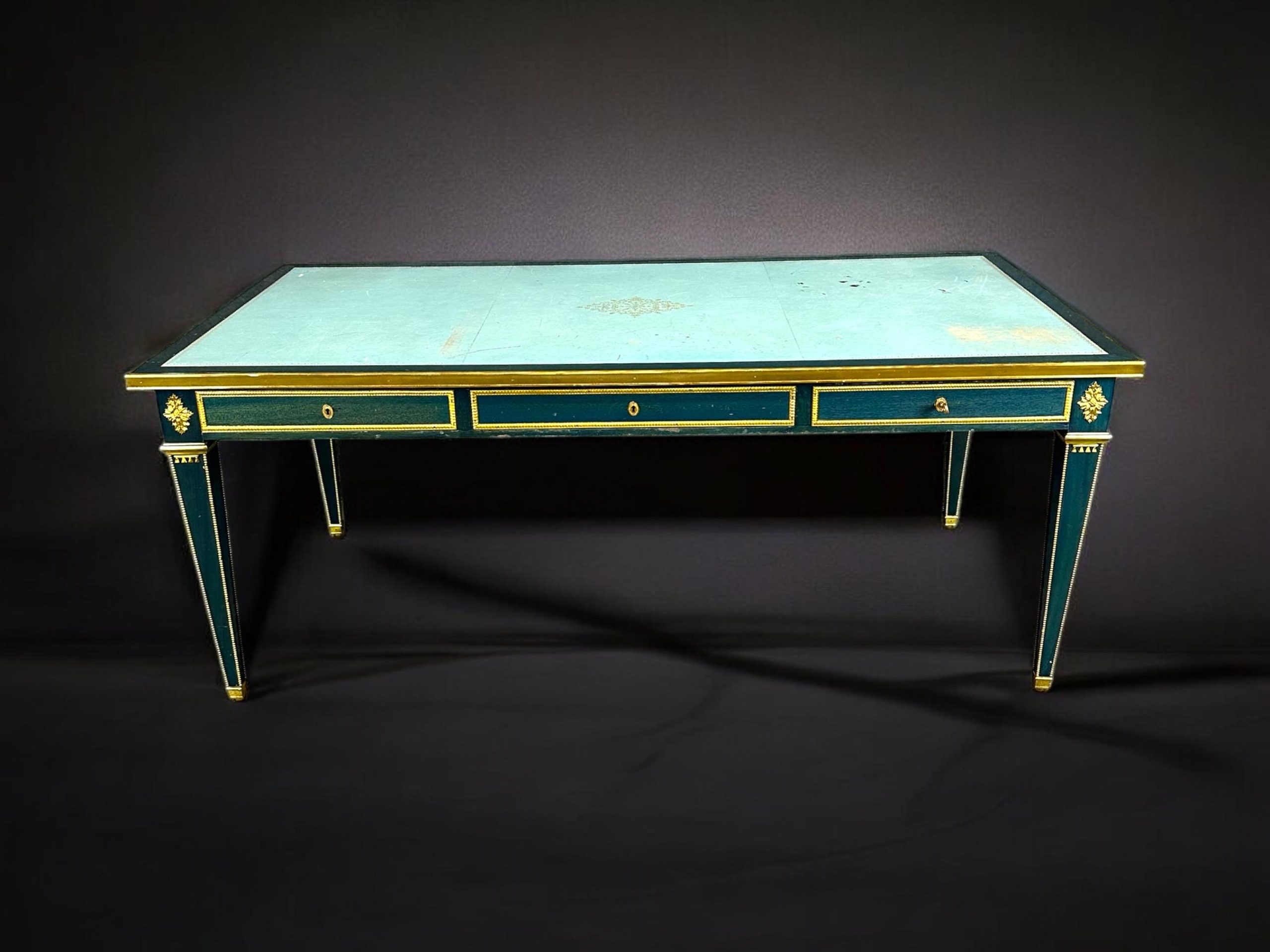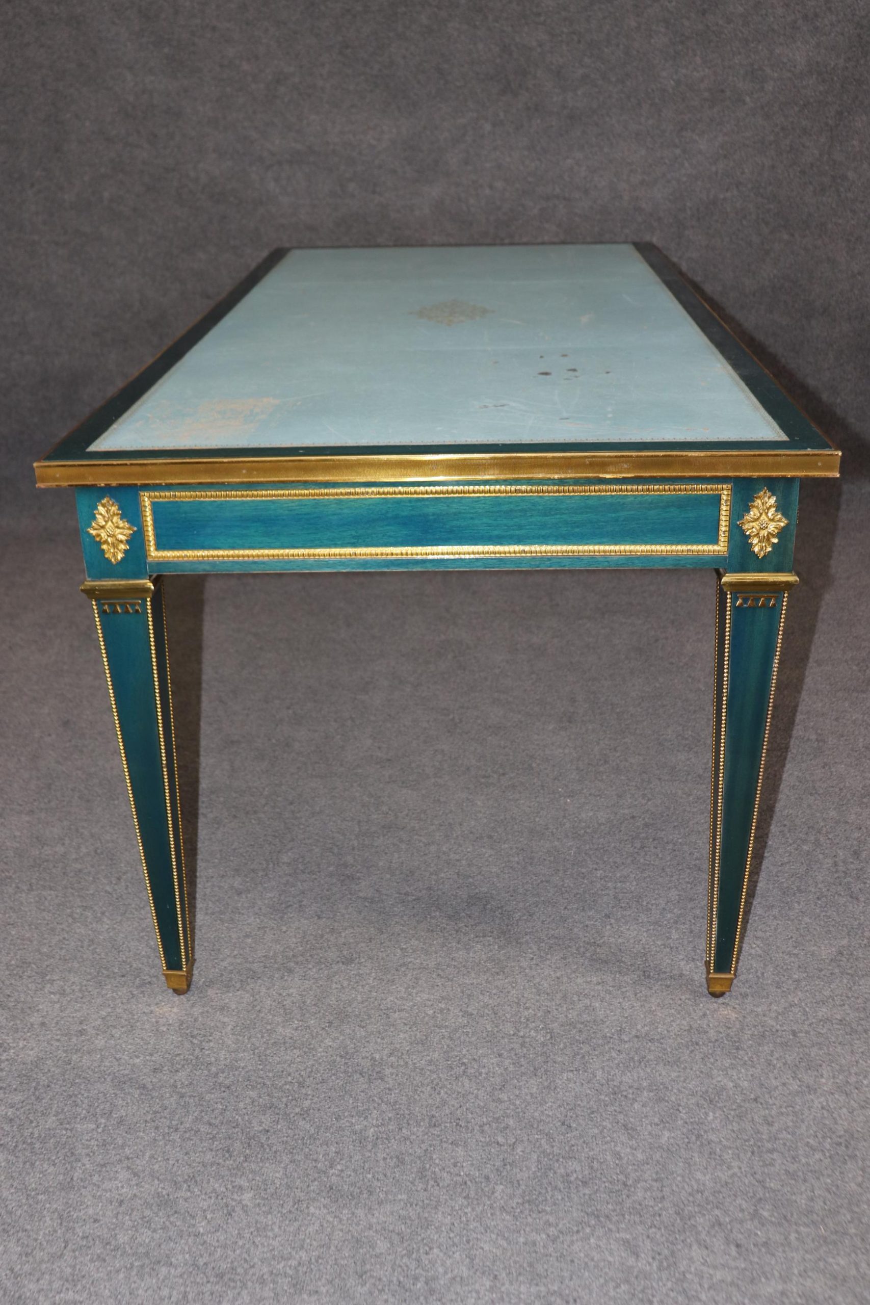 This vintage French Louis XVI style blue leather top bureau plat by Maurice Hirch (likely for Maison Jansen) is made of the highest quality and is truly remarkable! This exceptional table will most definitely be a conversation starter! This table can be paired with just about any style you may already have in your home or place of choosing! The desk is equipped with 3 locking drawers, perfect for safely storing your belongings. This piece gives off an overwhelming sense of character and luxury and tells its own story as people catch themselves staring at it! Antique furniture and vintage pieces have stood the test of time and this bureau plat is no exception. With its quality materials and great craftsmanship this is bound to last you and your family for many years to come. Maurice Hirch was known for making furniture for the design firm Maison Jansen in the mid 20th century towards the end of the firms life. The desk is in good vintage condition with minor surface scratches to the frame and wear to the leather, as to be expected with an item of this age! Otherwise good condition.