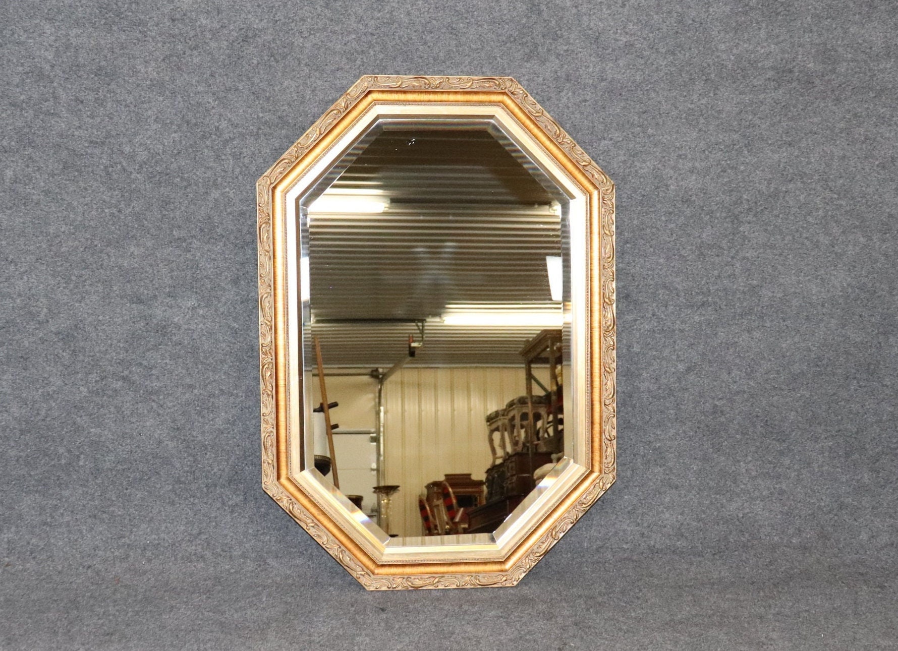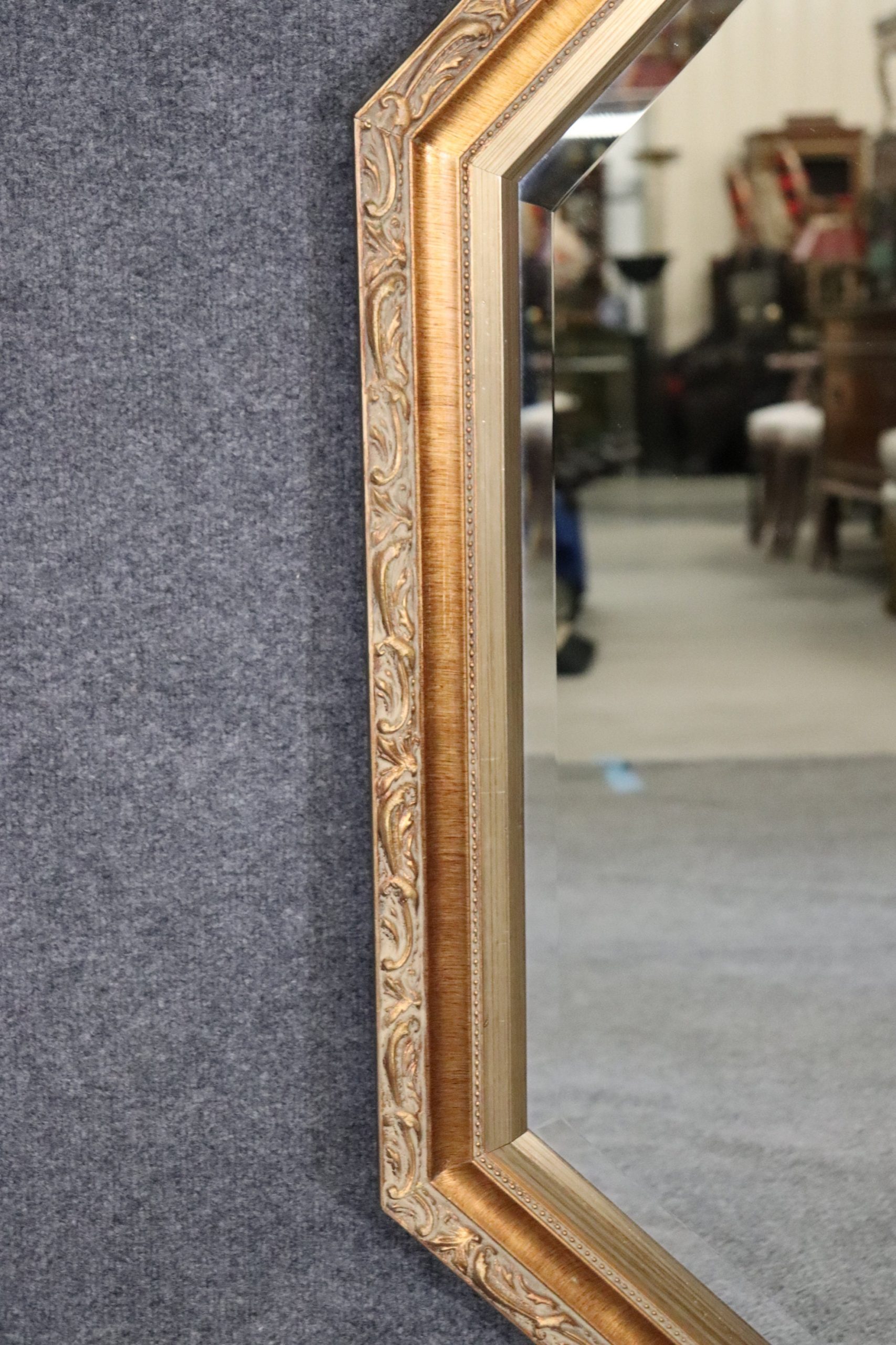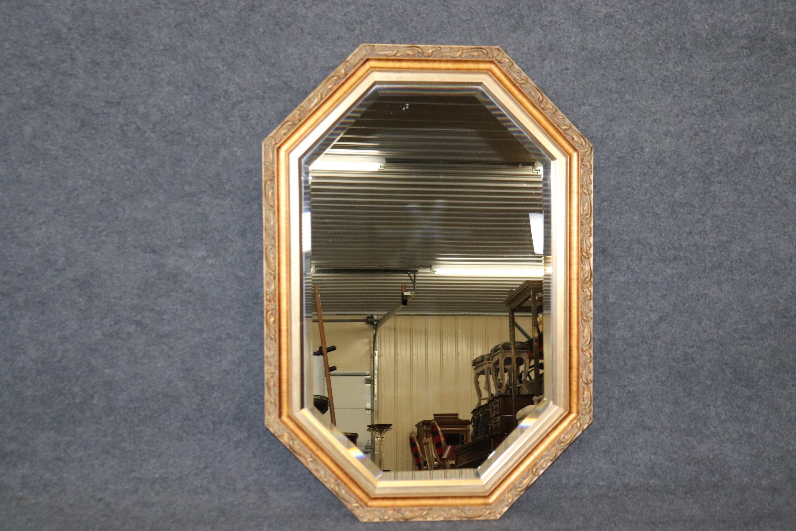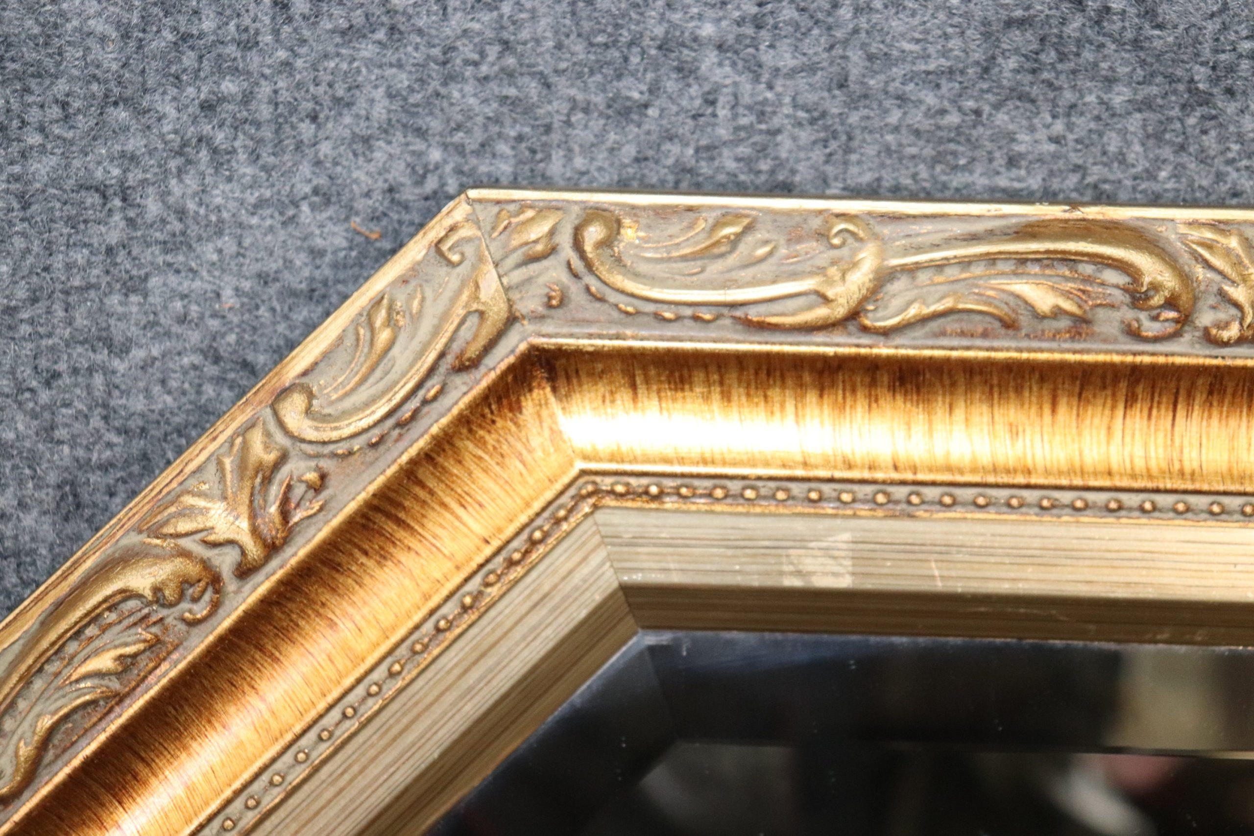 This French Louis XVI Style Gold Gilt Octagonal Beveled Glass Wall Hanging Mirror is truly exceptional! If you take a look at the photos provided you’ll see the exceptional attention to detail within the carved gilt frame. One dead give away that this piece is quality is by looking at the beveled mirror. Beveled mirror is much more expensive than plain mirror lower end furniture companies did not bother to put higher end materials into their product as it would cost them more money. This mirror is perfect to be used as a vanity mirror, Bathroom Mirror, Bedroom mirror, entryway mirror, or kitchen mirror and can be paired with a variety of other styles due to its simplistic yet luxurious design. This mirror is in good vintage condition with the exception of some light surface scratches and scuffs but otherwise good condition considering age. If you have any other questions please do not hesitate to reach out and ask!