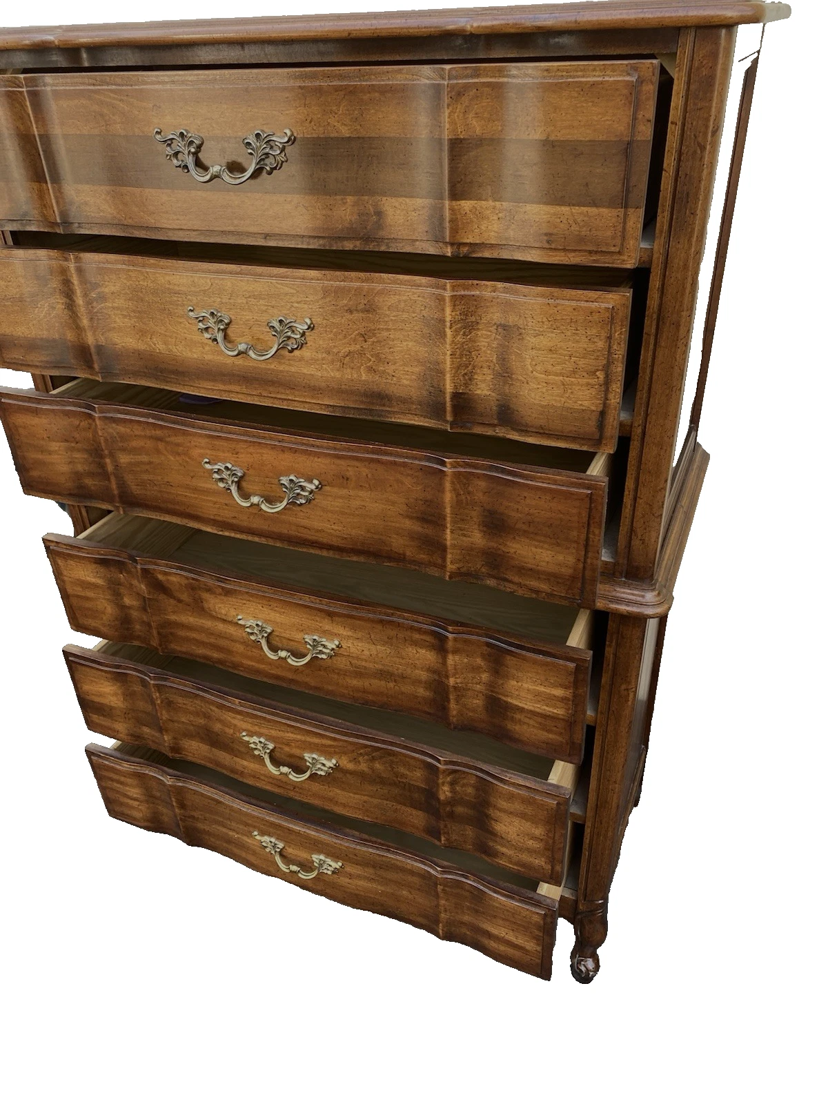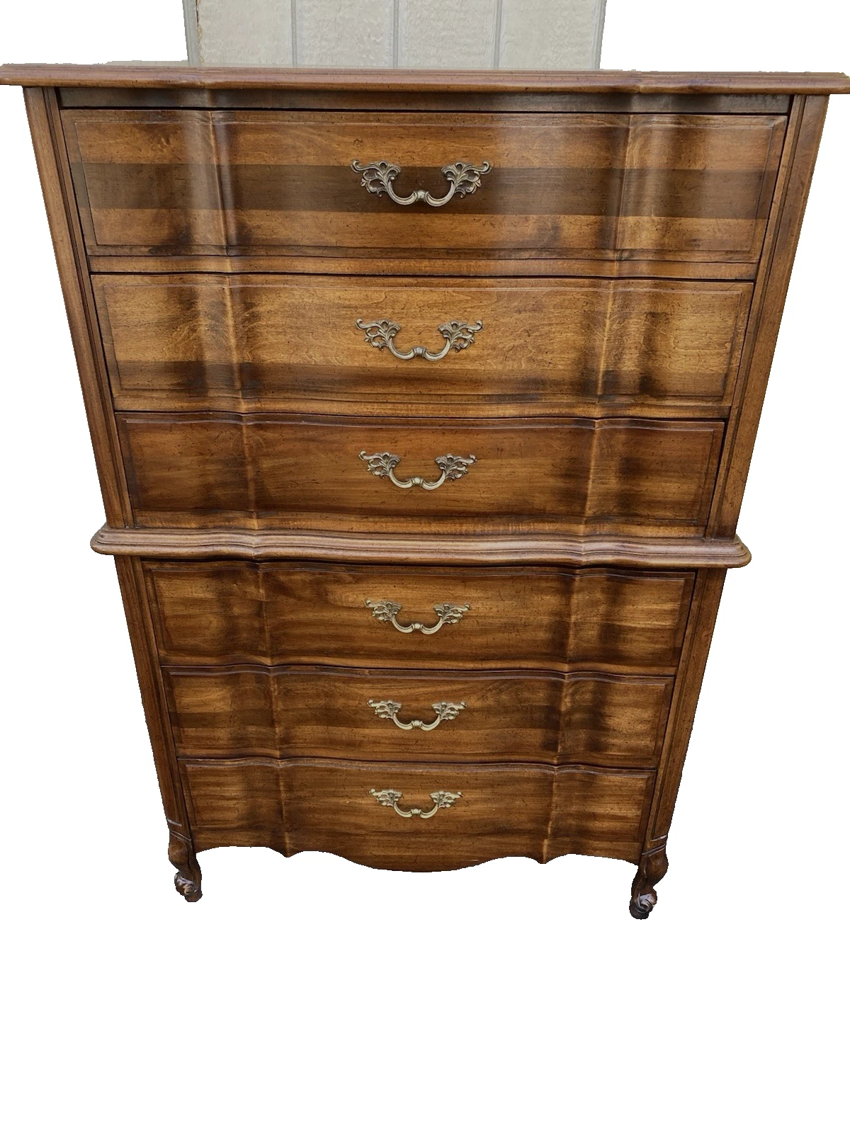 This charming French Provincial high chest dresser, crafted from rich cherry wood, beautifully showcases the elegance and timeless appeal of post-1950 design. With six spacious drawers that glide smoothly, it combines functionality with a delicate, traditional aesthetic, making it a perfect blend of form and practicality. The sturdy construction and warm patina reflect the care taken in its craftsmanship, inviting you to appreciate its character and history. A delightful addition to any room, this piece embodies the spirit of family and home, just as Center Stage Antiques has for nearly three decades.