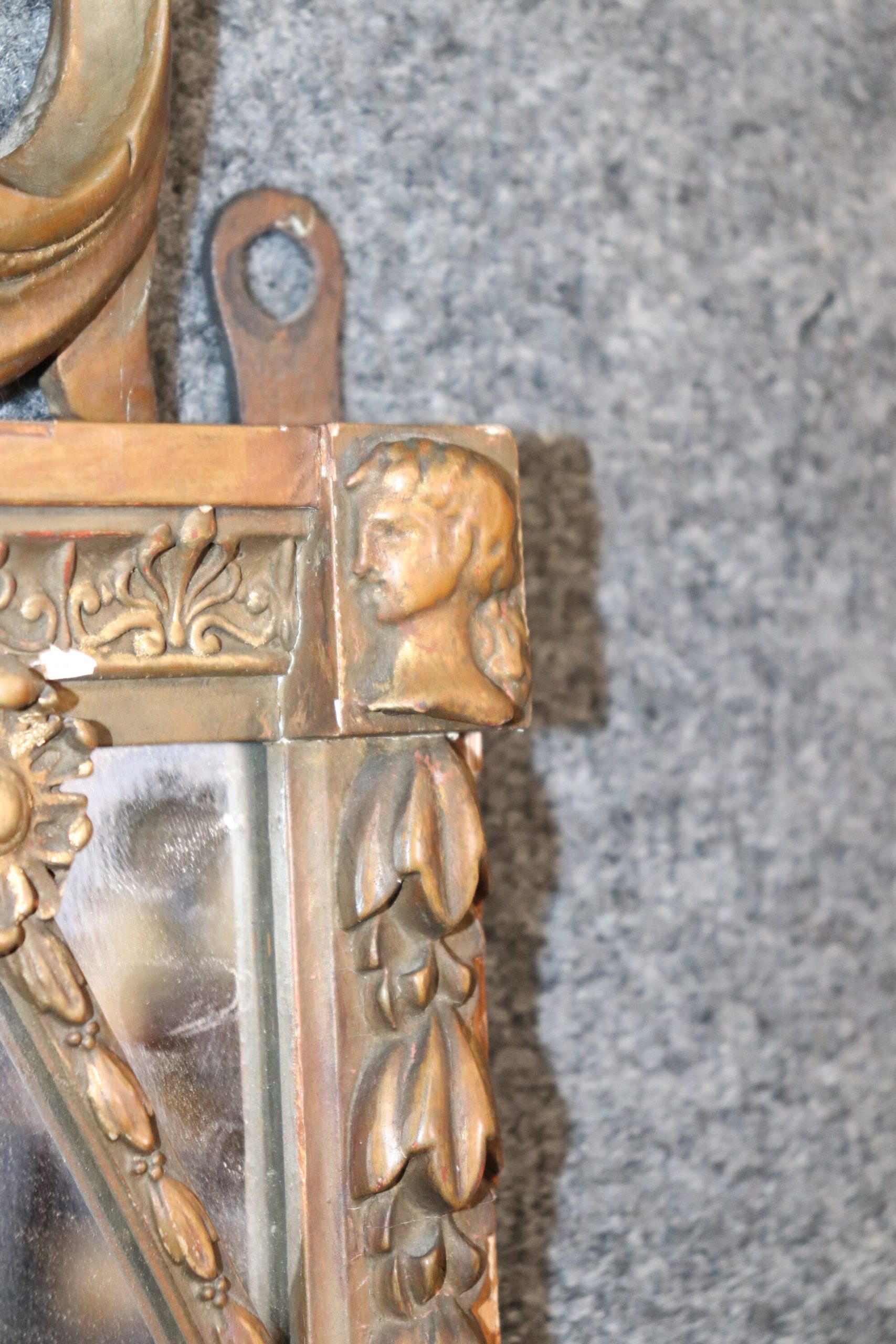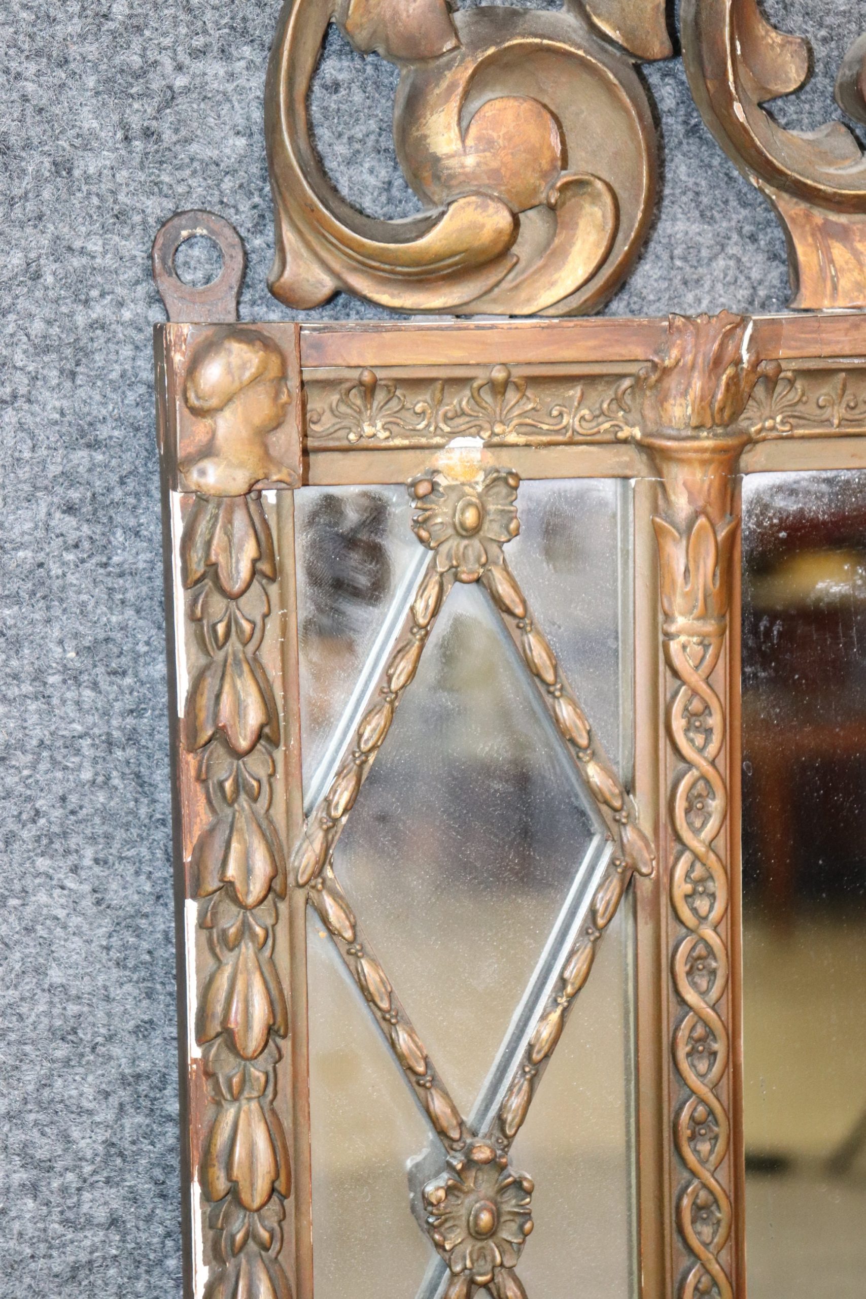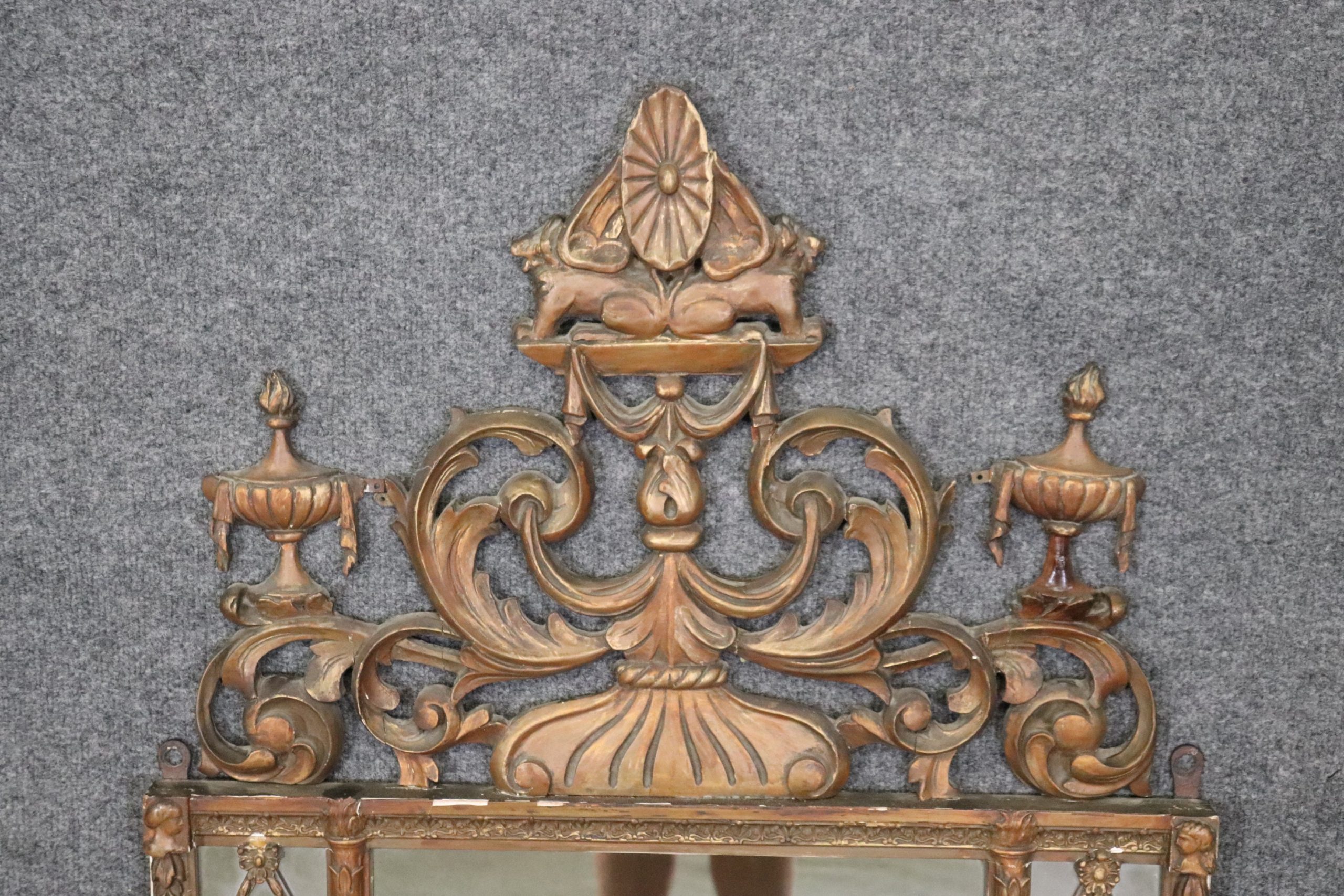 This French Regency style carved wood and gesso mirror is made of the highest quality and is perfect for you and your home! If you look at the photos provided you’ll see the detail in the carvings on the mirror. This mirror is perfect to be used as a hallway mirror, bathroom mirror, entryway mirror, living room mirror, or bedroom mirror and due to its simplistic design can be paired with a variety of other styles you may already have in your place of choosing! The mirror is in good vintage condition with light surface scratches and some minor scuffs but otherwise good condition considering age.