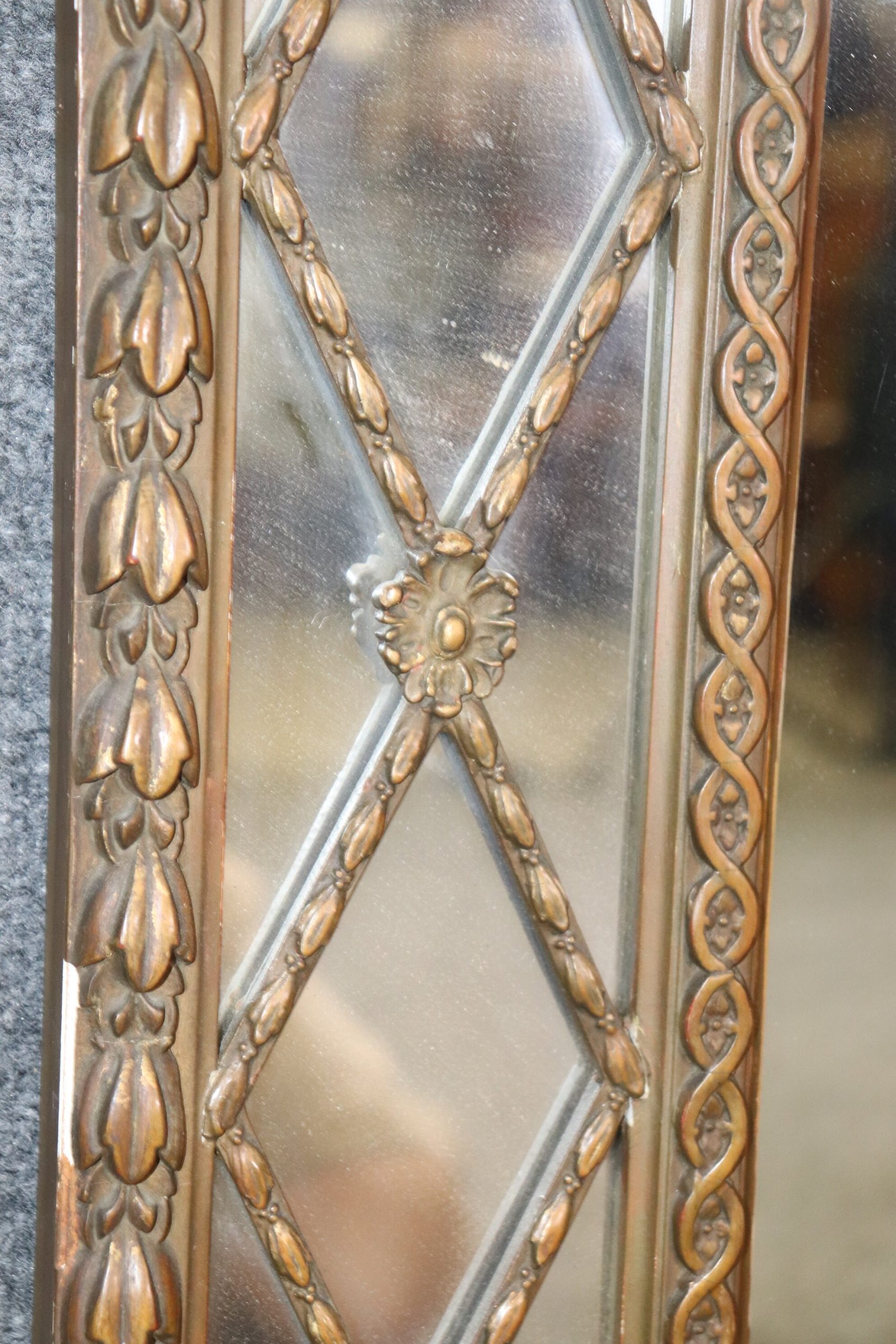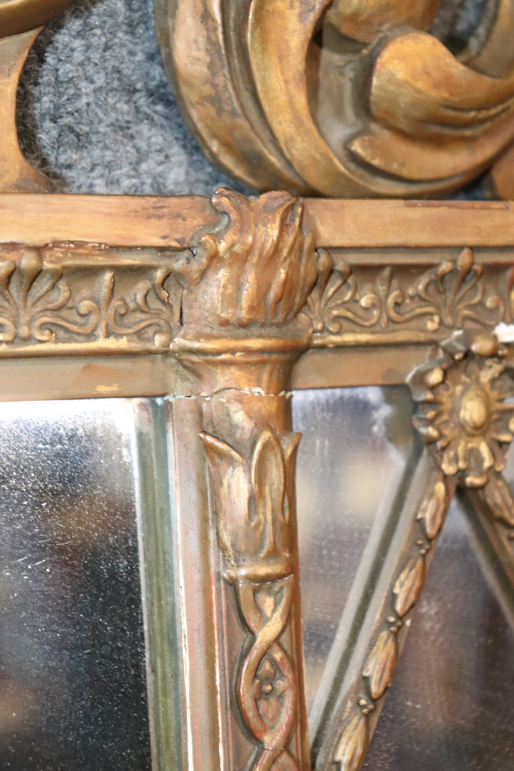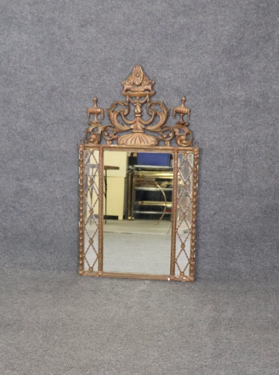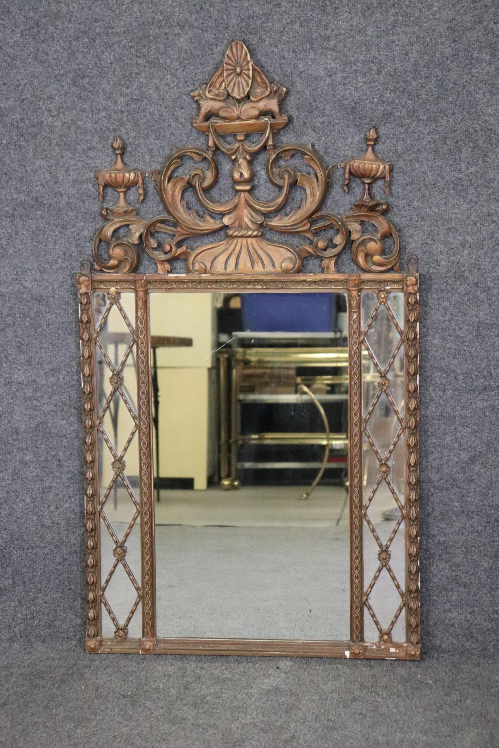 This French Regency style carved wood and gesso mirror is made of the highest quality and is perfect for you and your home! If you look at the photos provided you’ll see the detail in the carvings on the mirror. This mirror is perfect to be used as a hallway mirror, bathroom mirror, entryway mirror, living room mirror, or bedroom mirror and due to its simplistic design can be paired with a variety of other styles you may already have in your place of choosing! The mirror is in good vintage condition with light surface scratches and some minor scuffs but otherwise good condition considering age.