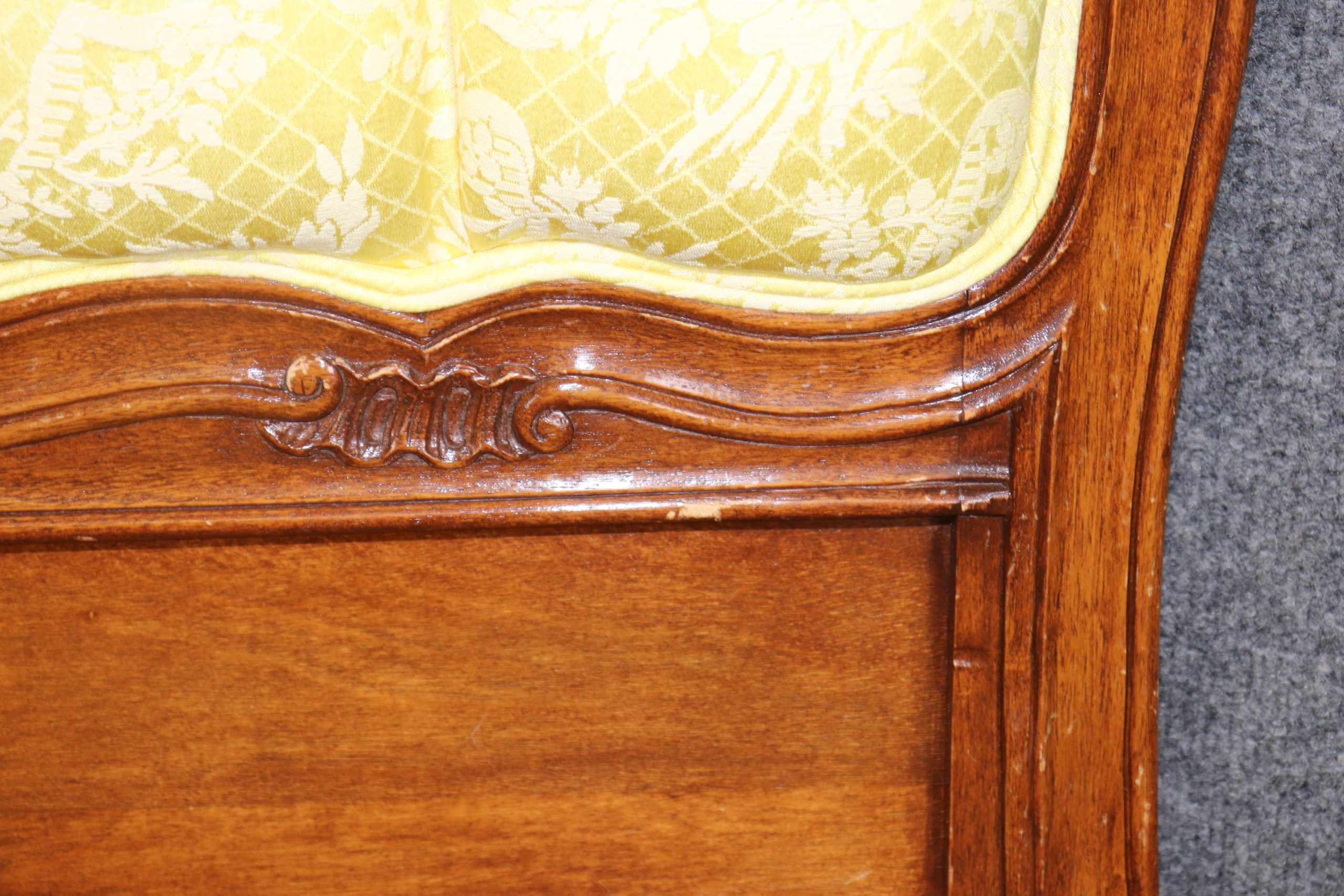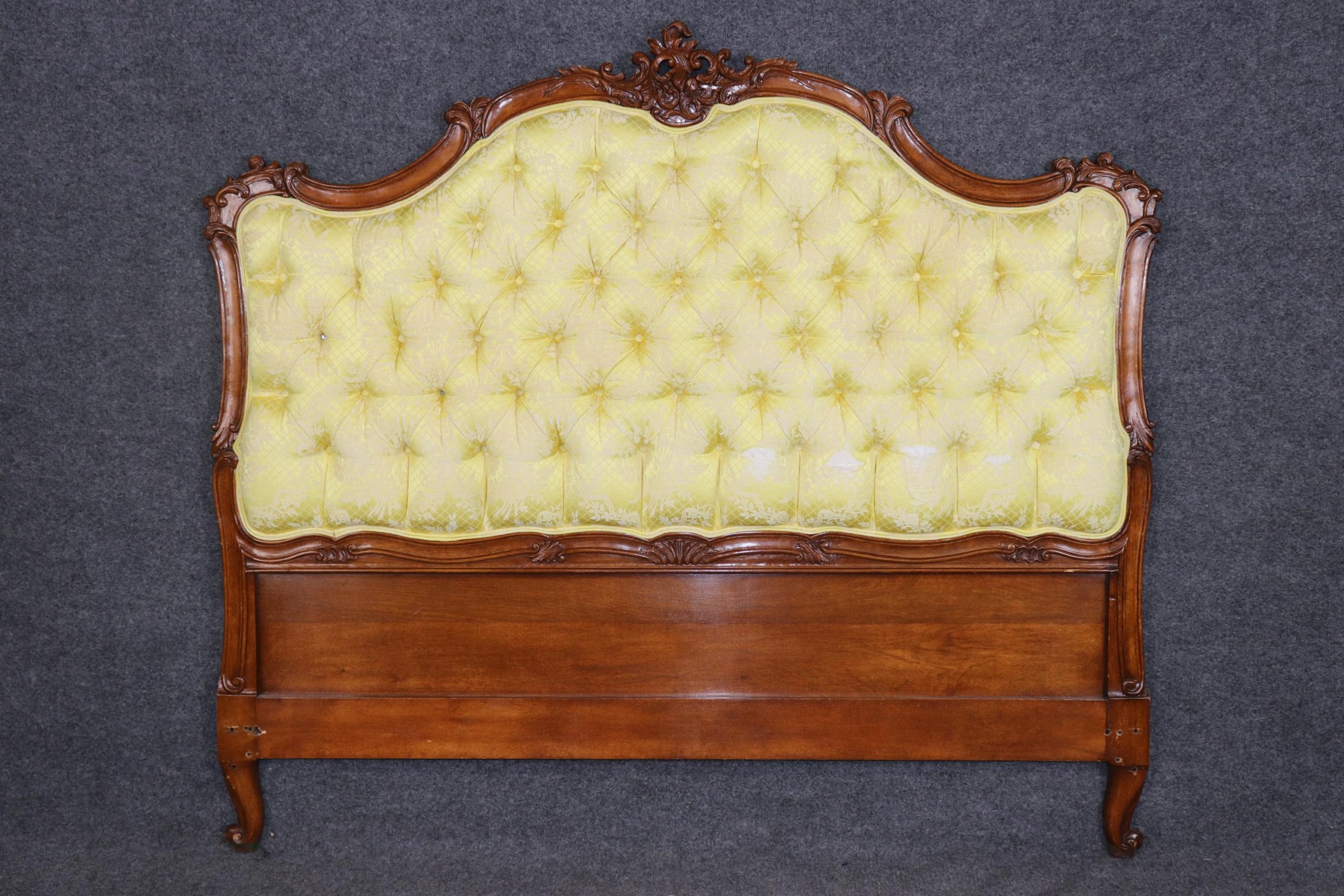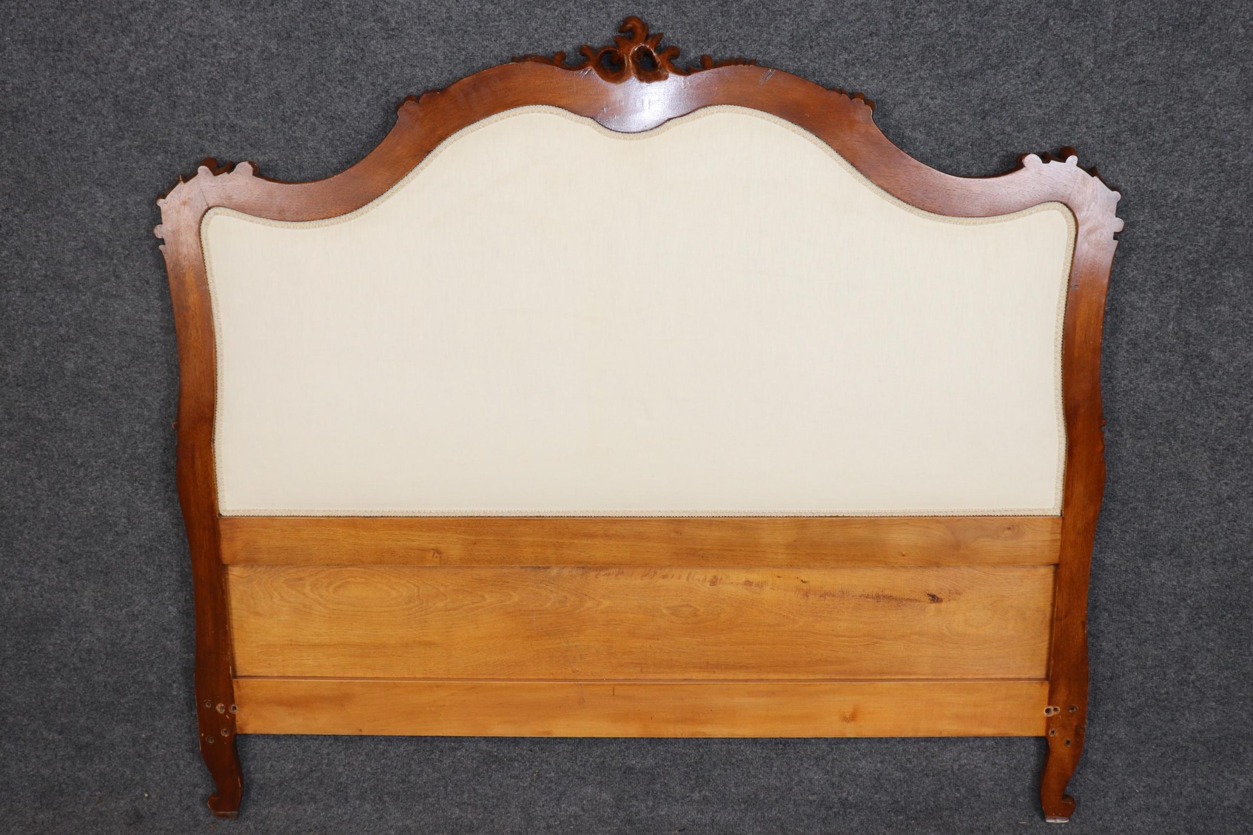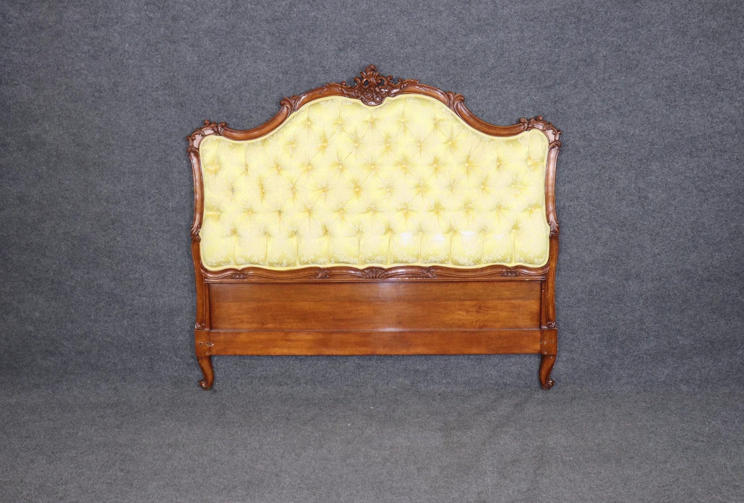 This vintage French Louis XV style carved upholstered headboard is made of the highest quality! If you look at the photos provided you can see the sophisticated upholstery. This piece is perfect for any bedroom or guest room as it can go with a variety of styles! This piece is will add a sense of luxury into your home and will definitely be a conversation starter! Antique furniture and vintage pieces have stood the test of time and this headboard is no exception! With its quality materials and great craftsmanship this piece is bound to last you and your family for many years to come. The headboard is in good vintage condition with the exception of some light surface scratches and minor imperfections as to be expected with vintage or antique items. The upholstery does show wear, and reupholstery is recommended.