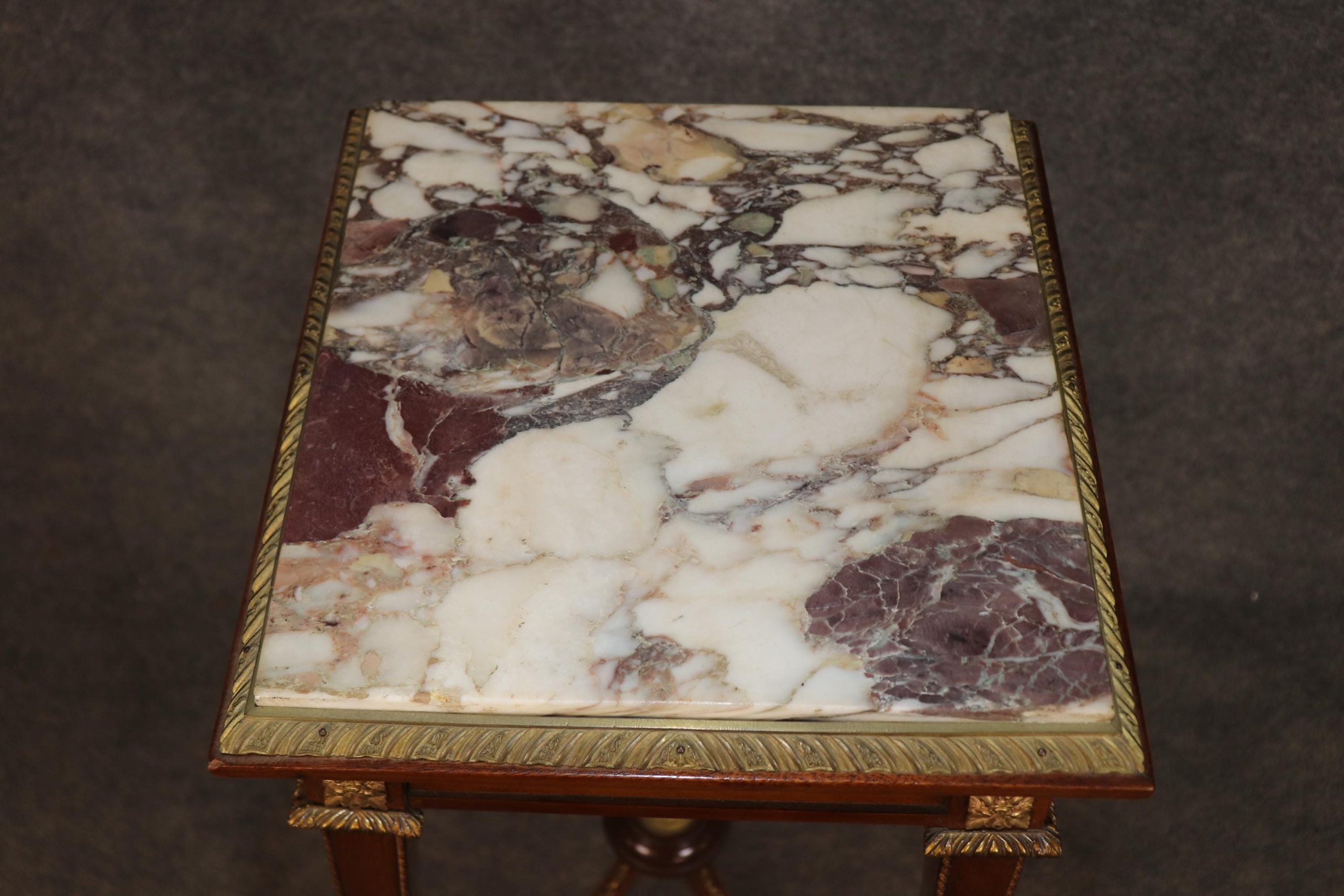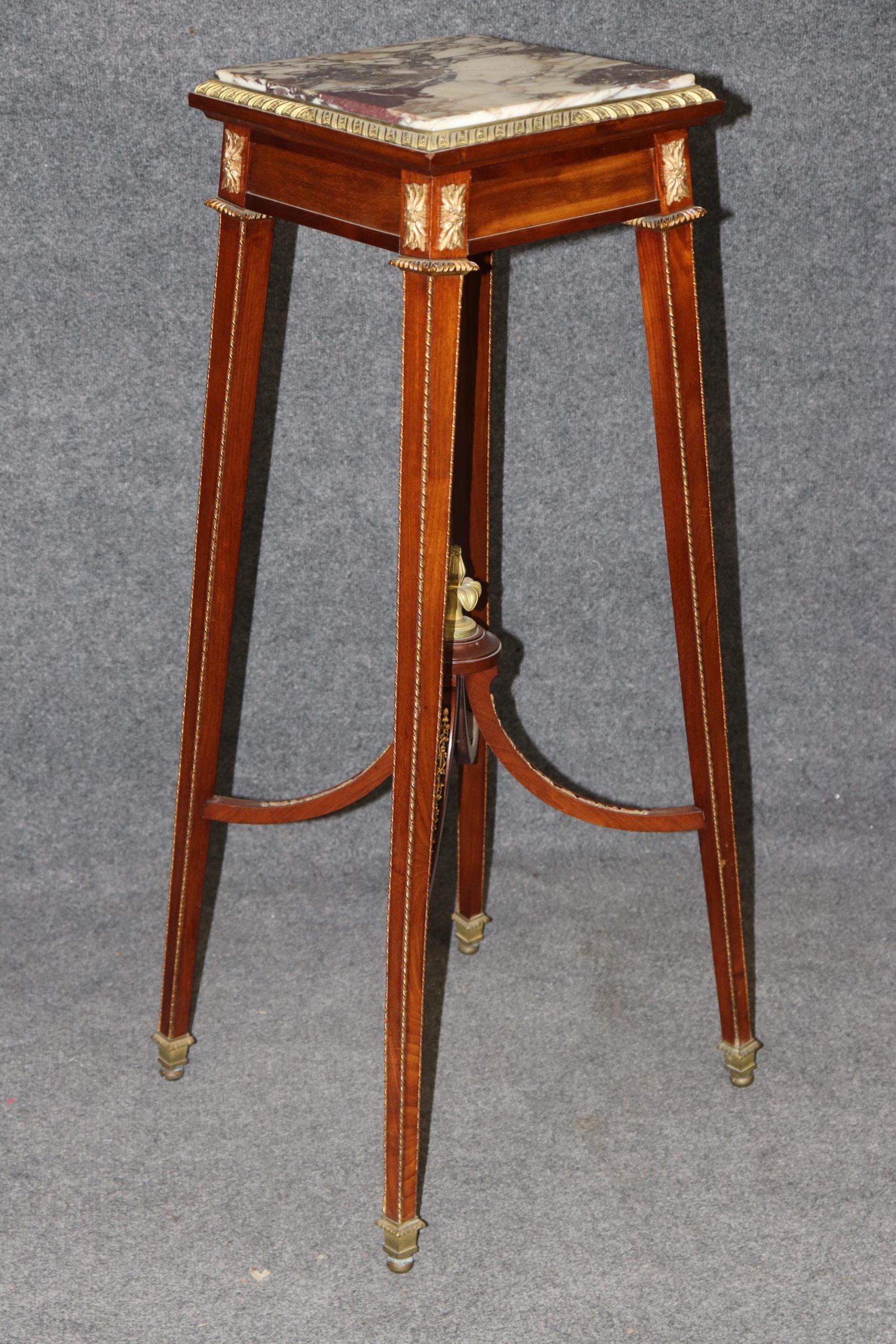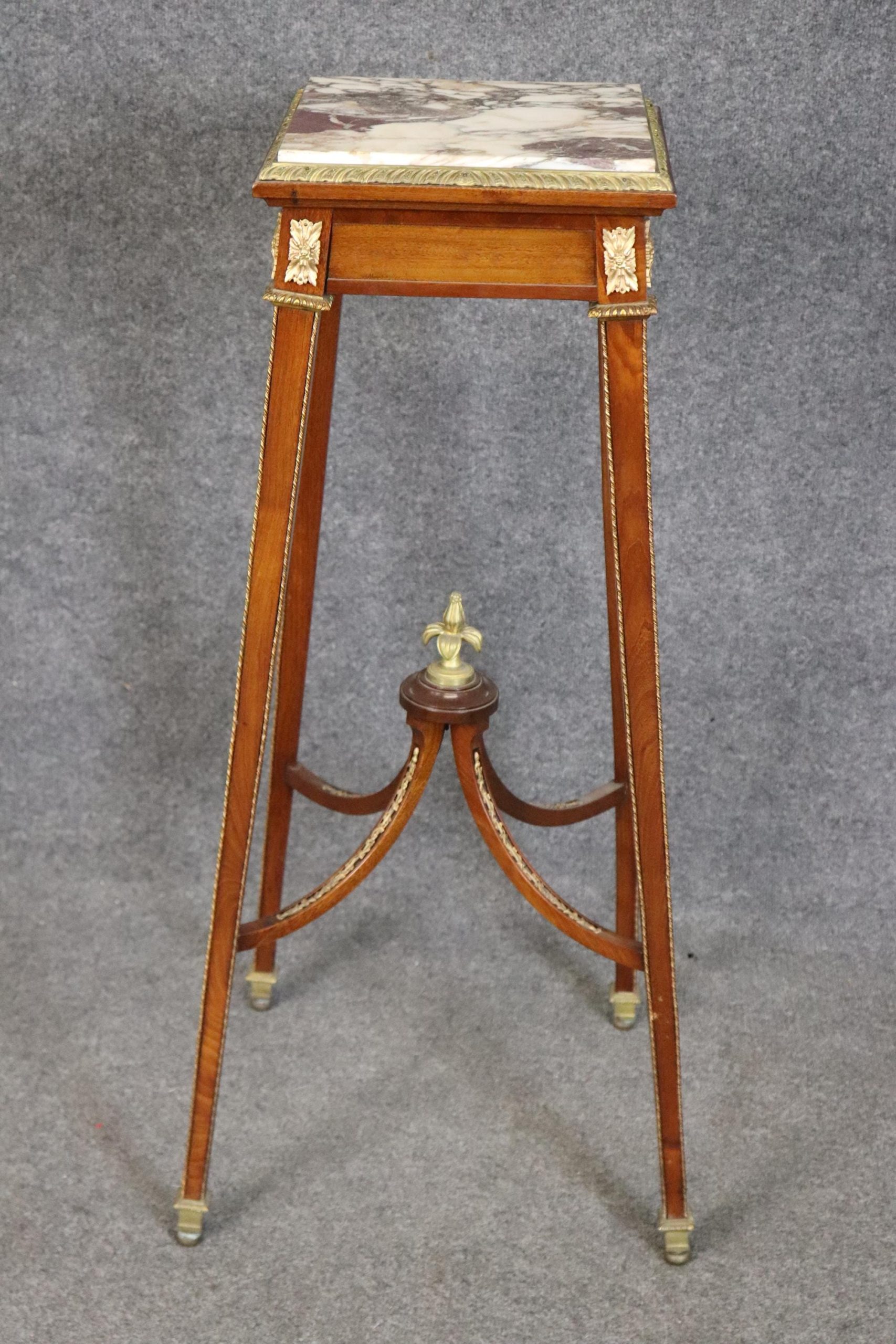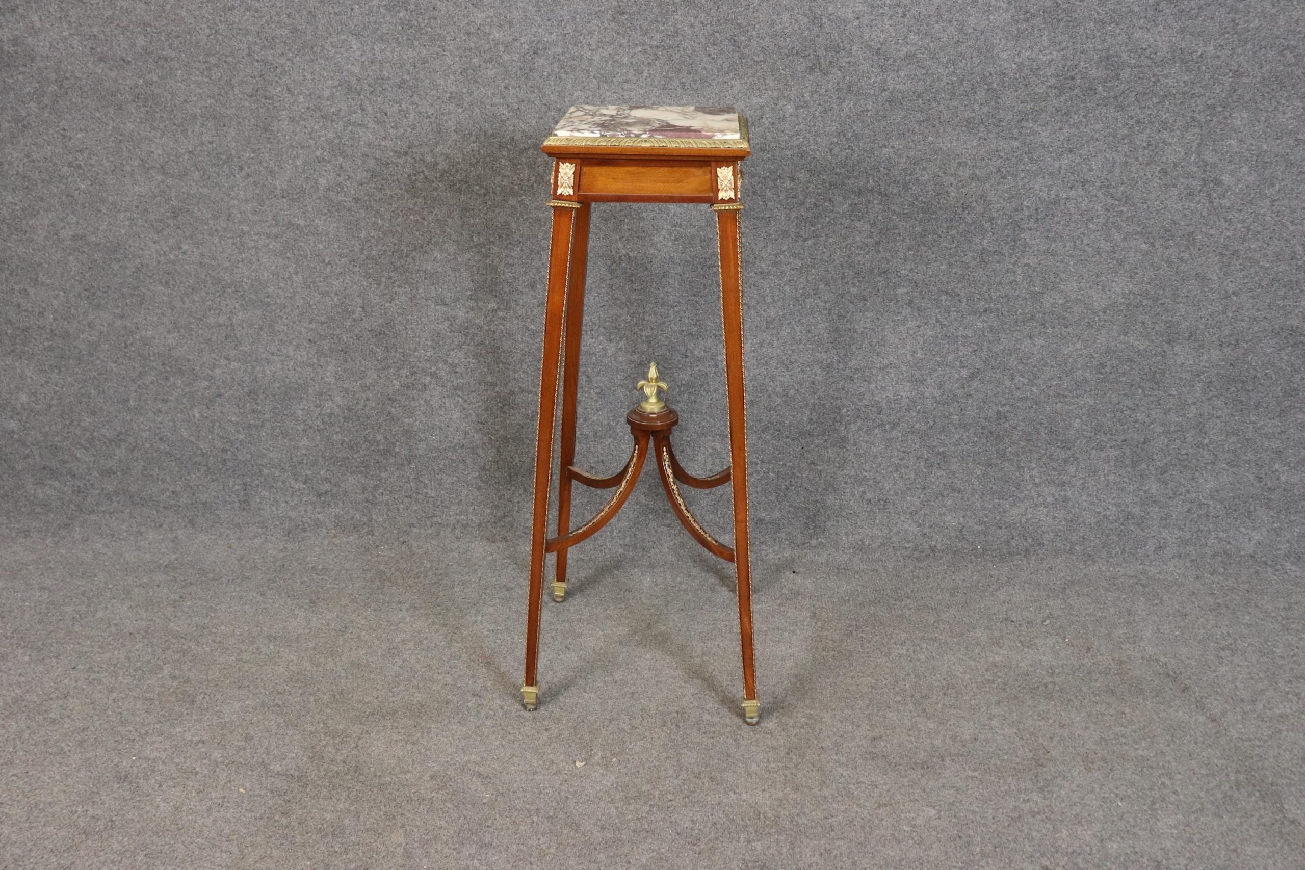 This French vintage Louis XV style bronze mounted marble top pedestal table / plant stand is perfect for you and your home! If you look at the photos provided, you can see the attention to detail in the bronze mounts. This piece is bound to bring a sense of minimalistic luxury into your home or place of choosing and is perfect for any entryway, living room, bedroom, bathroom or office! Antique furniture and vintage pieces have stood the test of time and pedestal is no exception! With its quality materials and great craftsmanship this is bound to last you and your family for many years to come. This piece is in good vintage condition with the exception of some minor finish loss and surface scratches as to be expected, but otherwise good condition.