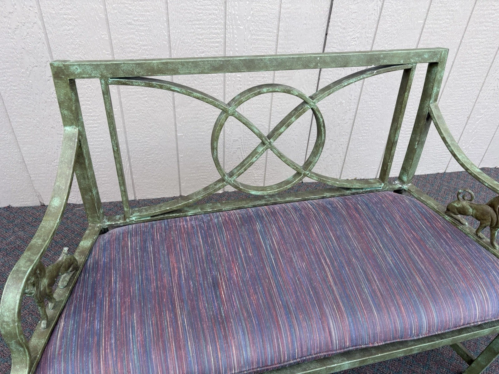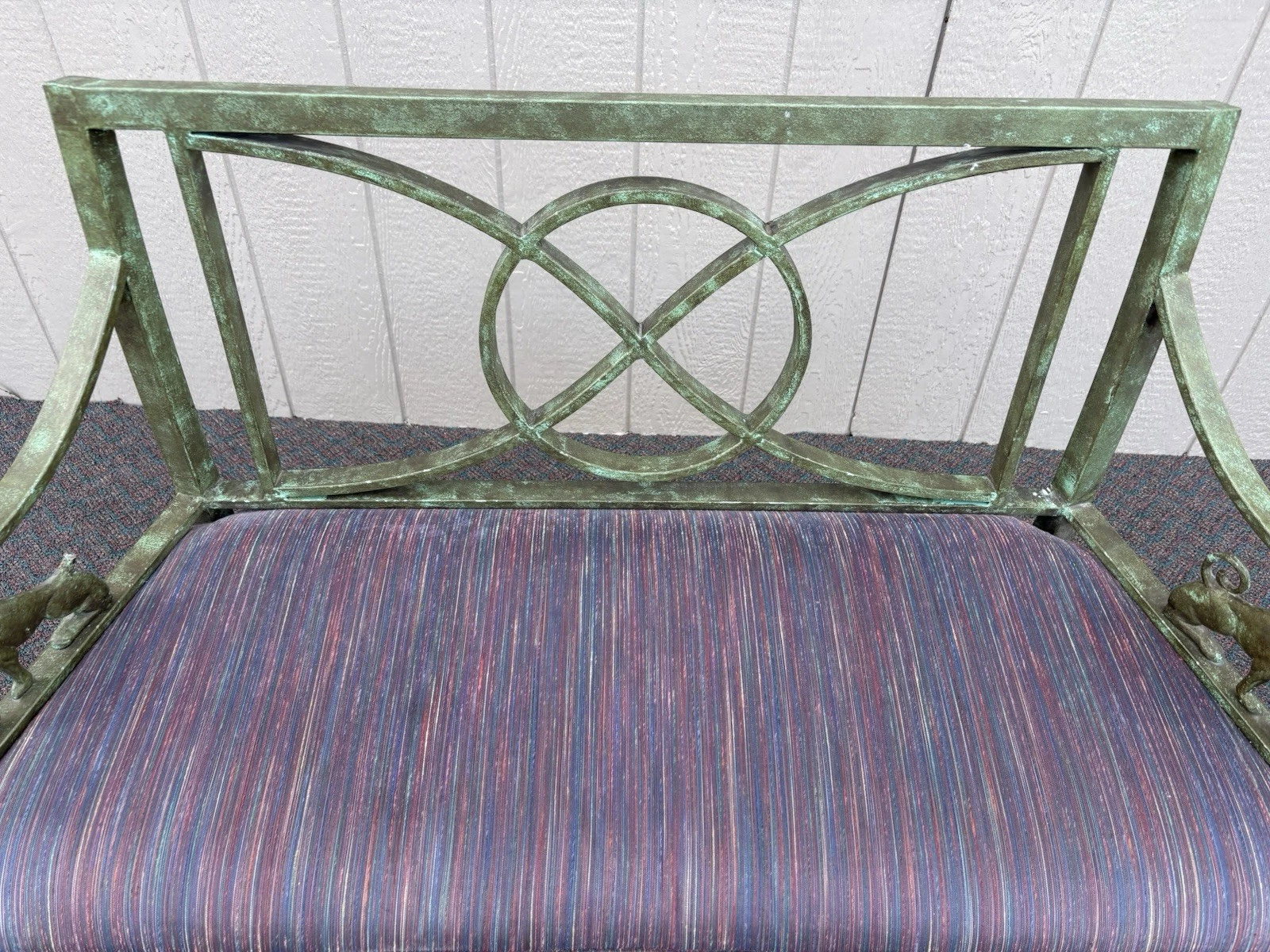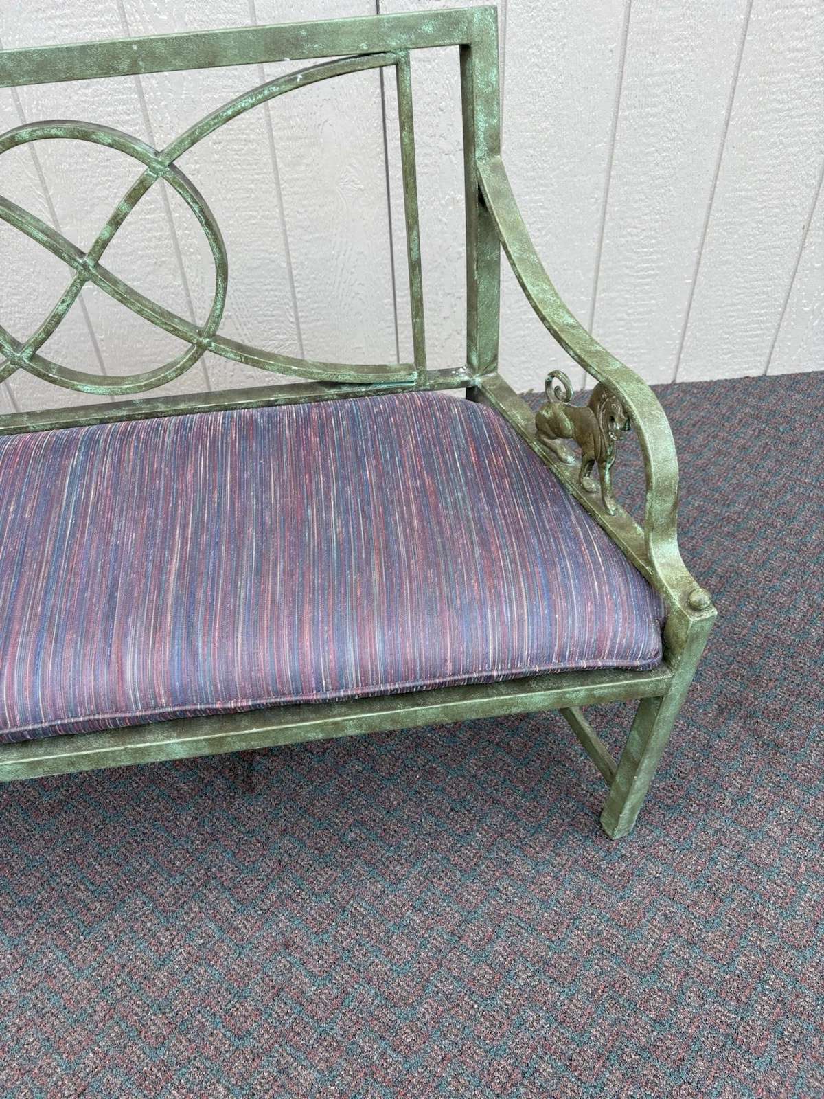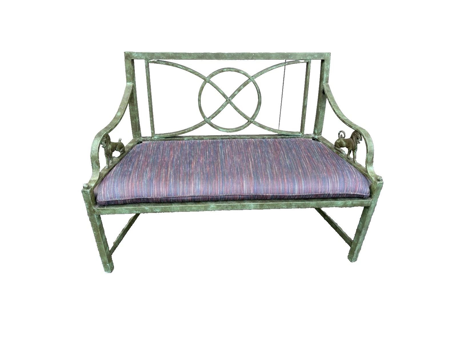 This charming metal settee, crafted in a delightful Victorian style, brings a touch of timeless elegance to any space. Its sturdy construction and vibrant multicolor finish showcase both durability and artistic flair, making it a perfect accent for your garden, porch, or living room. With enough seating for two, it invites cozy conversations and leisurely moments. Each curve and detail reflects the craftsmanship of its era, offering a unique piece that combines functionality with a warm sense of nostalgia. There a small piece of the gryphons tail missing as per pictures.