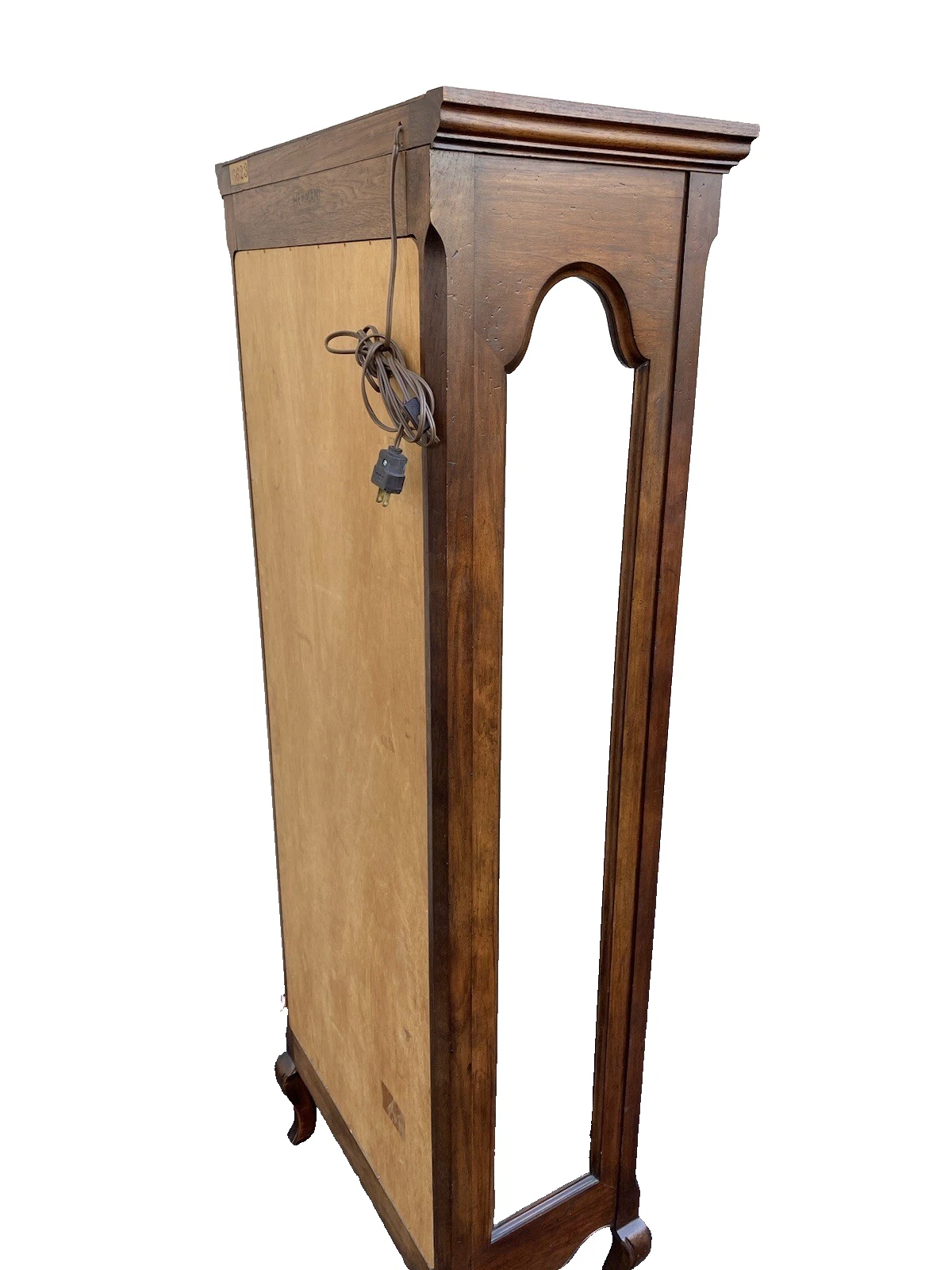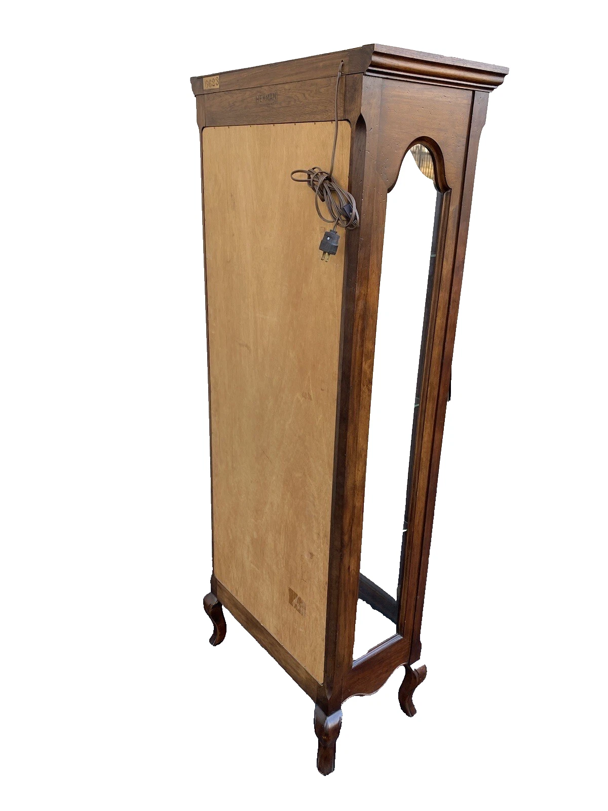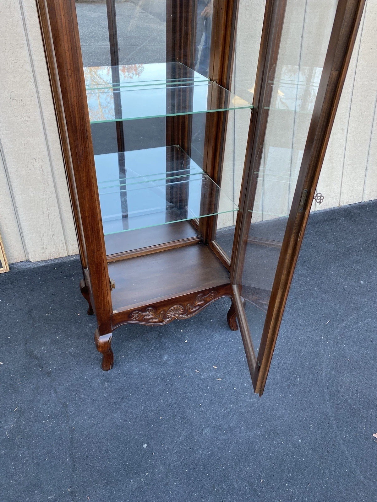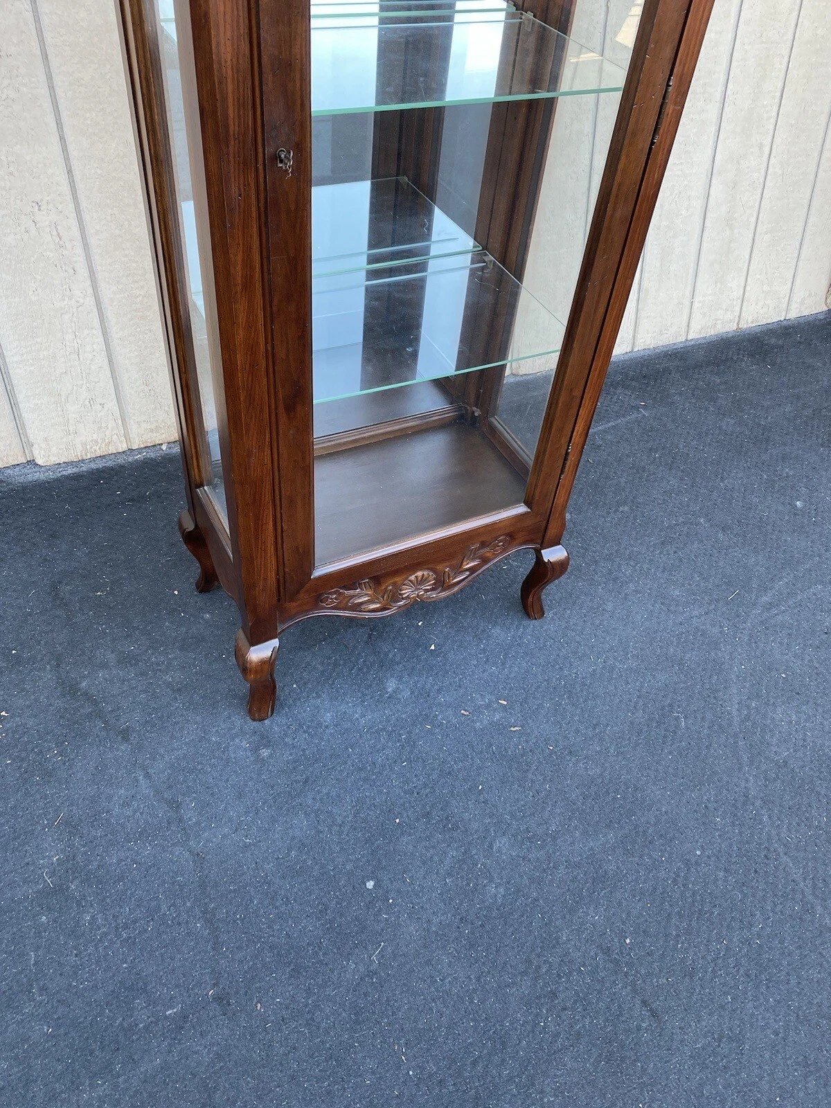 This exquisite Hekman Louis XV lighted curio china cabinet beautifully marries classic elegance with practical functionality. Crafted with meticulous attention to detail, the cabinet features graceful curves and intricate carvings, showcasing the artistry of the Louis XV style. With three spacious shelves illuminated by soft lighting, it provides an ideal showcase for your cherished collectibles or heirlooms. Its sturdy construction and timeless design make it a perfect addition to any home, inviting warmth and sophistication into your space.