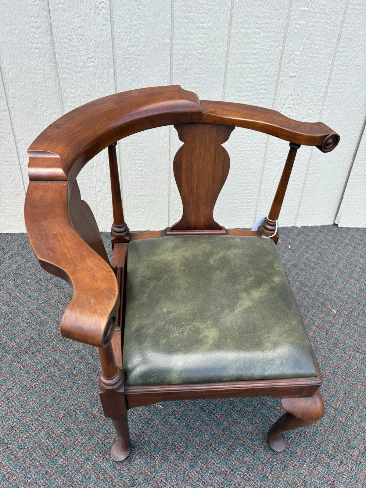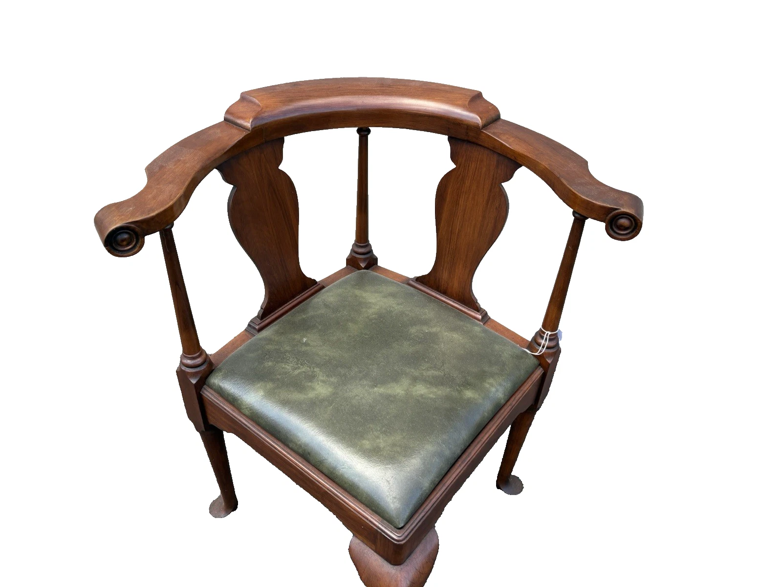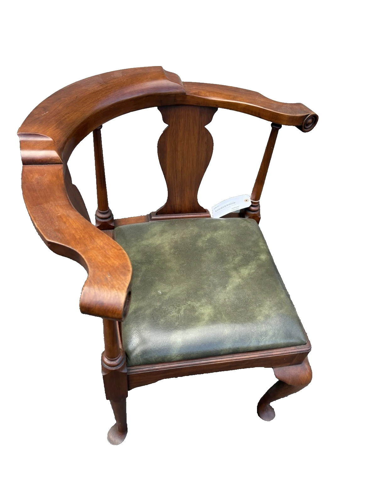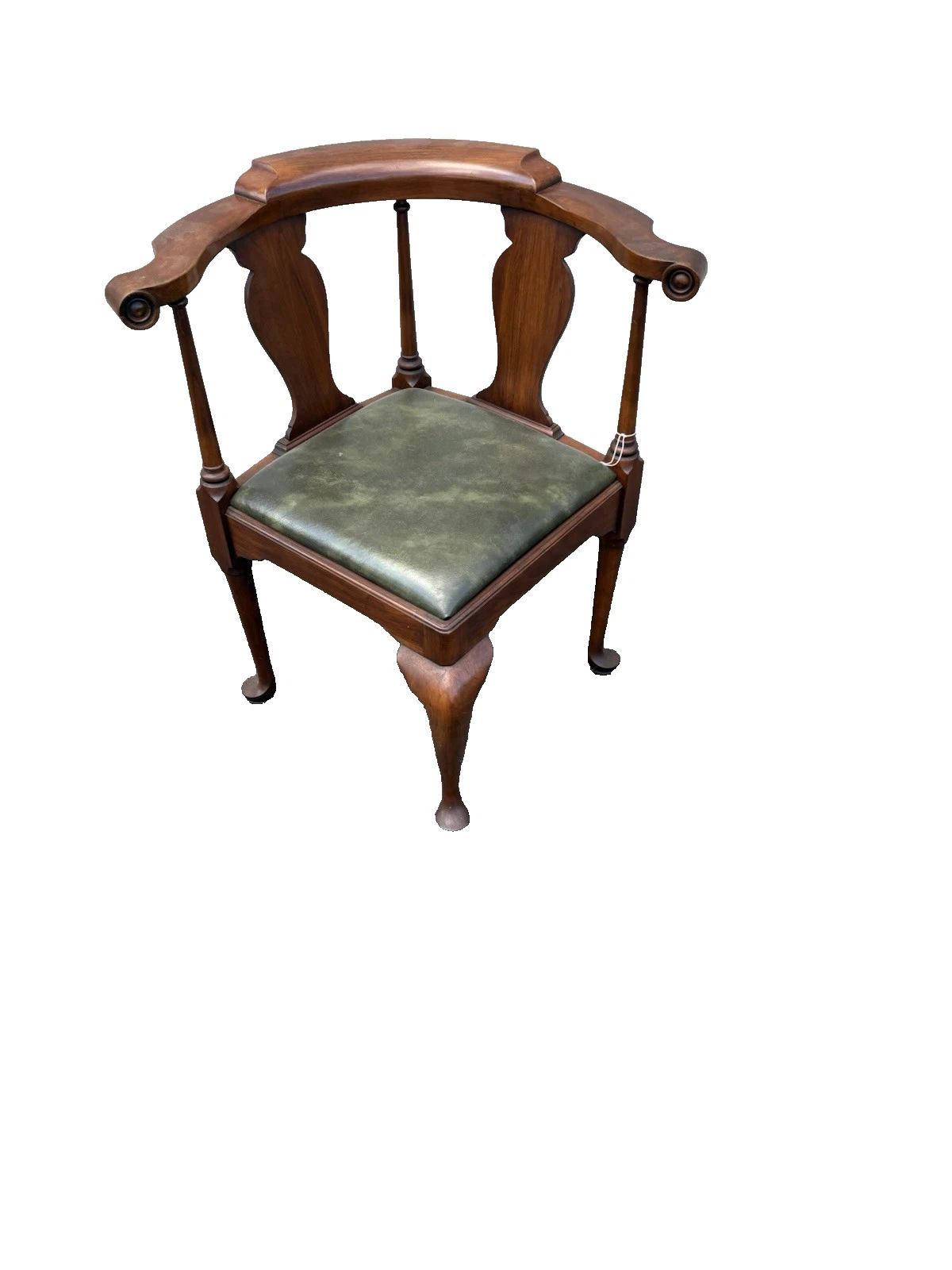Embodying the timeless elegance of the Queen Anne style, this Henkel Harris corner chair showcases the rich, warm tones of solid black cherry wood, inviting you to settle in and enjoy its welcoming embrace. Handcrafted with meticulous attention to detail, its sturdy construction promises both comfort and durability for years to come. The charming design features gracefully curved lines and a cozy seat that fits snugly into any corner, making it a delightful addition to your home. With a touch of history and a story to tell, this piece is perfect for those who appreciate the artistry of fine furniture.
