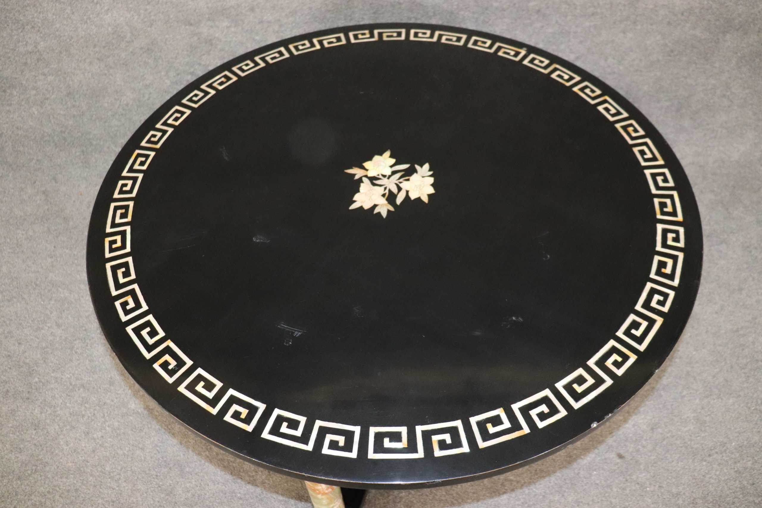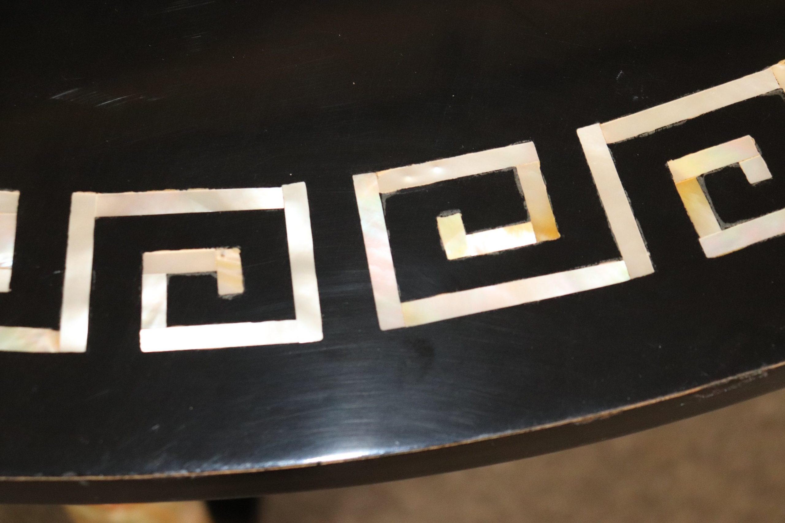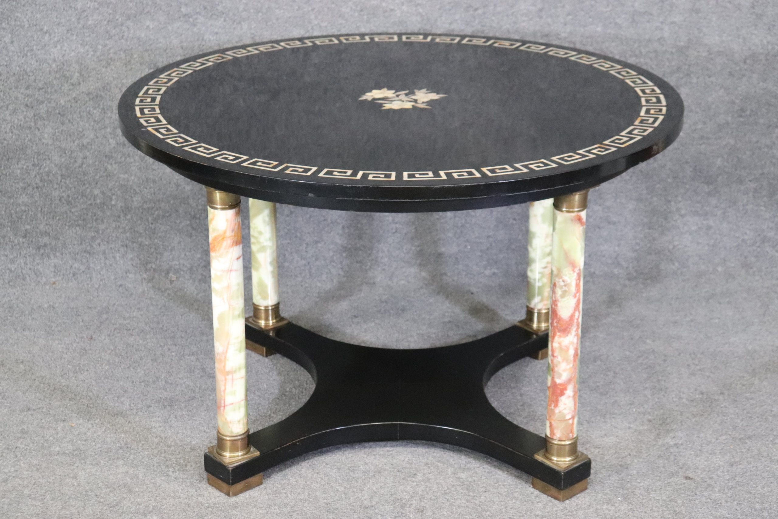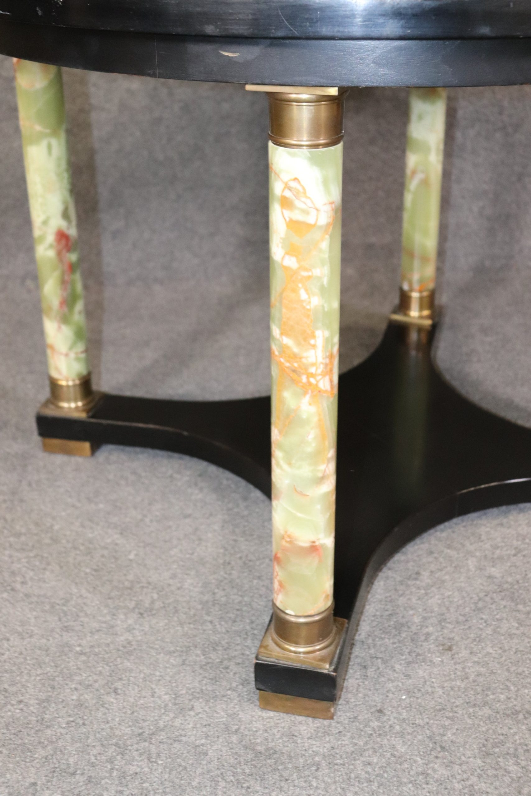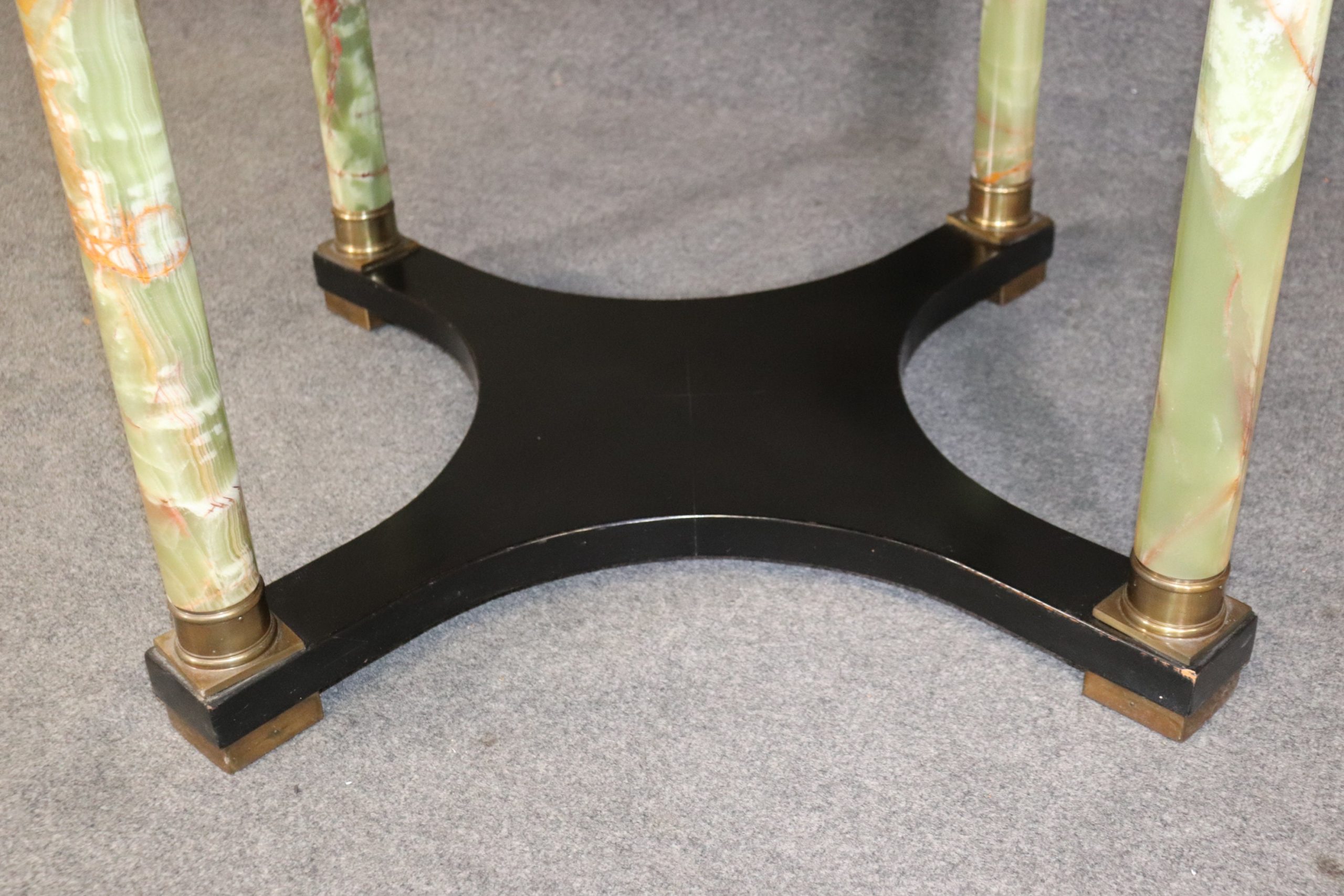 This Italian Art Deco ebonzied inlaid center table with green onyx pillars is truly an incredible piece that is a prime example of what some of the highest quality furniture of the mid 20th century entails. This Art Deco center table is equipped beautiful inlaid decorations. This center table is bound to bring a sense of luxury and elegance into your home or place of choosing and will surely separate your home decor from any others and bring your homes style to another level. This table is perfect for any entryway, living room, office or any place of your choosing! The center table is in good vintage condition with the exception of some minor surface scratches and some minor wear to finish but otherwise good condition.