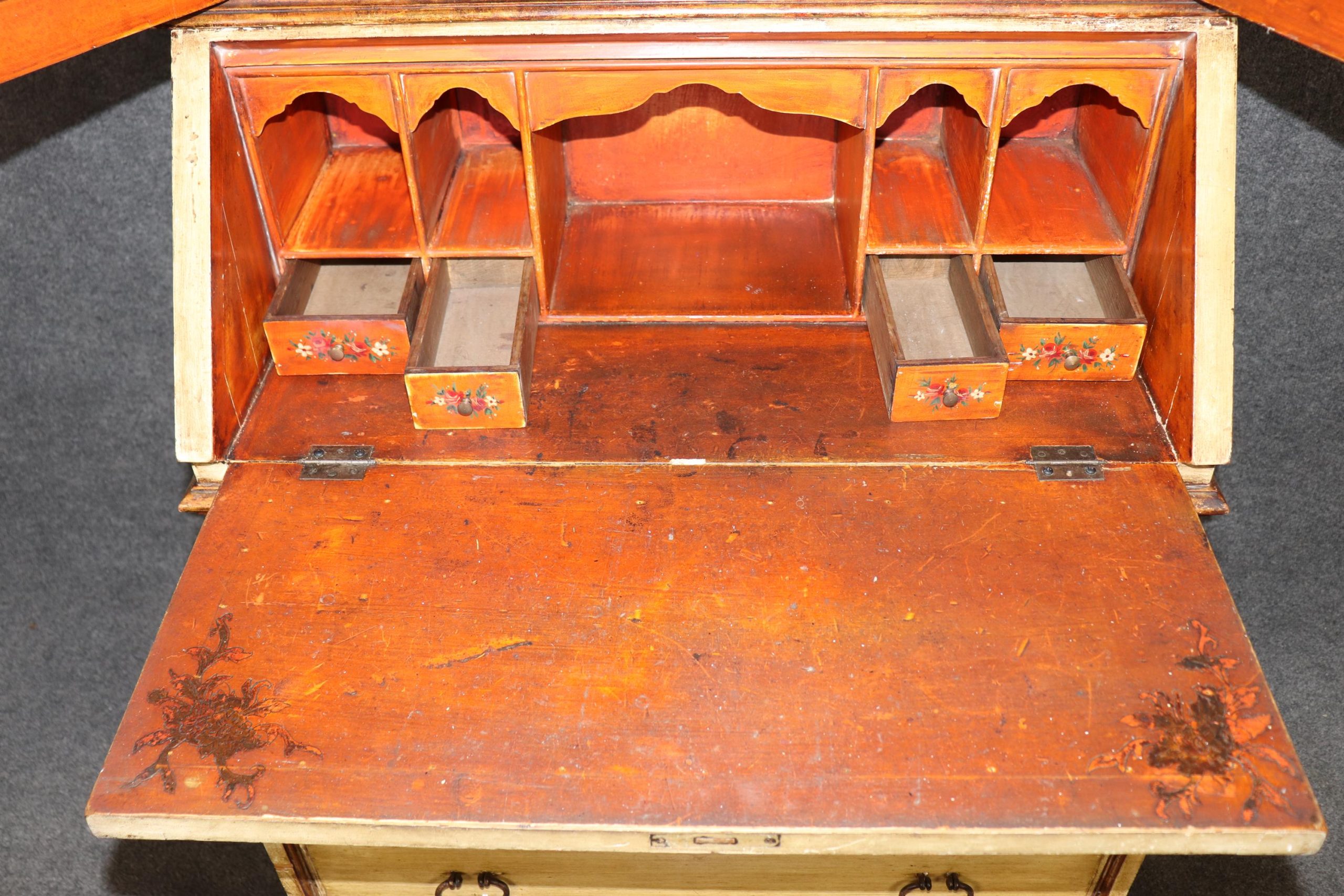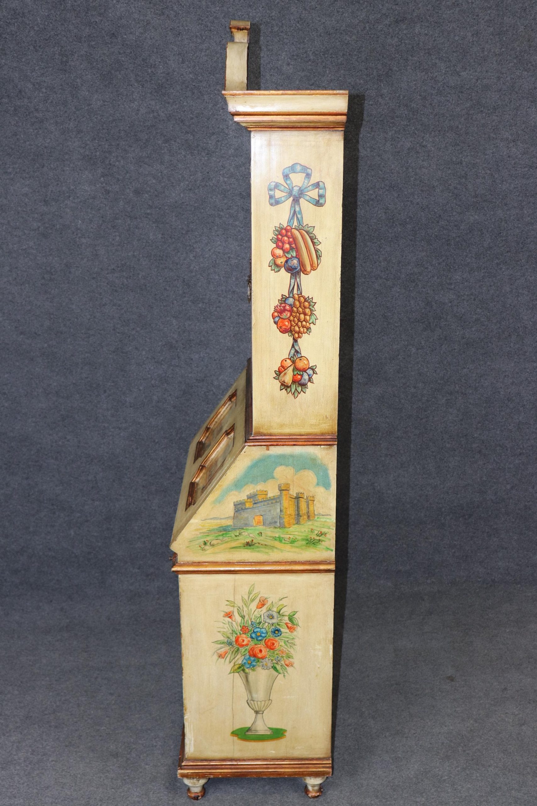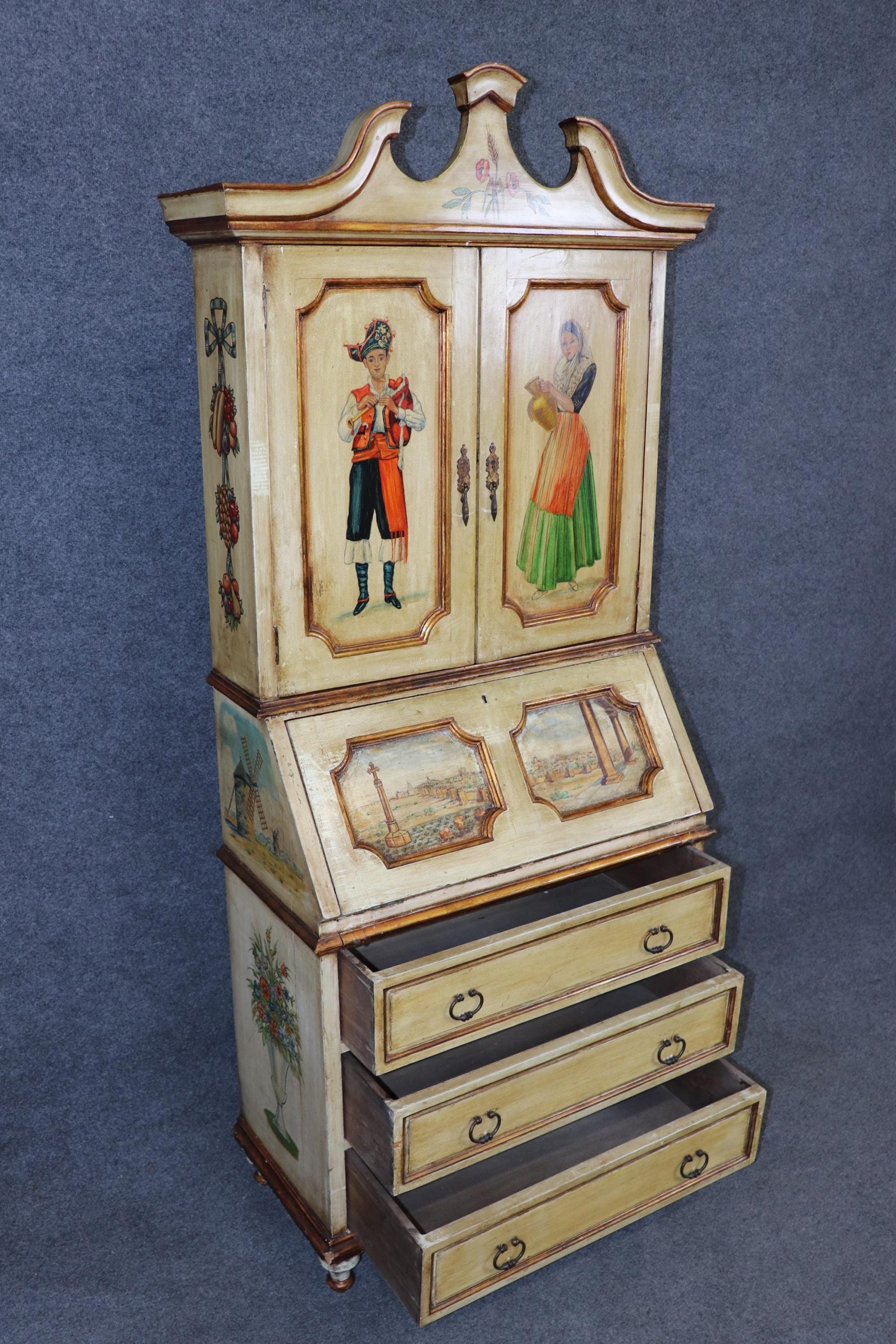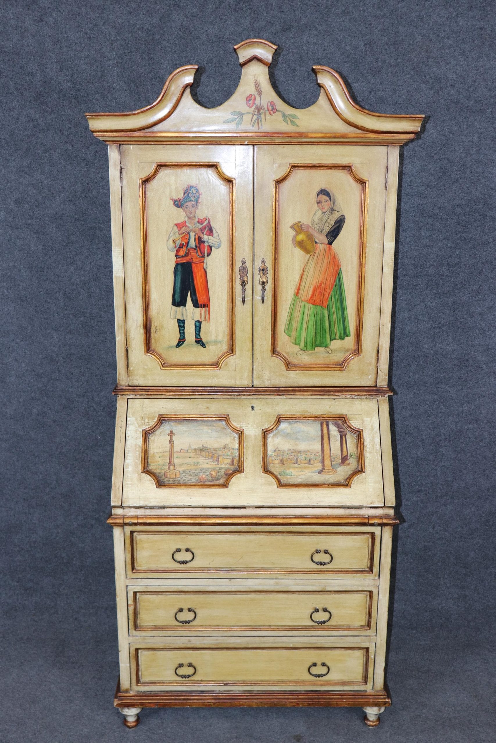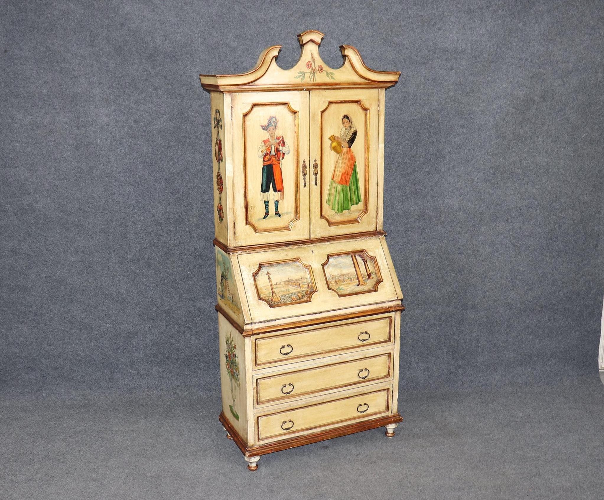 Whether you’re looking for a statement piece of vintage Italian craftsmanship or a functional yet highly decorative desk, this enchanting Venetian secretary offers timeless beauty, storied elegance, and enduring charm. The piece is in good antique/vintage condition with the exception of some light surface scratches, Minor finish loss and normal age related wear. As to be expected with items of age and use. The piece is intentionally distressed.
