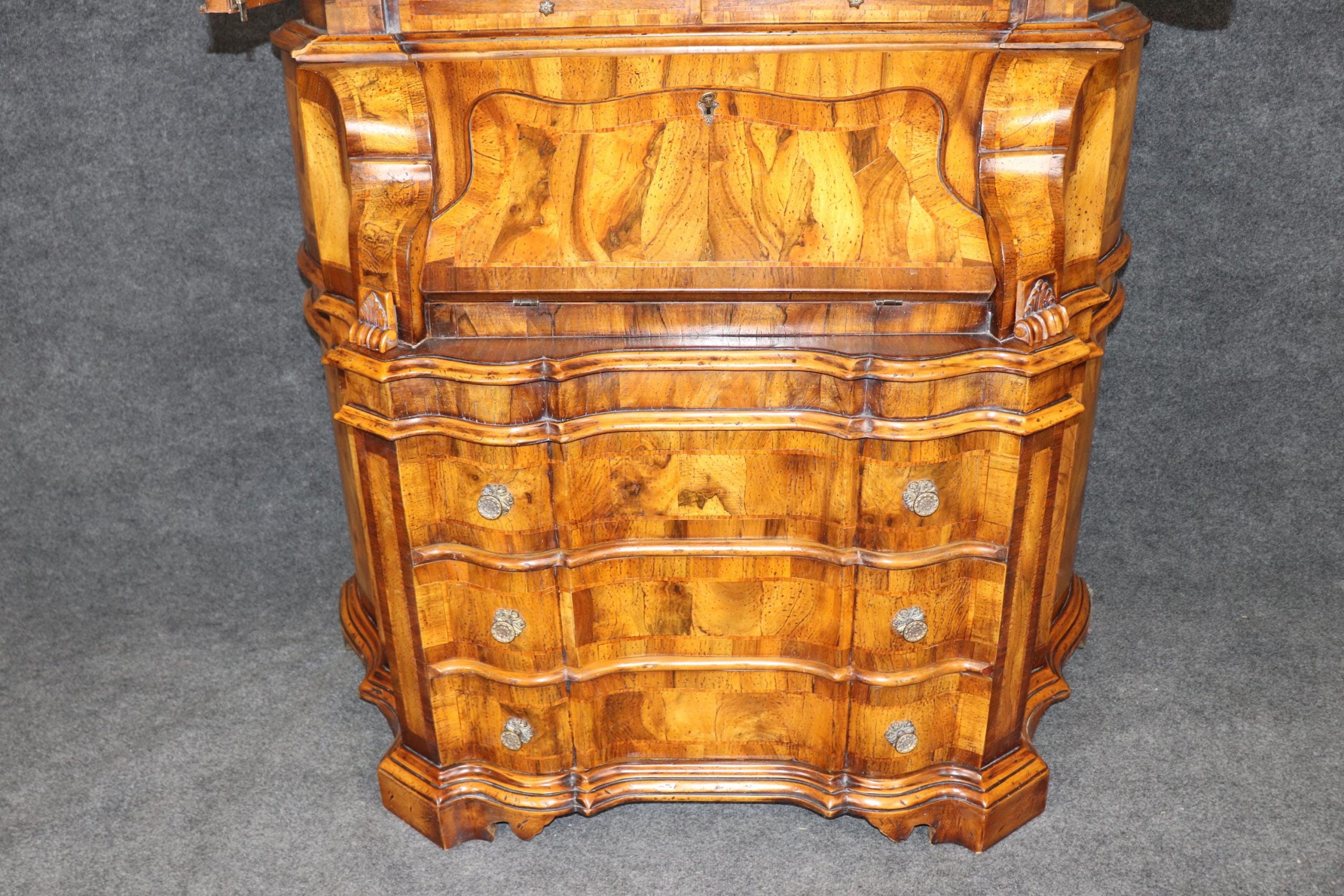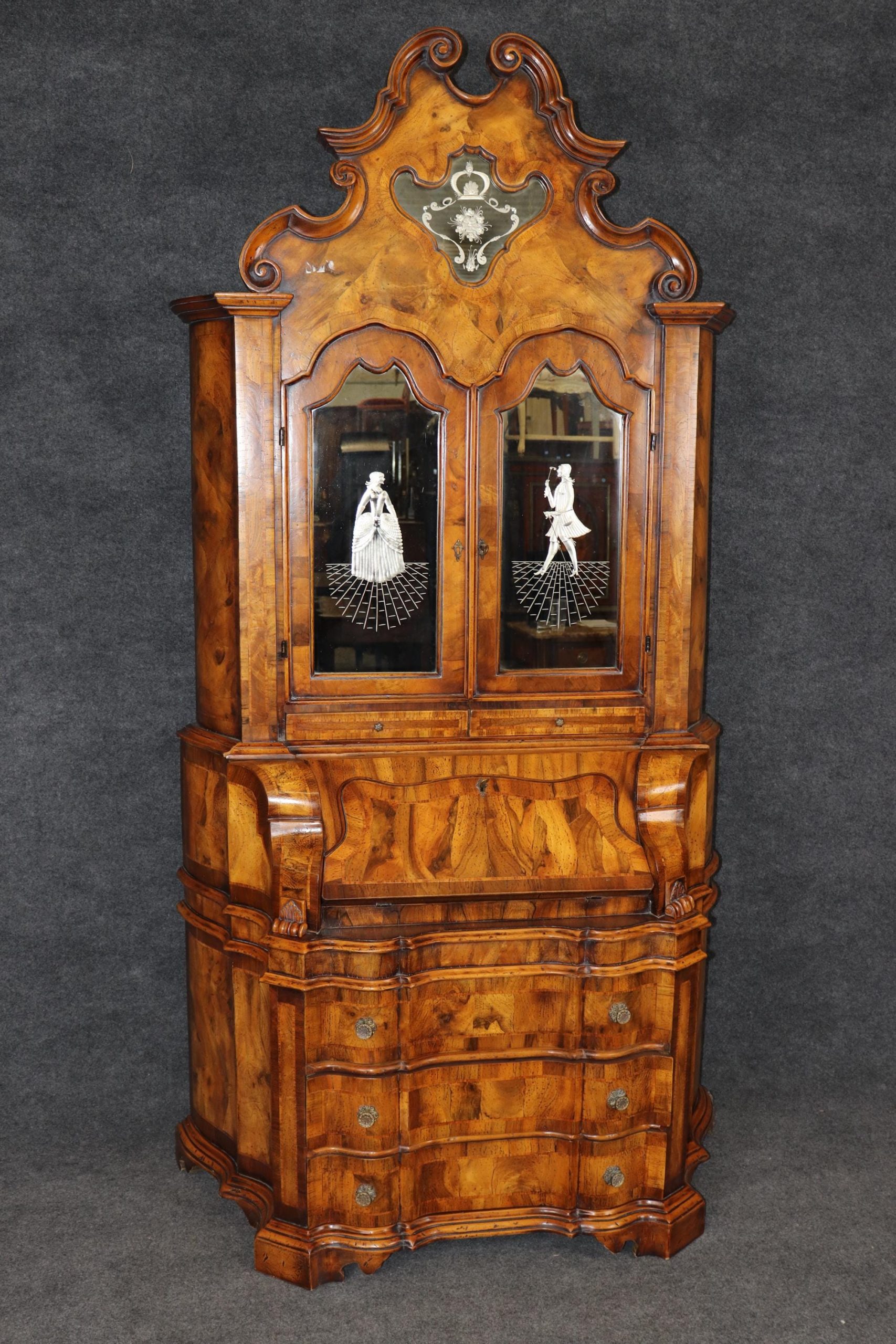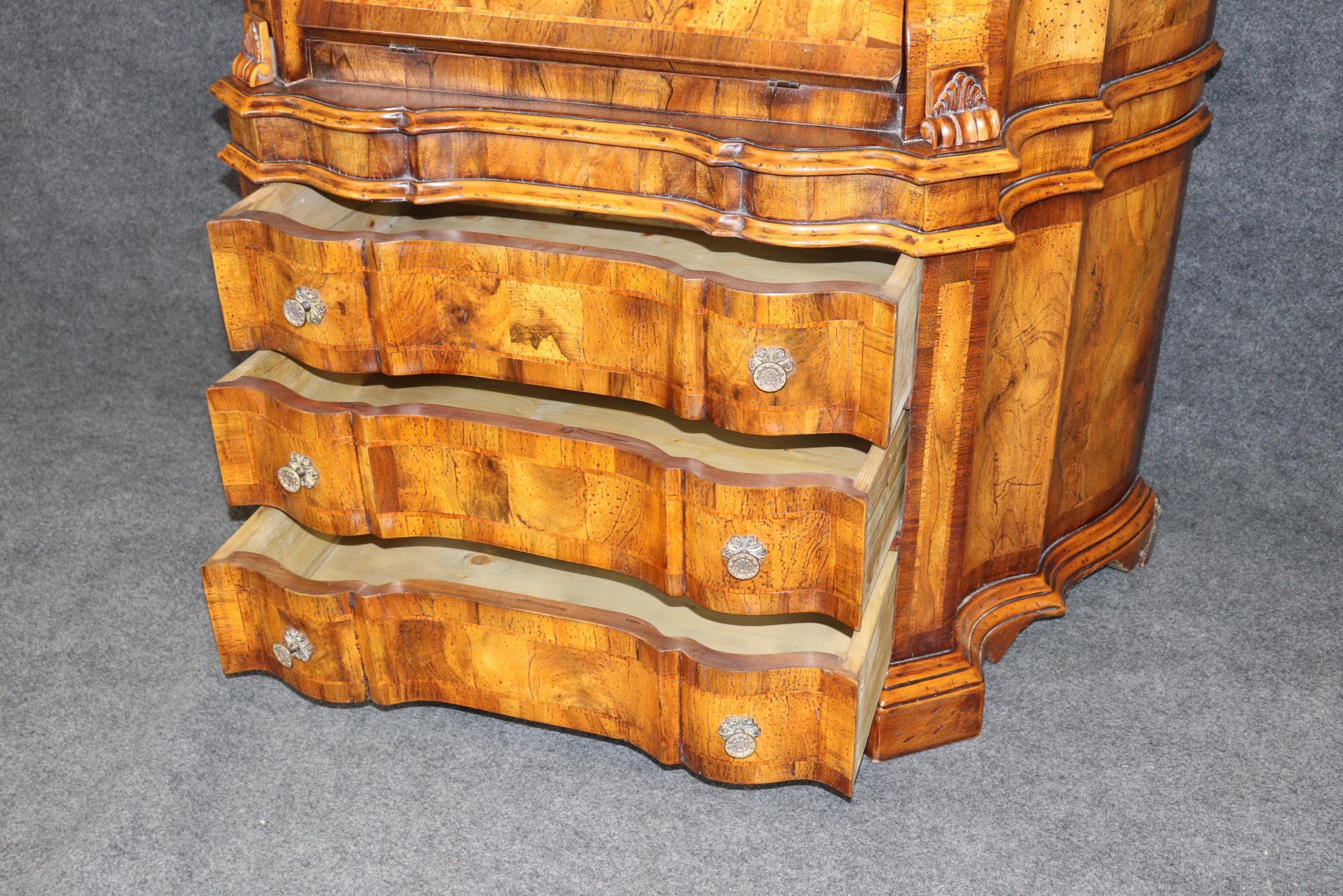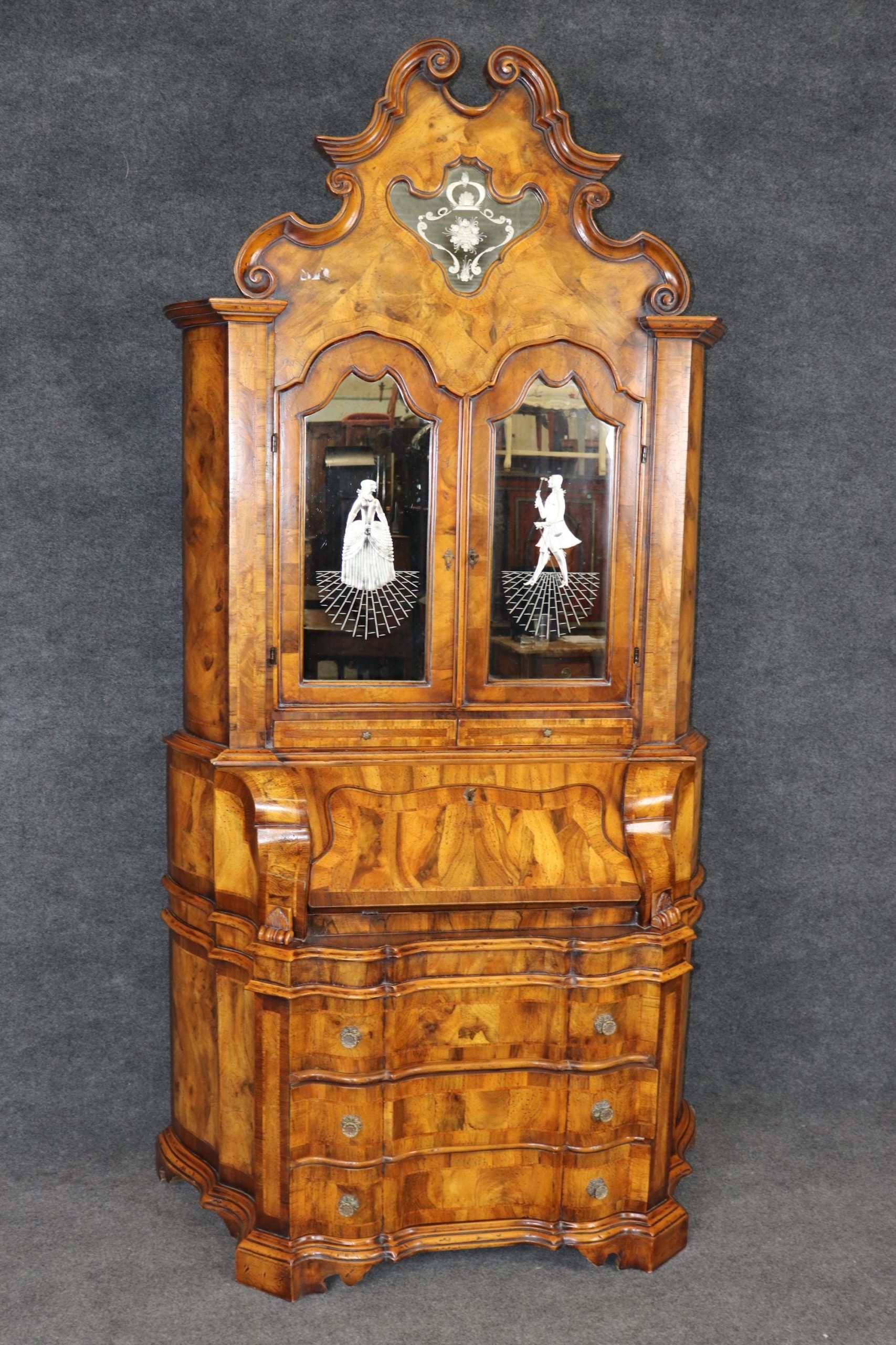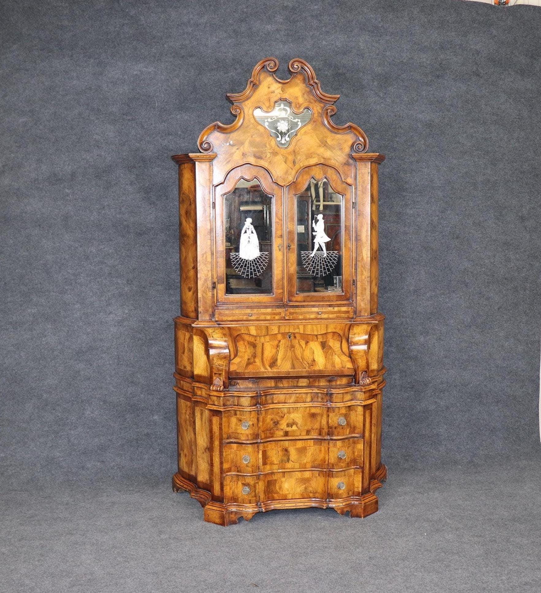 This vintage Italian bombe secretary desk is made of the highest quality! If you look at the photos provided, you can see the beautifully etched mirror panels. This piece is perfect for any living room, bedroom, office, kitchen or large bathroom and is equipped with 3 drawers, perfect for storing your personal belongings all while bringing a sense on luxury and class into your home! This piece is bound to bring a sense of creativity and character into your home or place of choosing and will surely have your guests mesmerized by its attention to detail. Antique furniture and vintage furniture have stood the test of time and this piece is no exception! With its quality materials and great craftsmanship, this desk will last you and your family many years to come. The secretary is in good vintage condition with minor surface scratches and wear, as to be expected with a vintage item.