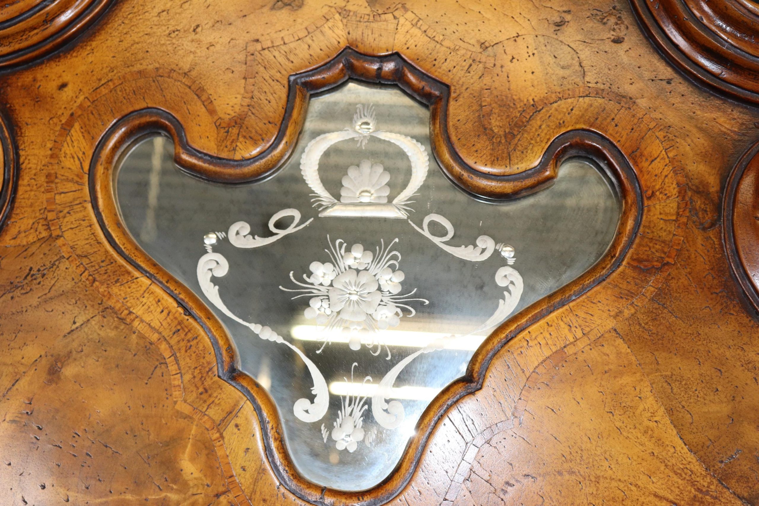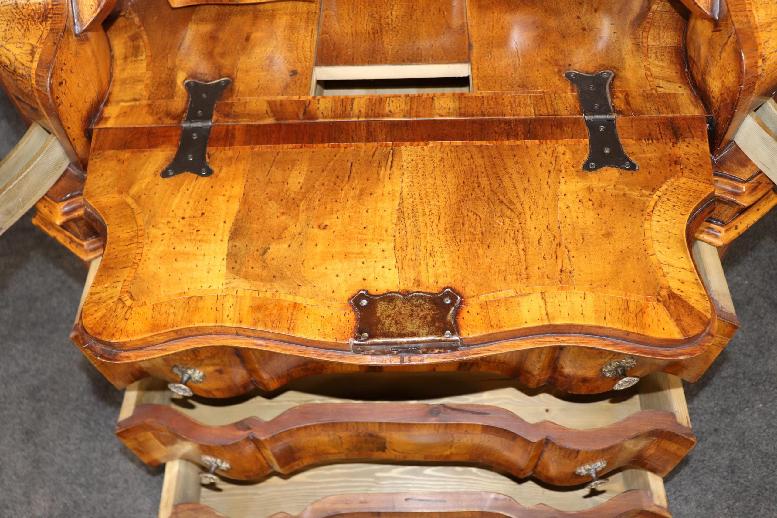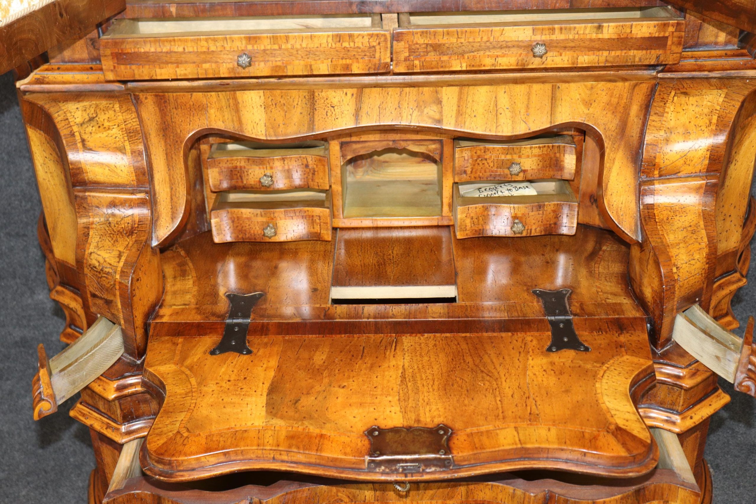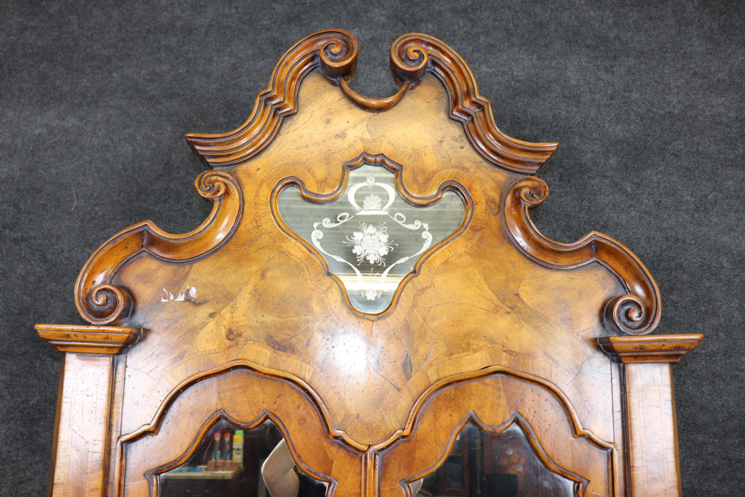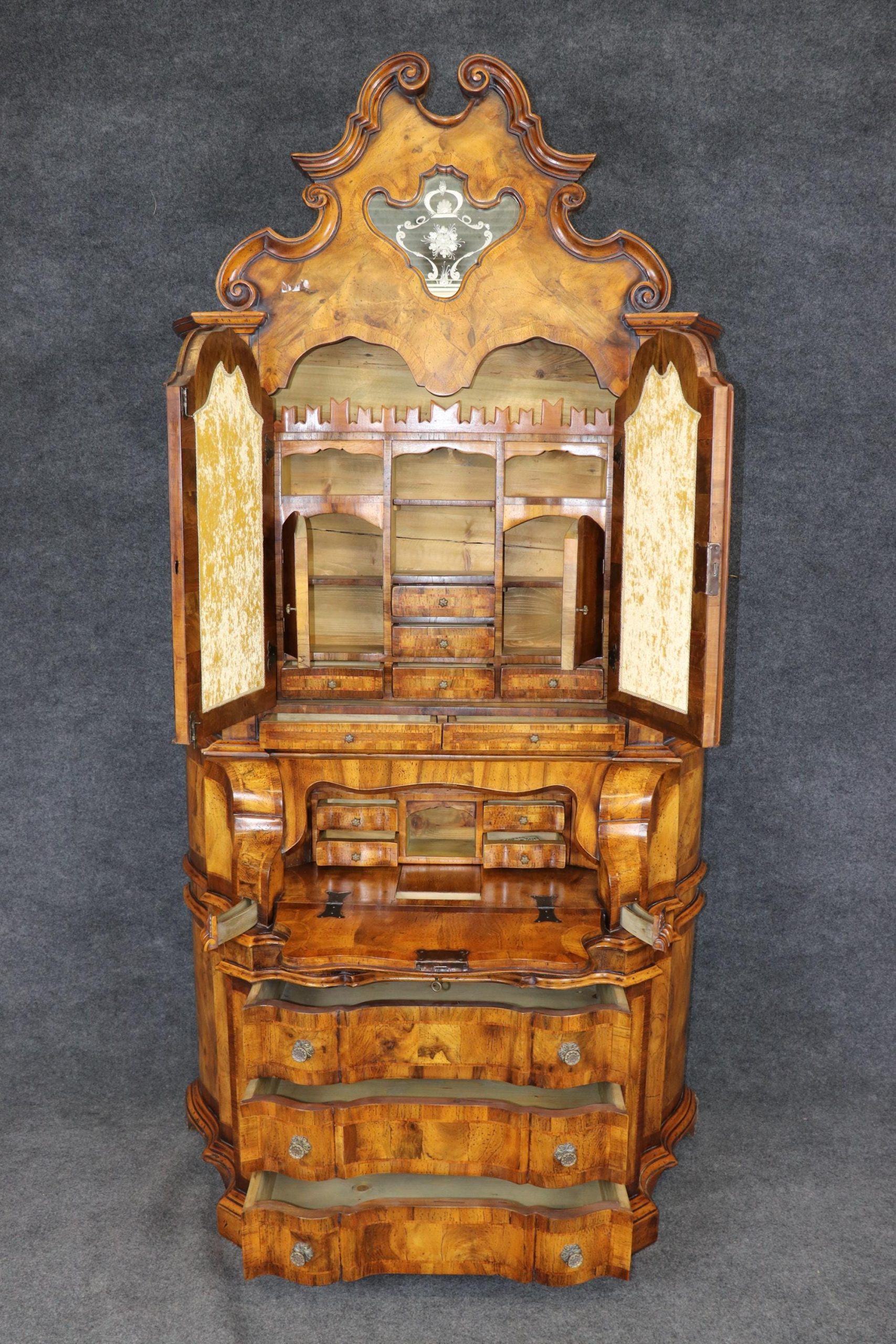 This vintage Italian bombe secretary desk is made of the highest quality! If you look at the photos provided, you can see the beautifully etched mirror panels. This piece is perfect for any living room, bedroom, office, kitchen or large bathroom and is equipped with 3 drawers, perfect for storing your personal belongings all while bringing a sense on luxury and class into your home! This piece is bound to bring a sense of creativity and character into your home or place of choosing and will surely have your guests mesmerized by its attention to detail. Antique furniture and vintage furniture have stood the test of time and this piece is no exception! With its quality materials and great craftsmanship, this desk will last you and your family many years to come. The secretary is in good vintage condition with minor surface scratches and wear, as to be expected with a vintage item.