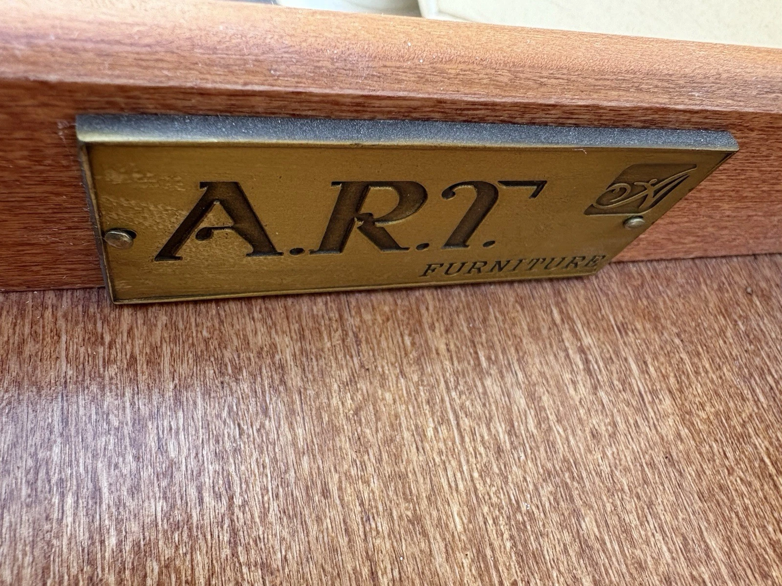 This charming ivory kidney desk vanity from A.R.T. Furniture beautifully marries modern elegance with functional design, making it a perfect addition to any workspace or dressing area. Its graceful curves and stenciled side chair add a touch of artistry, reflecting the craftsmanship of the post-1950 era. With a single sturdy drawer for storage, this desk is both a practical piece and a statement of style, inviting creativity and organization into your home. Embrace the warmth of this vintage find, lovingly preserved and ready to enhance your daily routine.