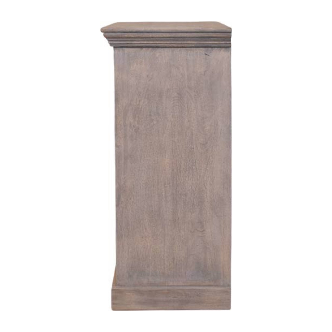 Inspired by Rajasthani havelis, this acid-wash sideboard features intricate lattice carving, antique ring pulls, upper drawers, and a spacious cabinet.
