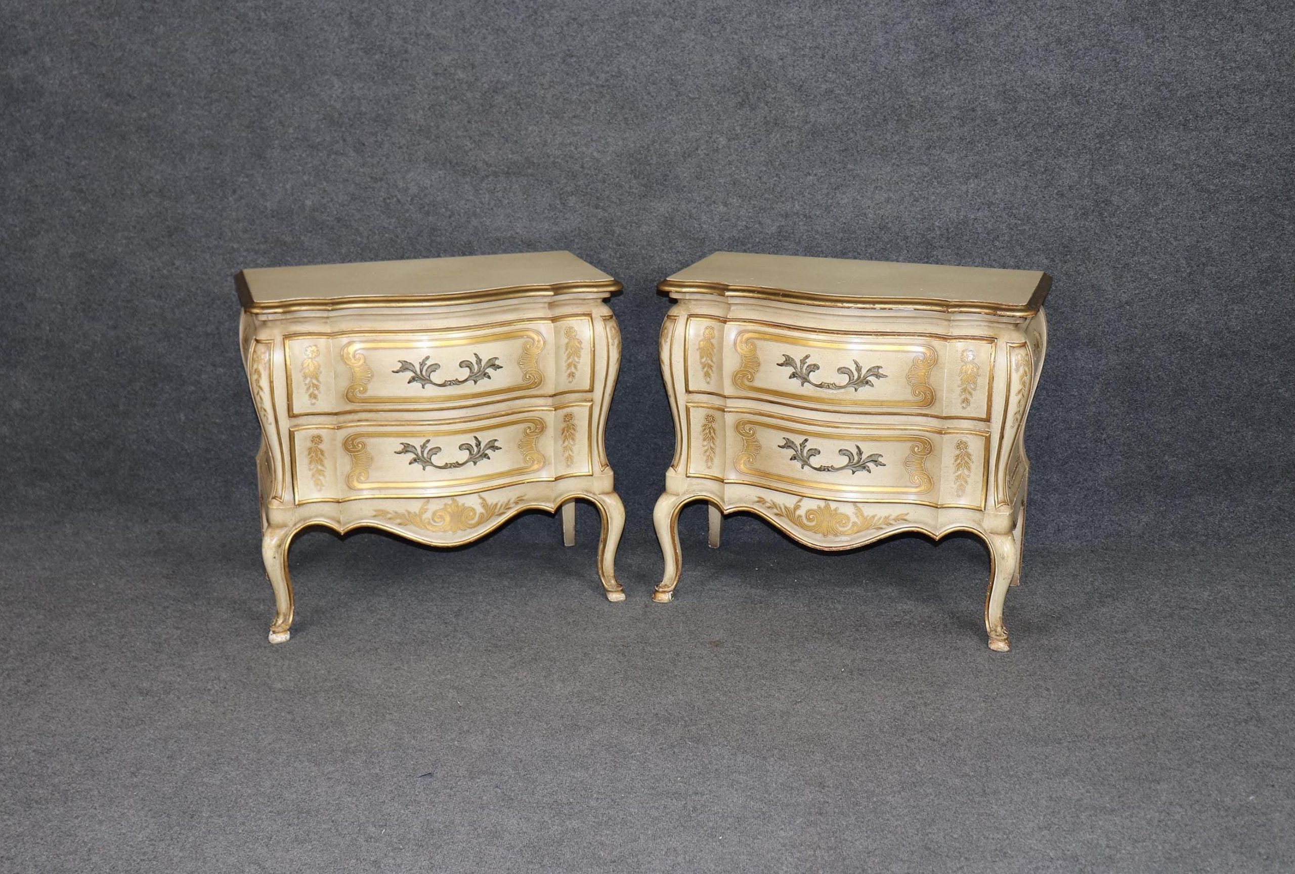 Perfect for flanking a luxurious bed, enhancing a formal sitting room, or bringing sophistication to a refined guest suite, these nightstands are more than just functional furniture—they are statement pieces that celebrate history, artistry, and enduring style. The pair is in good vintage condition with the exception of some light surface scratches, Minor finish loss and normal age related wear. As to be expected with items of age and use.