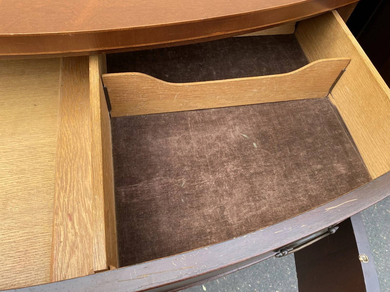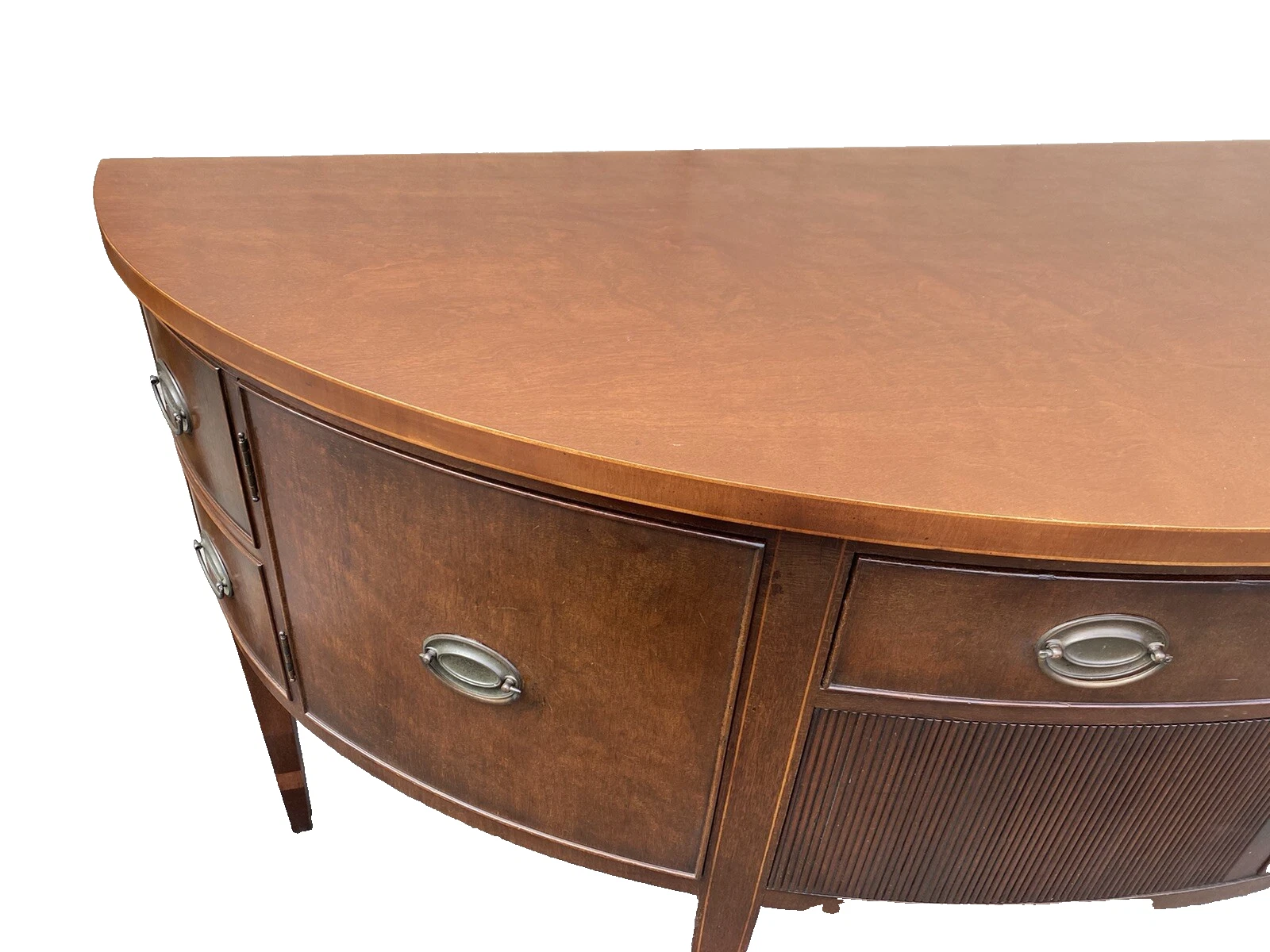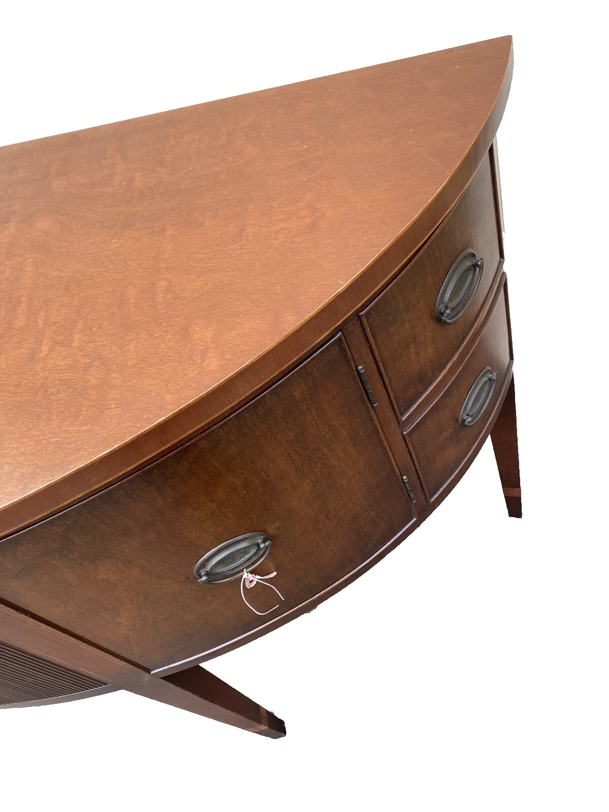 This exquisite Kittinger mahogany sideboard exudes timeless elegance with its graceful Hepplewhite style and intricate pencil inlay detailing. Crafted with care, the buffet features a felt-lined center drawer and four doors, providing both beauty and functionality for your dining space. The warm mahogany finish highlights the rich grain of the wood, while the signature Kittinger tag signifies its quality craftsmanship. This piece not only serves as a practical server but also as a stunning focal point, ready to bring a touch of refined charm to your home.