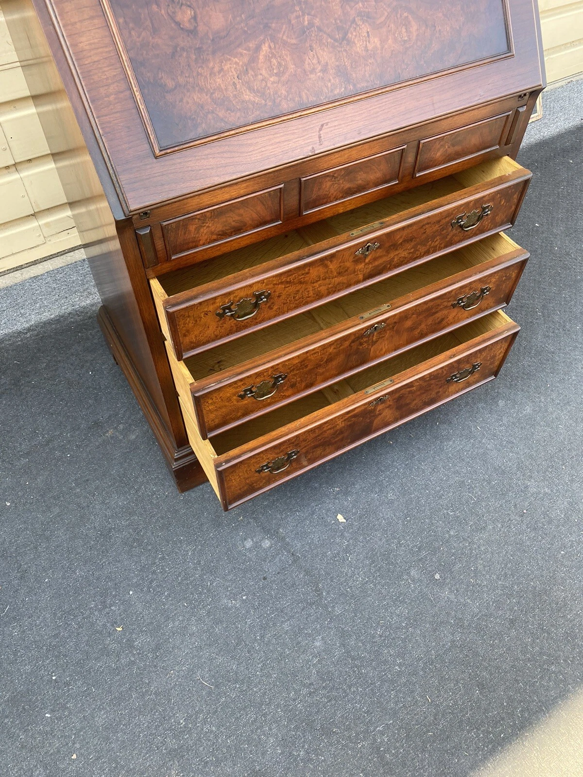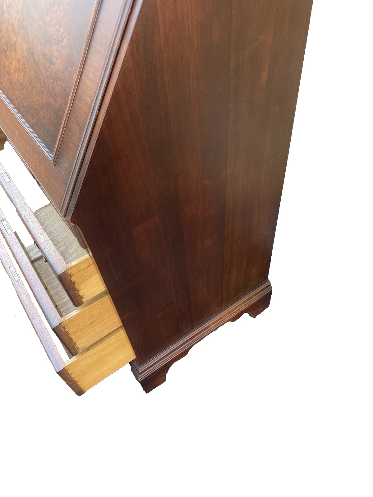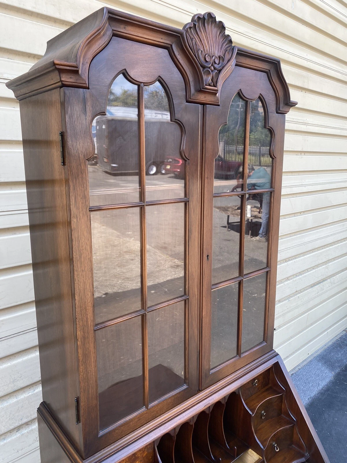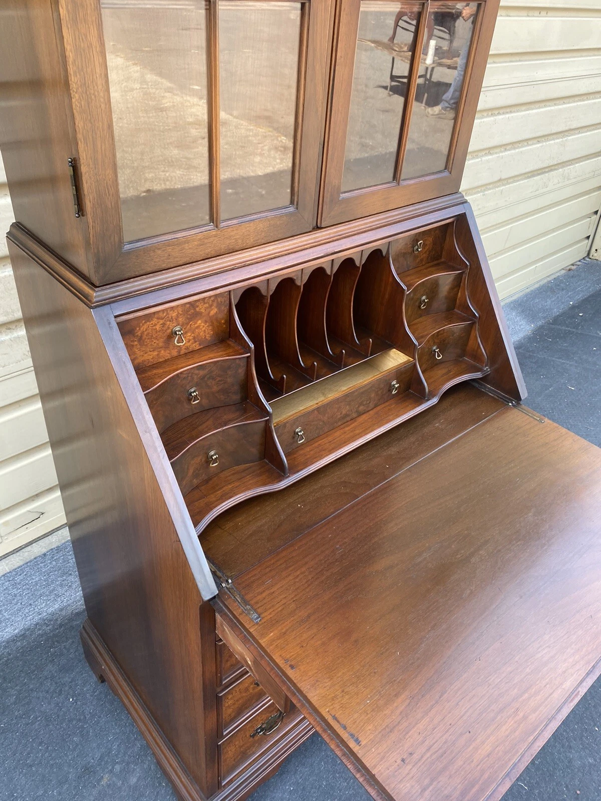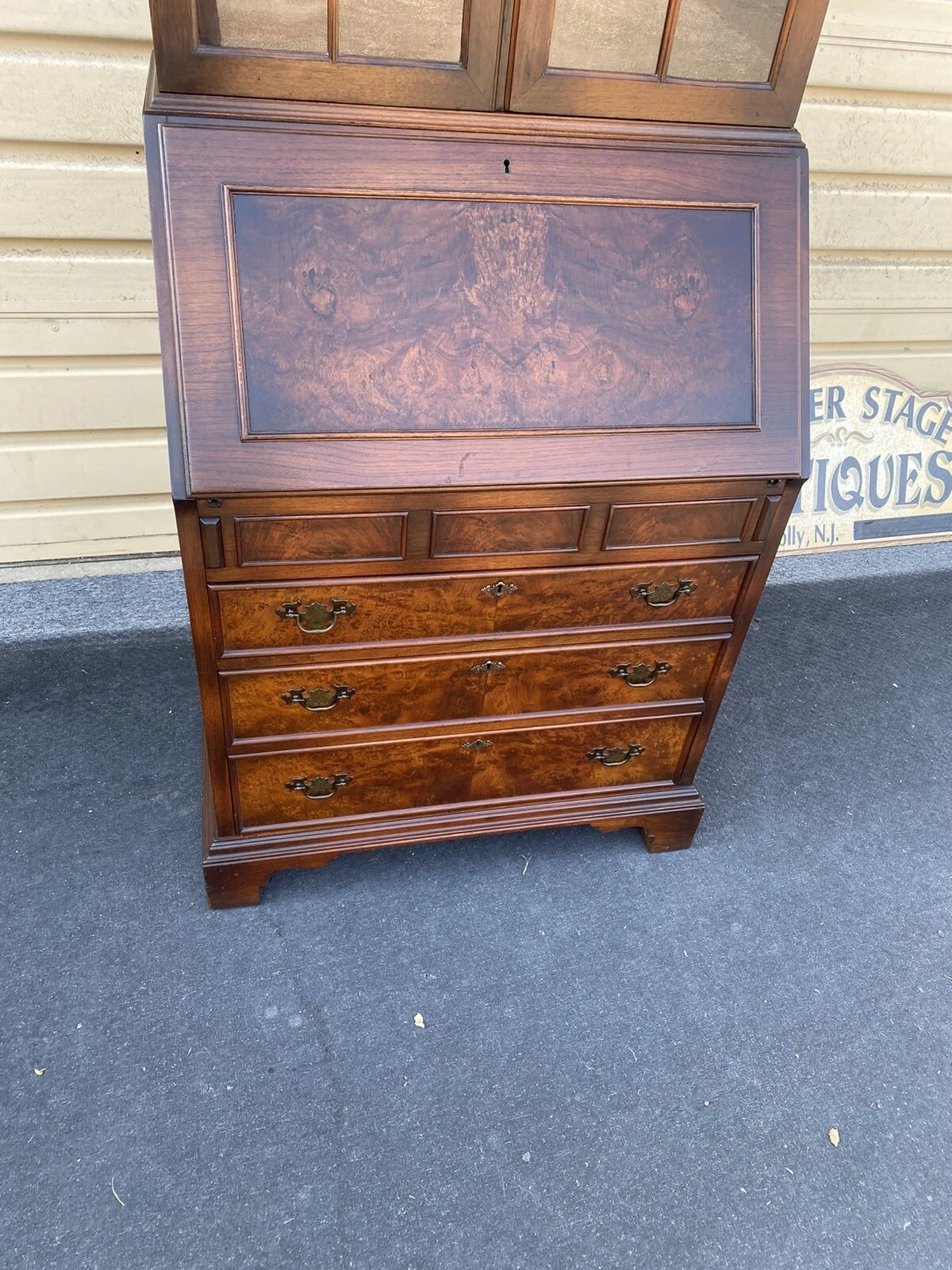 This exquisite Kittinger walnut secretary desk, featuring a charming bookcase top, beautifully embodies the elegance of Chippendale design. Crafted with meticulous attention to detail, its rich multicolor finish and three spacious drawers offer not only functionality but also a warm invitation to personalize your workspace. The sturdy construction ensures that this piece will serve as a cherished focal point in your home for years to come, blending timeless craftsmanship with everyday practicality.