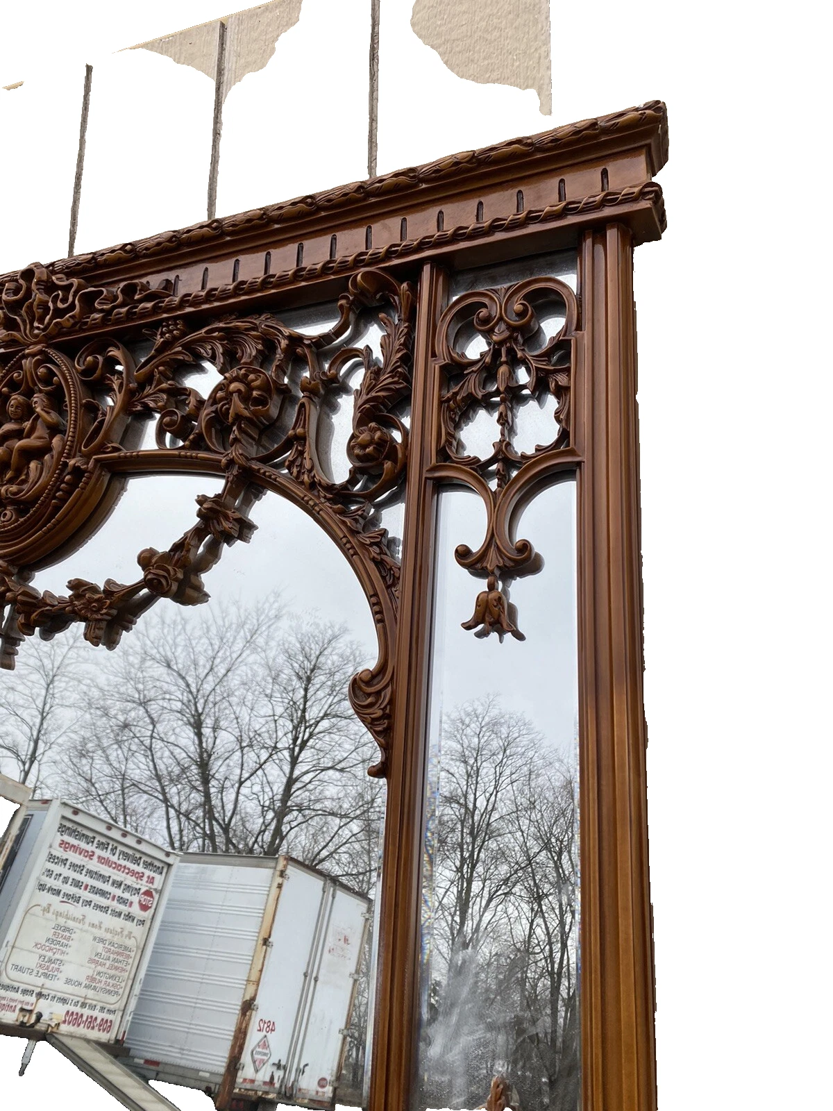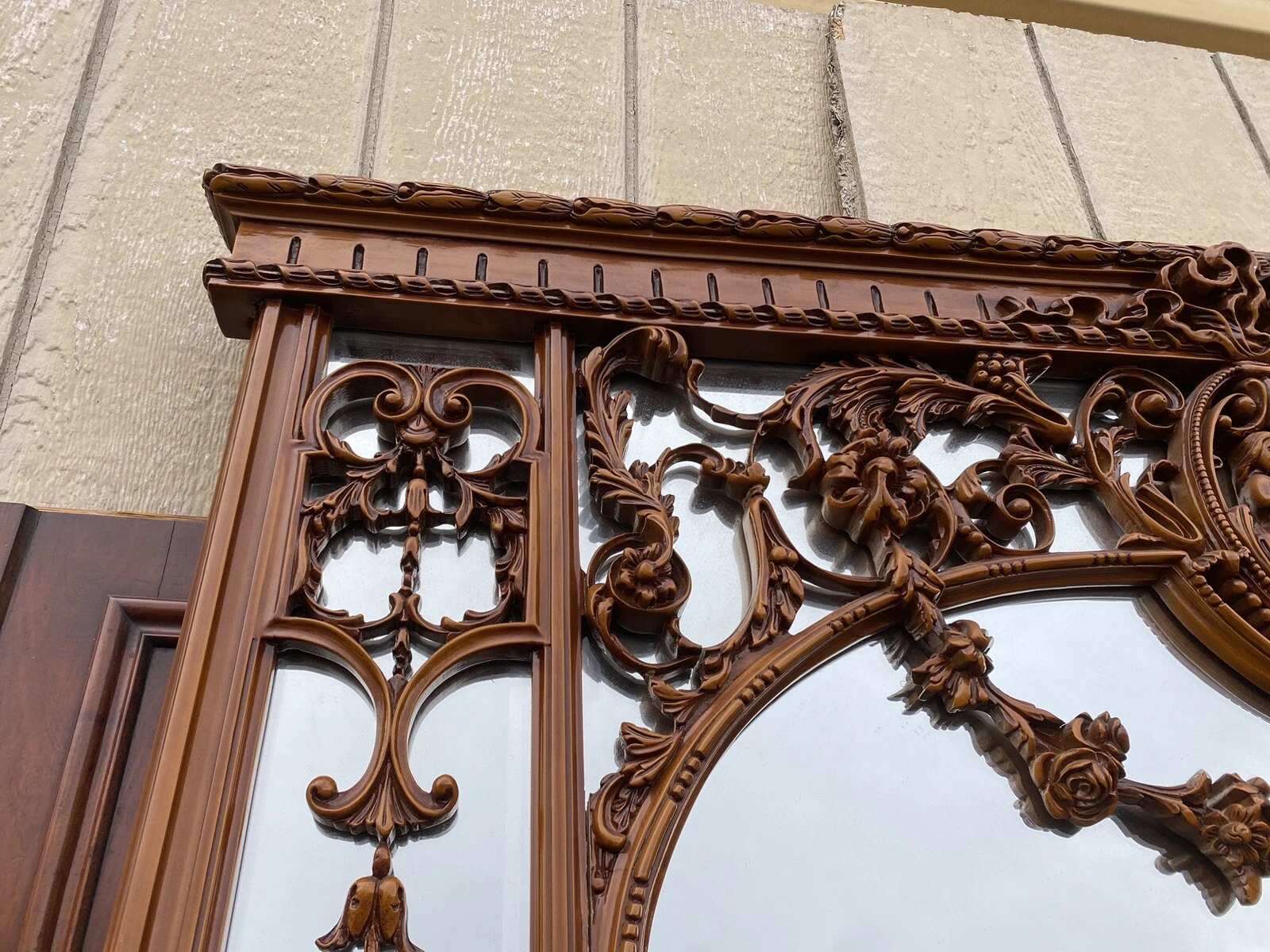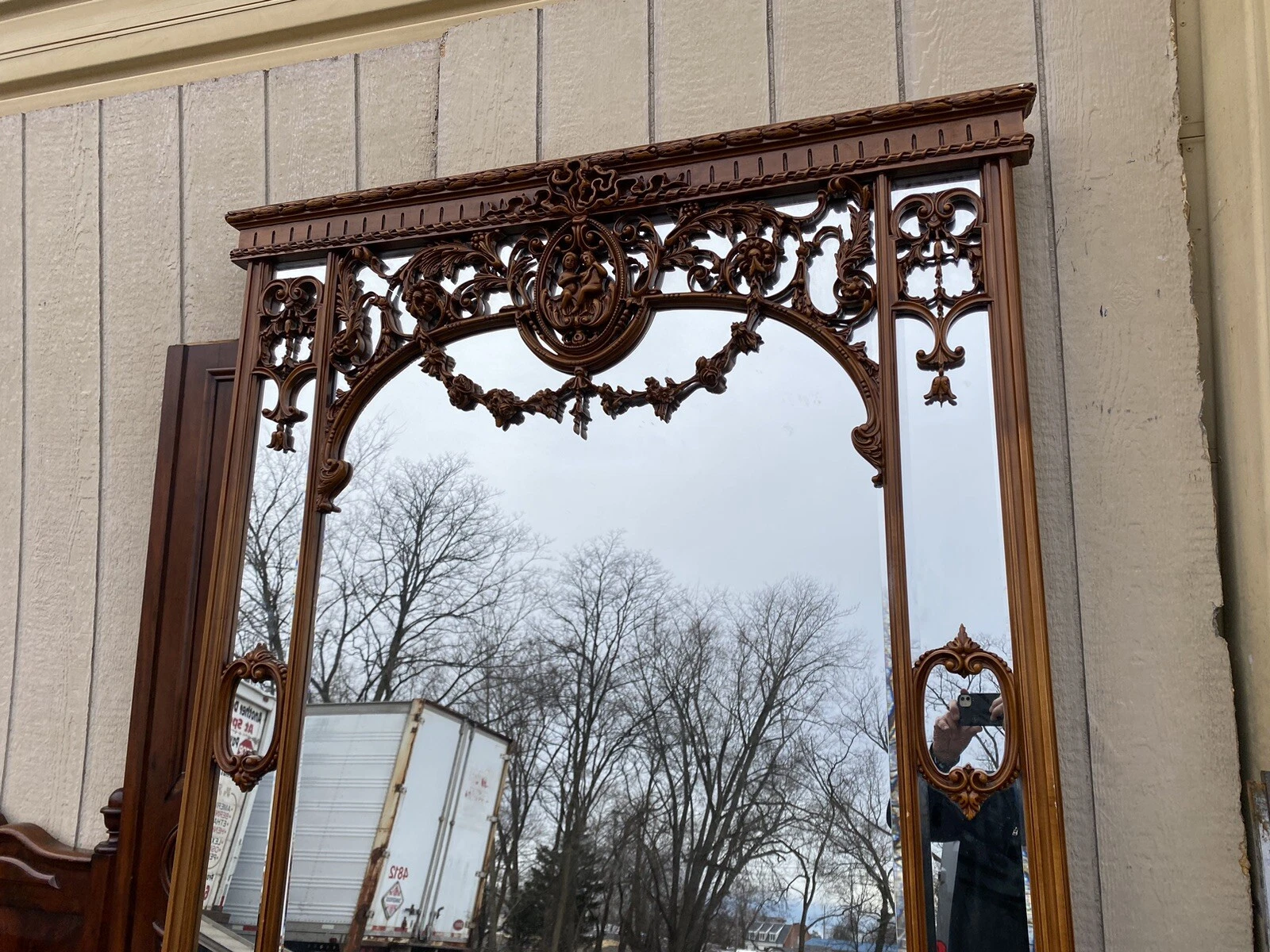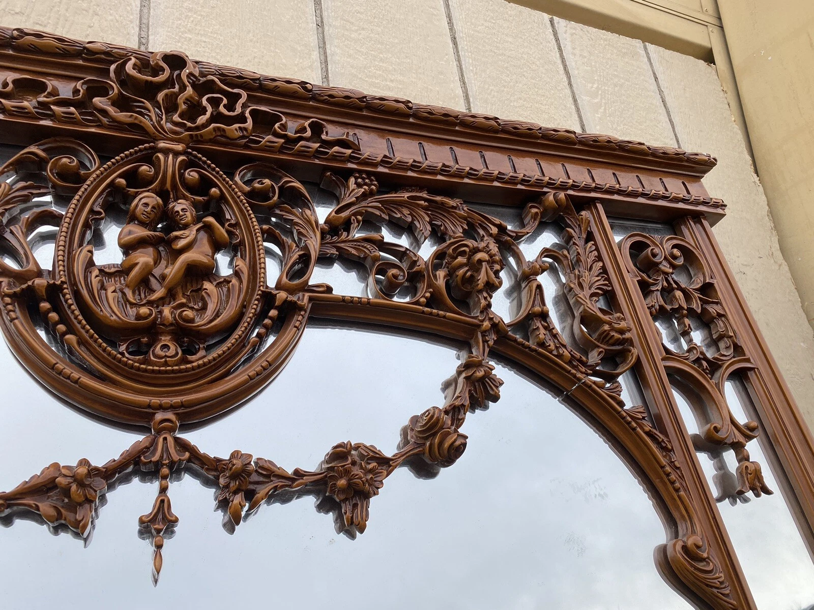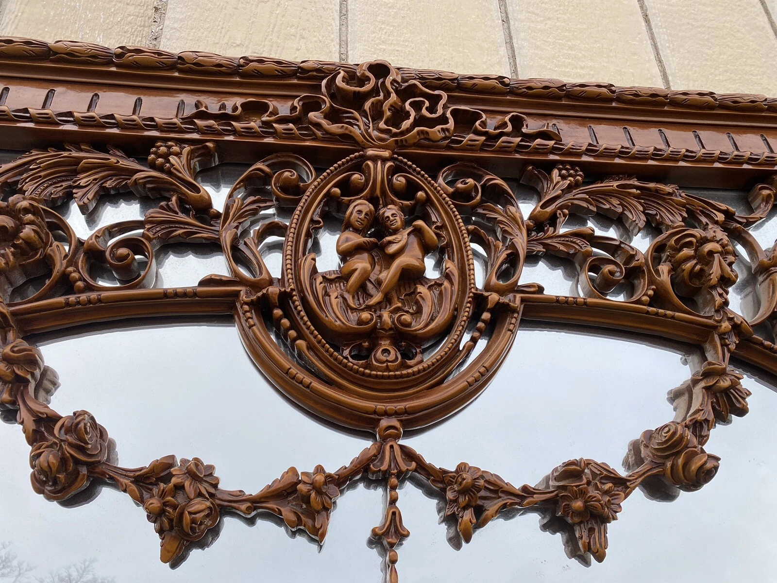 This exquisite large decorator mirror from Rio Furniture is a captivating blend of elegance and charm, featuring two delightful cherub figures perched at the top, evoking a sense of whimsy and grace. Crafted in the early 2000s, its vibrant multicolor finish enhances the intricate details, making it a standout piece for any room. The mirror’s grand size and ornate design invite a touch of sophistication, reflecting the artistry and craftsmanship that define quality home décor. This lovely mirror is not just a functional item but a statement piece that brings warmth and character to your living space.