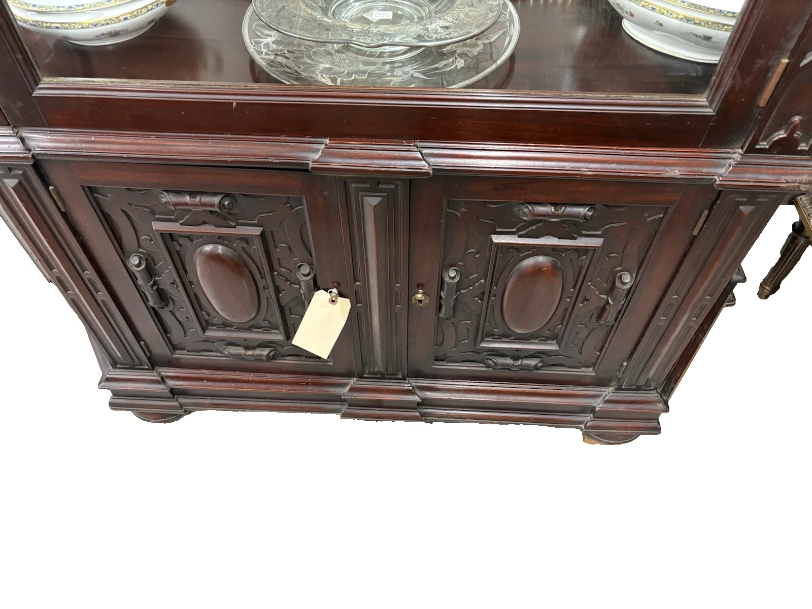 This exquisite antique Victorian mahogany china cabinet is a testament to the artistry and craftsmanship of the early 20th century. Handcrafted with care, its rich mahogany finish exudes warmth and elegance, making it a striking focal point for any room. With three beautifully designed doors and two plate glass shelves, this cabinet not only provides ample display space for your cherished collectibles but also reflects the timeless style that defines the Victorian era. Its solid construction ensures it remains a treasured piece for generations to come, embodying the charm and character of a bygone age.