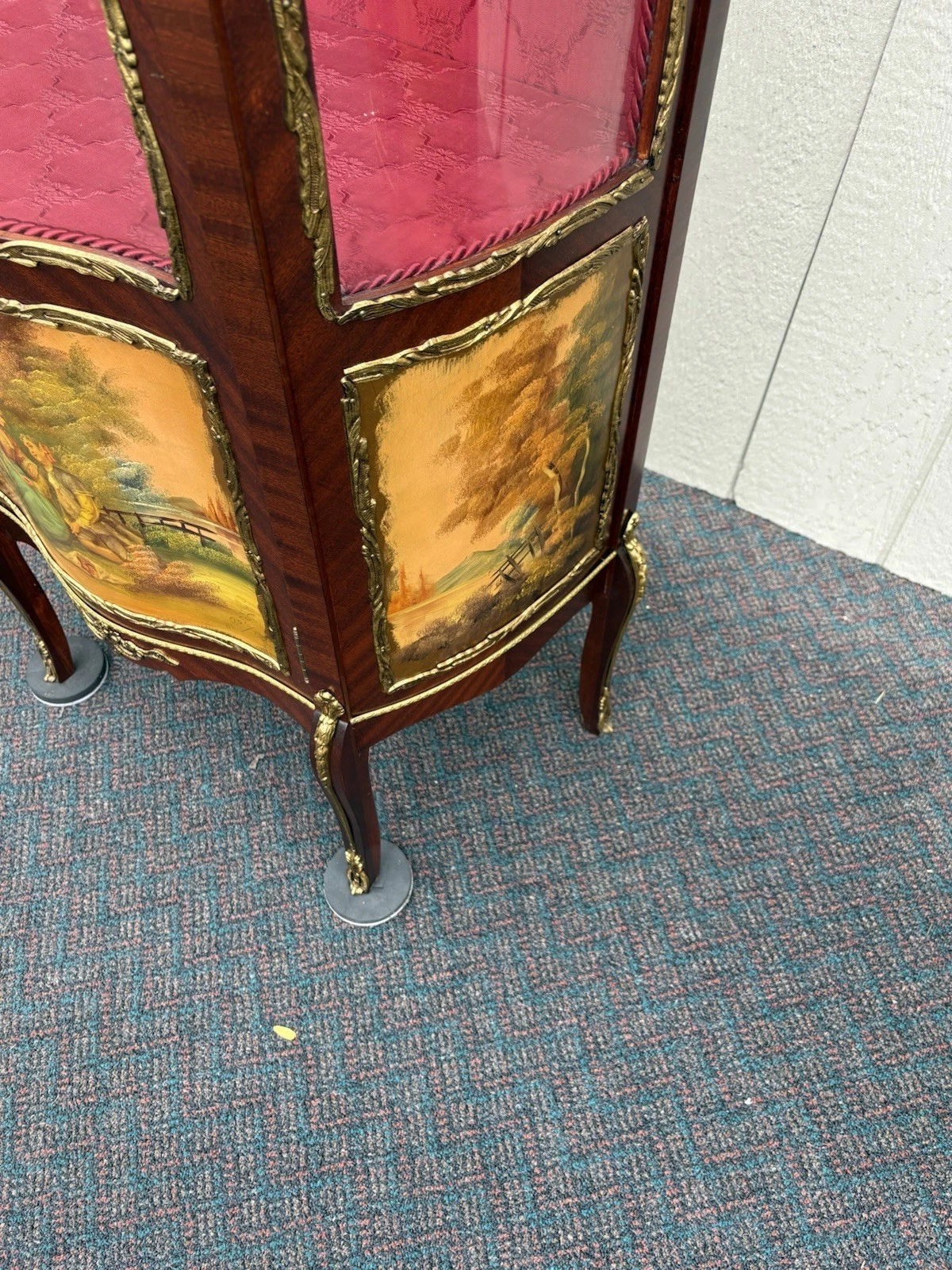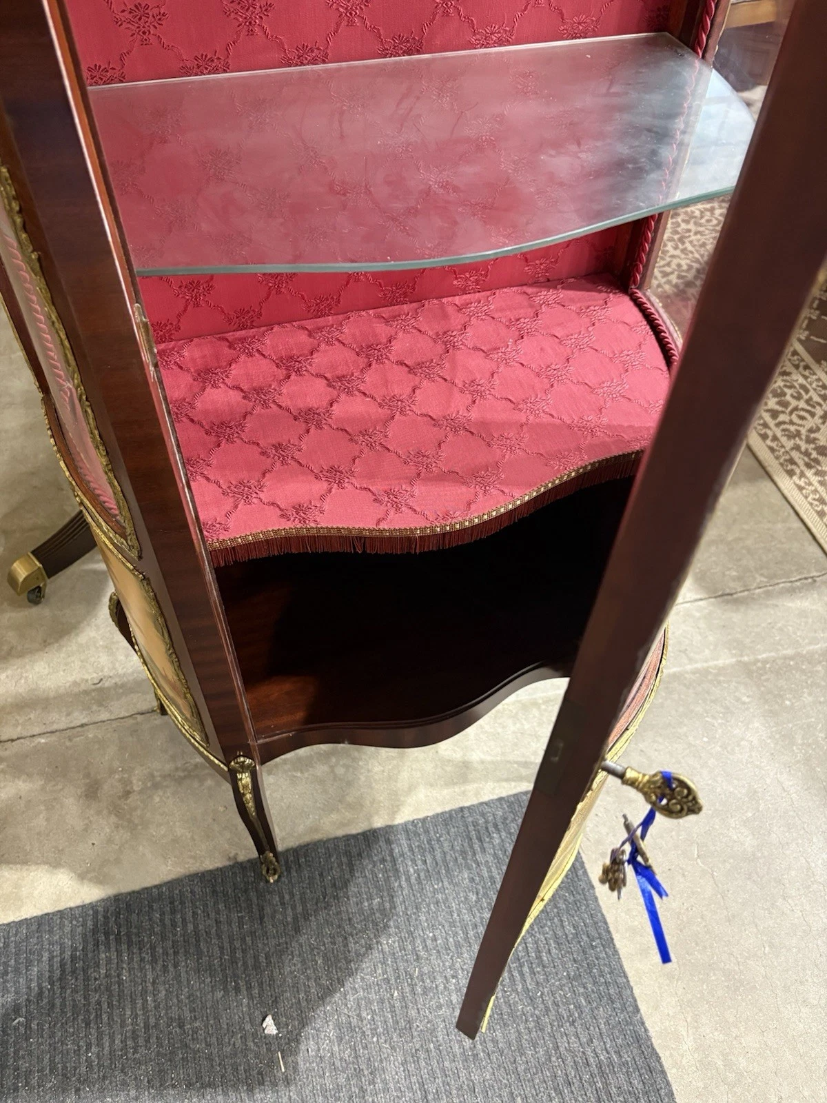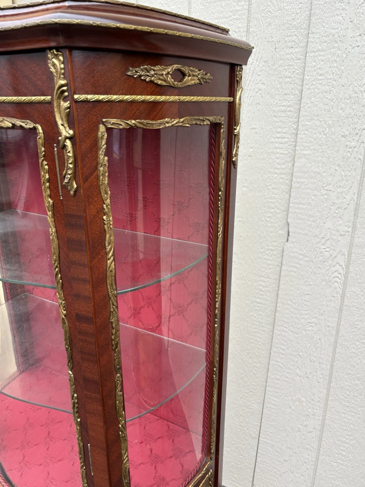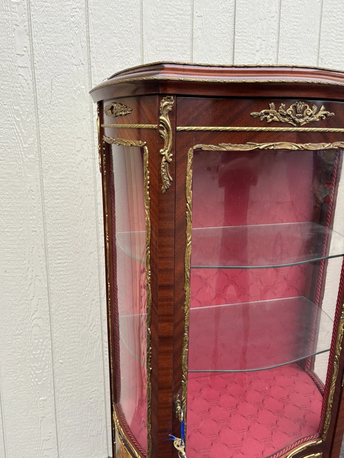 This exquisite Louis XV curio cabinet, adorned with intricate bronze ormalu detailing, exudes the elegance and charm reminiscent of 18th-century craftsmanship. Handmade with care, its multicolored finish beautifully highlights the unique character of the materials sourced from Egypt, making it a standout piece for any collection. With three spacious shelves behind a single door, this cabinet not only serves as a stunning display for your cherished china but also adds a touch of history and artistry to your home. Embrace the warmth of a family heirloom with this remarkable cabinet that tells a story of craftsmanship and tradition.
