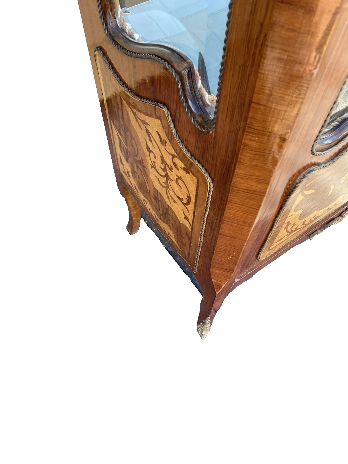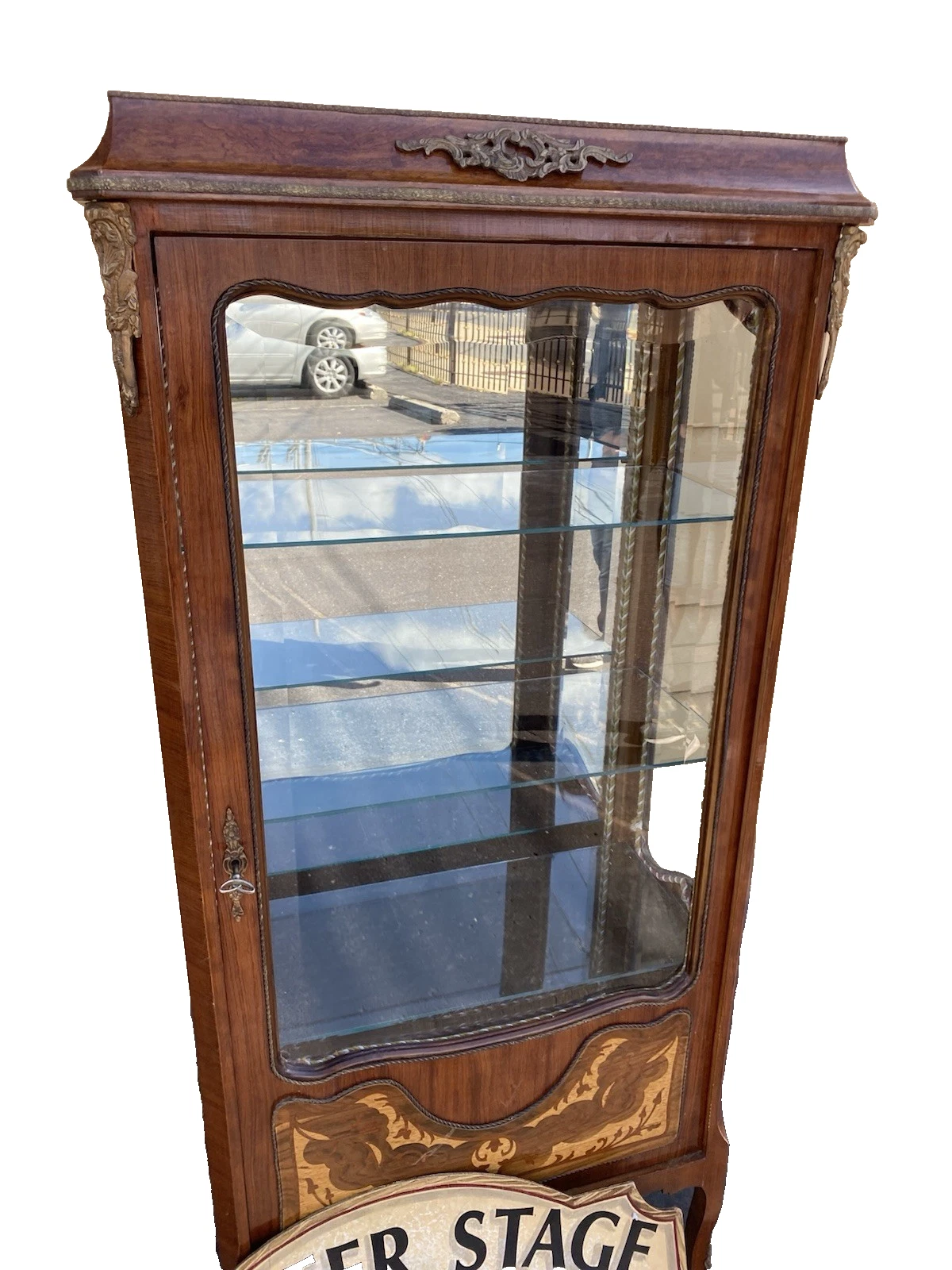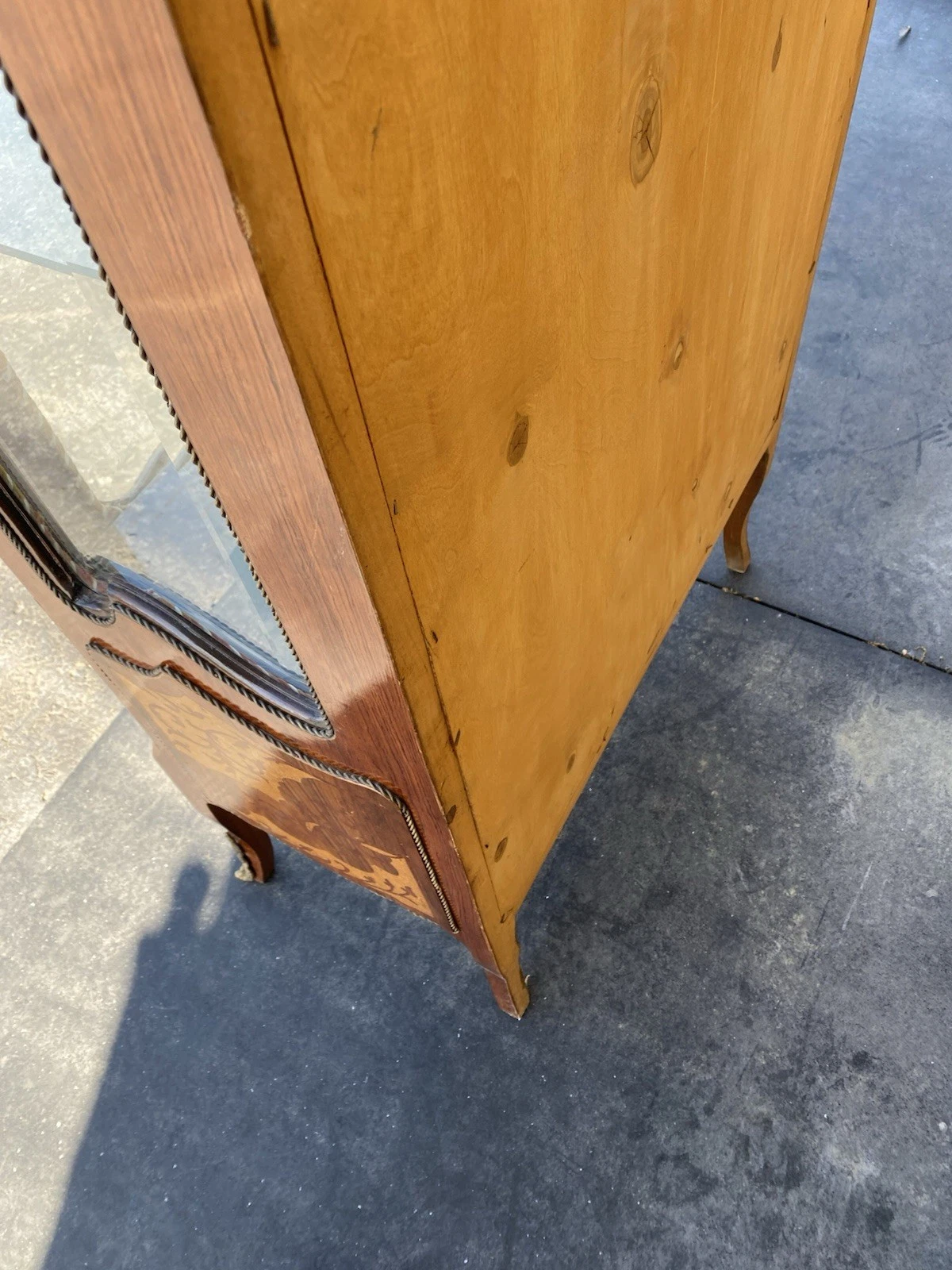 This exquisite Louis XV inlaid curio cabinet captures the elegance of a bygone era with its intricate craftsmanship and timeless design. Featuring three plate glass shelves, it offers a stunning showcase for your cherished china or collectibles, allowing them to shine through the cabinet’s delicate wooden inlays. Handmade with care and attention to detail, this piece not only enhances your decor but also tells a story of artistry and tradition that has endured since the 1990s. Its sturdy construction ensures it will be a beloved addition to your home for years to come.