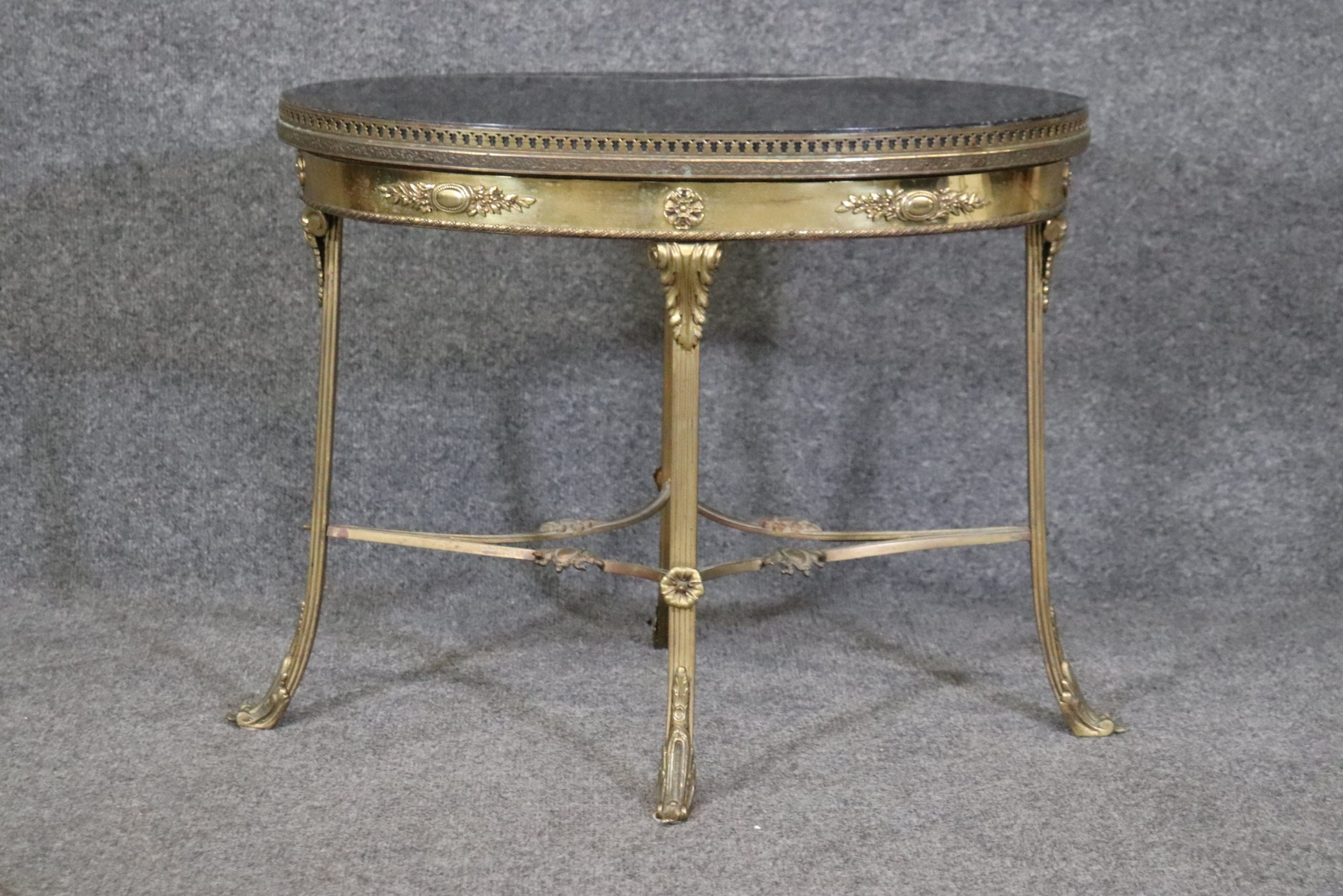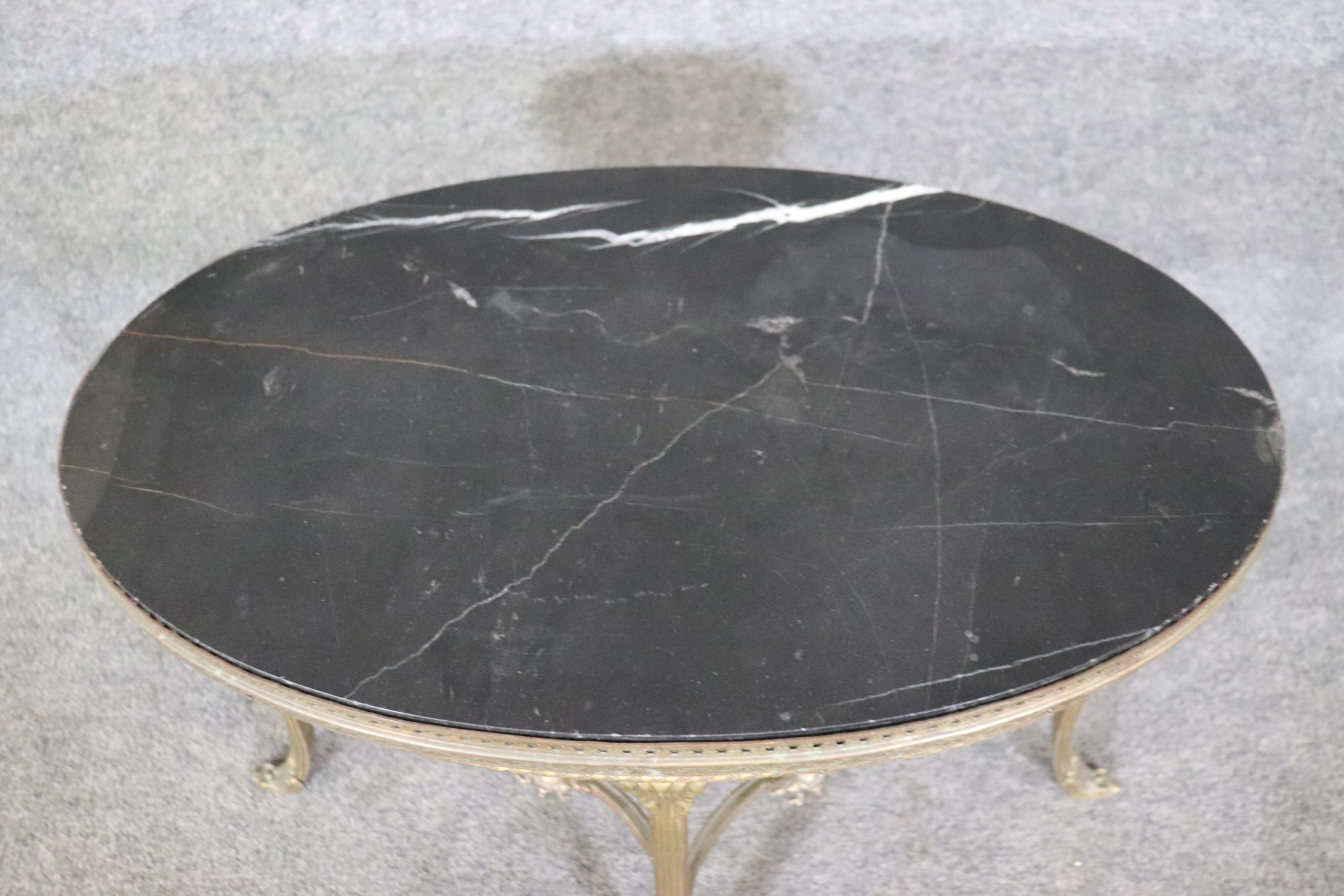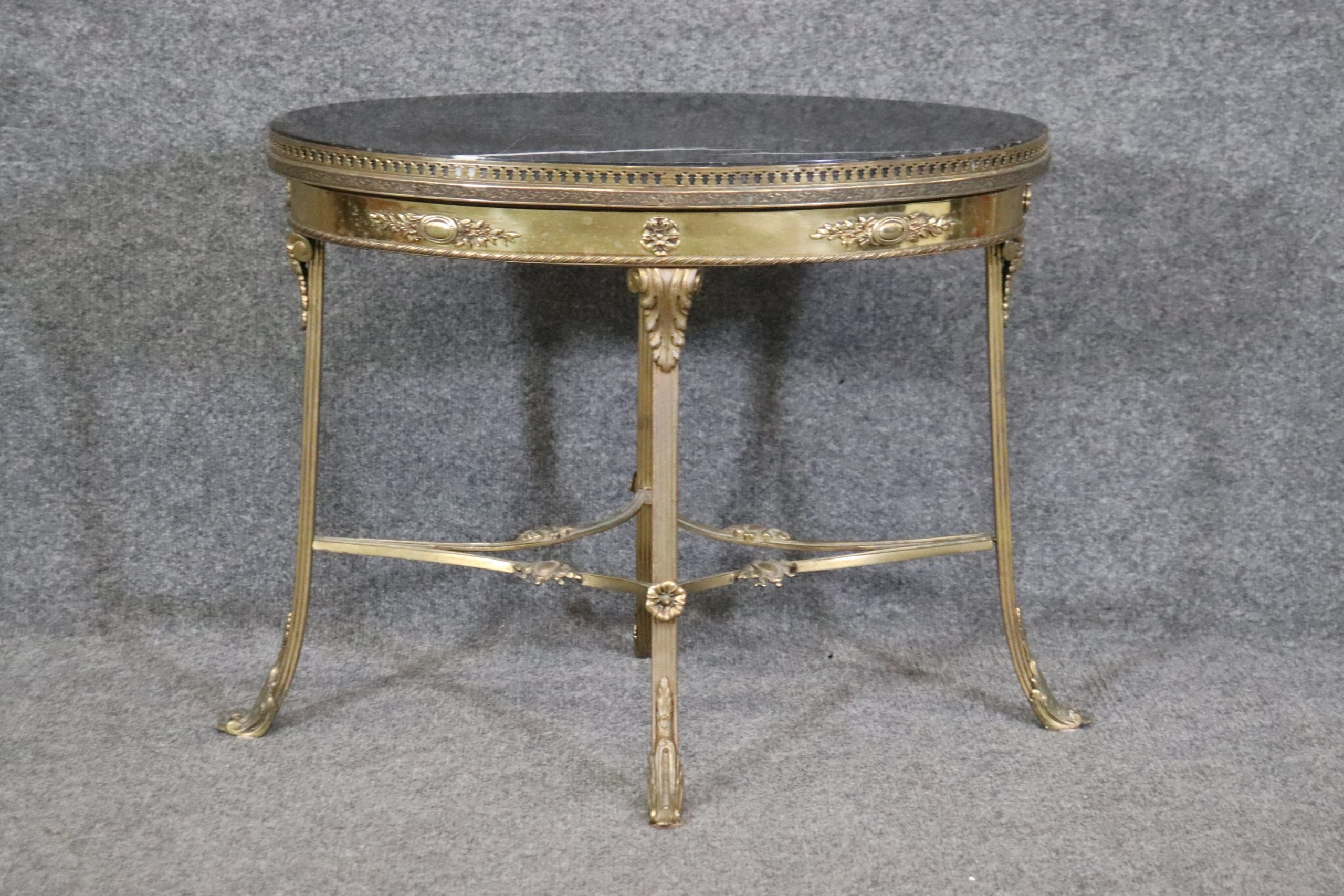 This Louis XV style brass accent table with a black marble top is made of the highest quality! If you look at the photos provided, you can see the detail in the beautiful design in the brass base. This table would be a wonderful addition to any office, entryway, living room, or place of your choosing and will certainly add a nice touch of character to your home. This table can be used as decoration or functionally as a table to display or place your desired items. The table is in good vintage condition with minor surface scratches and finish loss, as to be expected with an item from the 1950s!