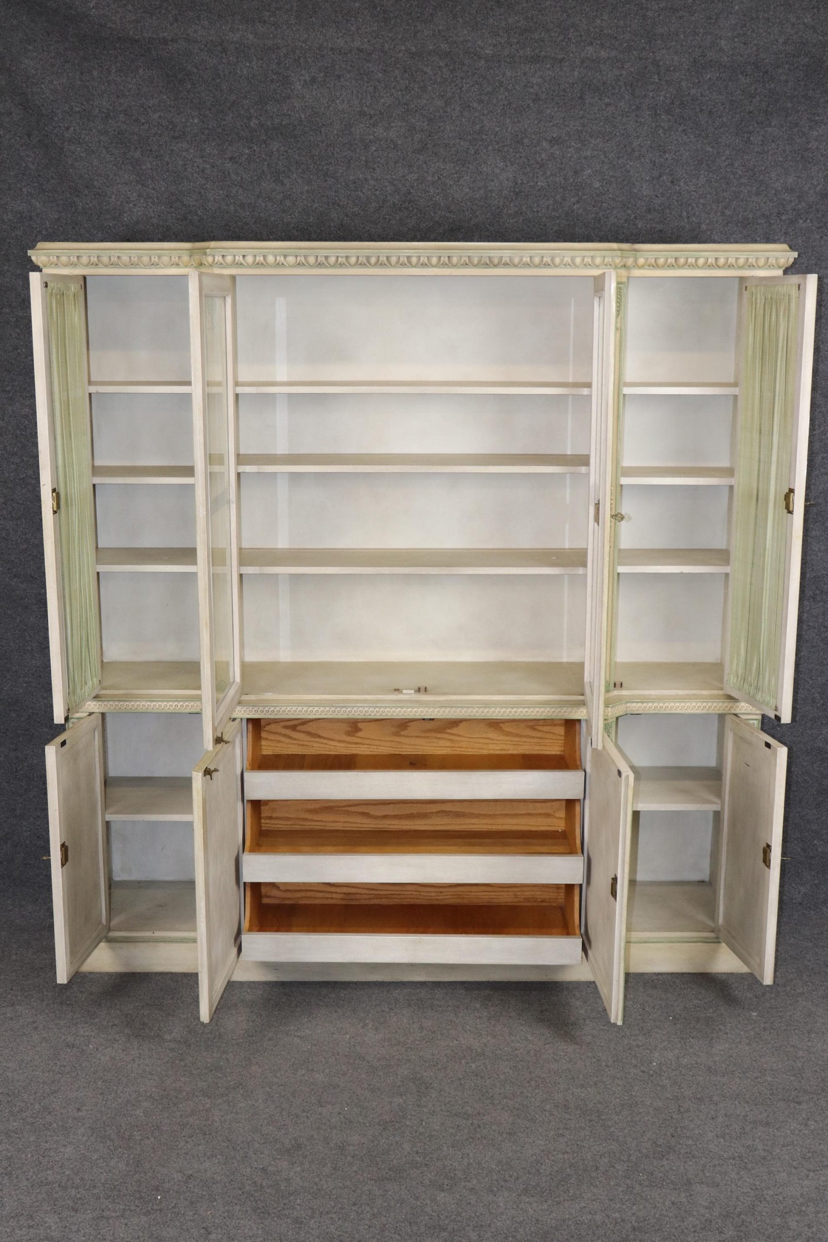 This vintage Louis XVI Directoire Style breakfront / china cabinet is made of the highest quality! This is a perfect conversation piece for any entryway, living room, office or place of your choosing! This is equipped 11 shelves and 3 drawers, perfect for storing your personal belongings all while bringing a sense of luxury and class into your home!