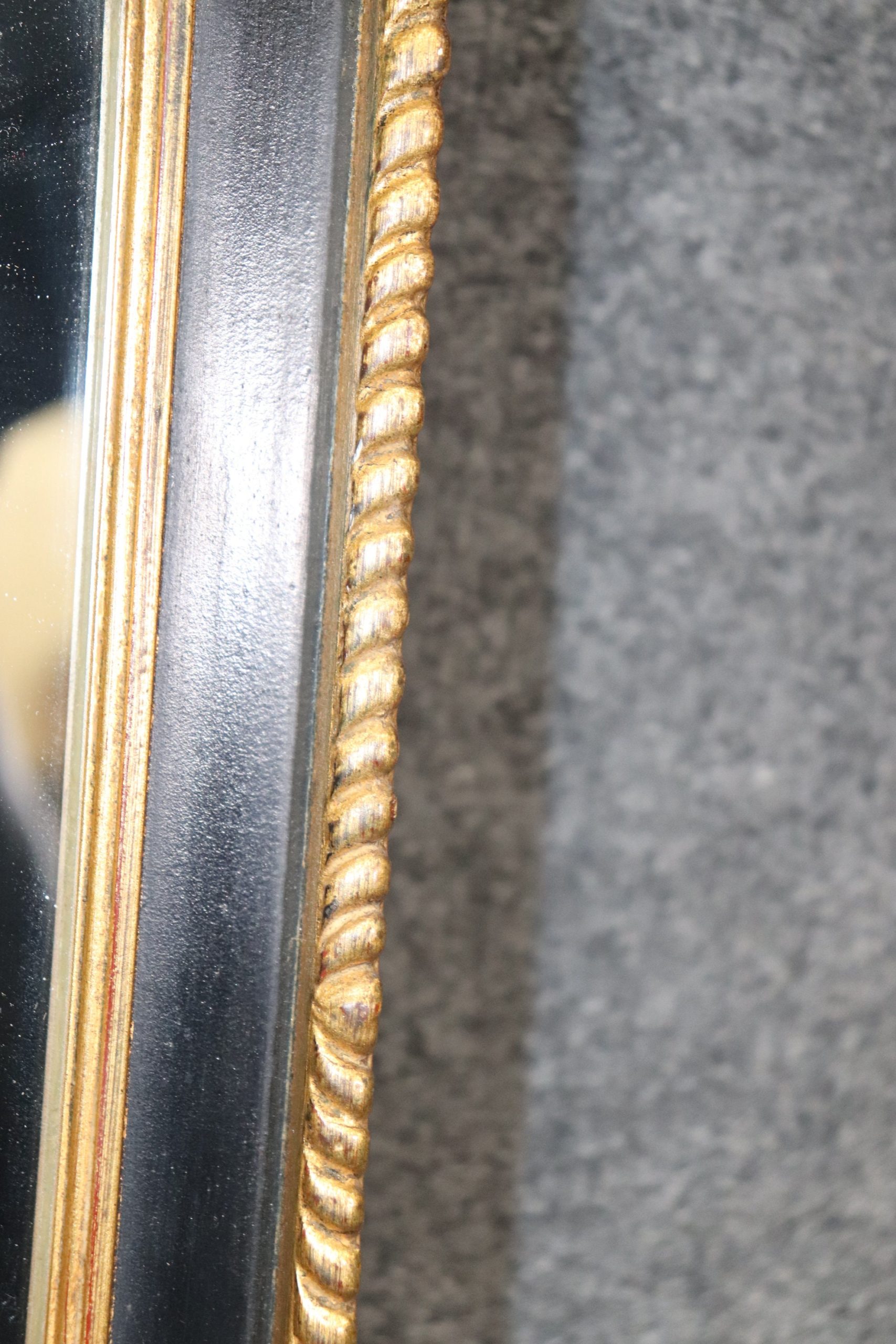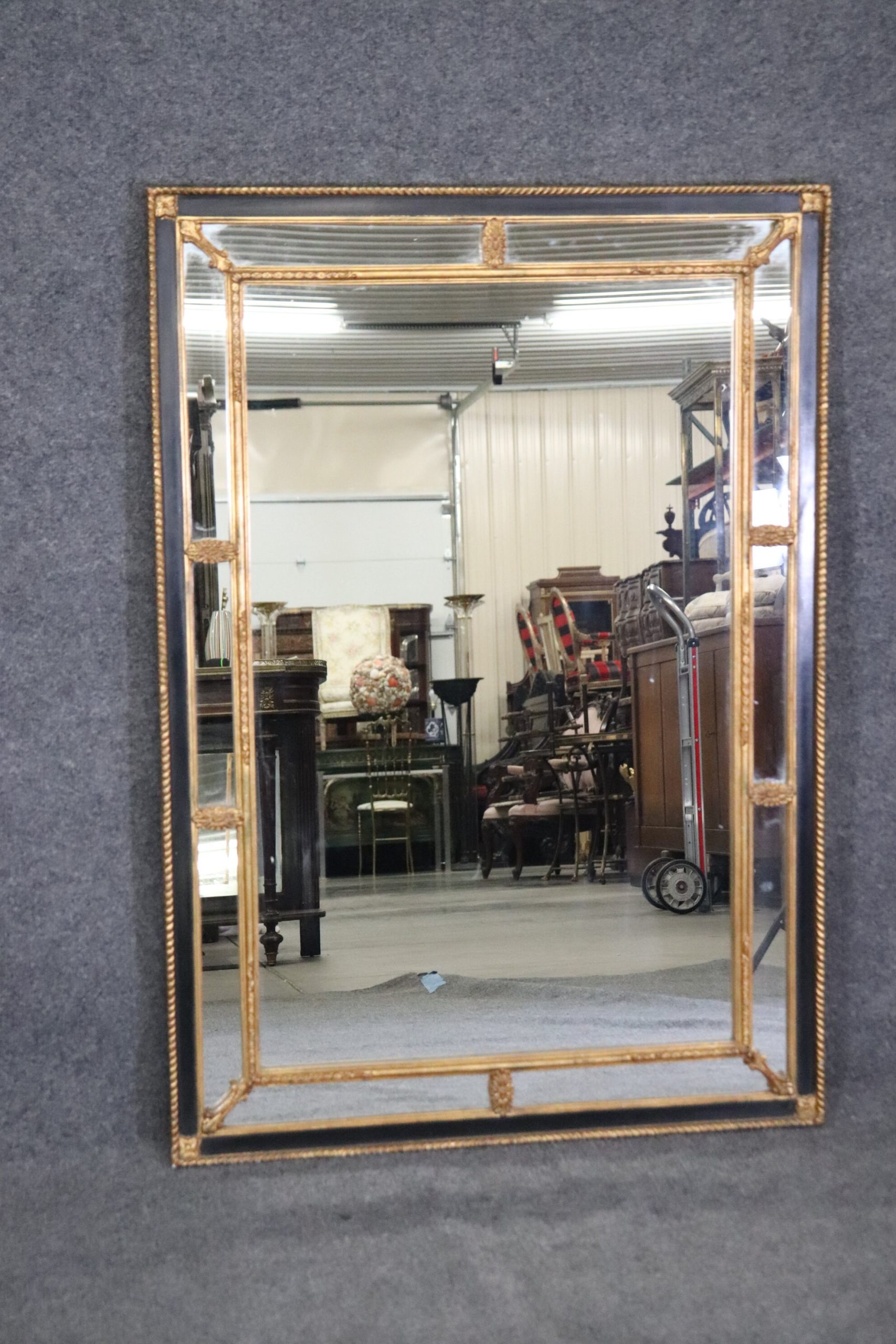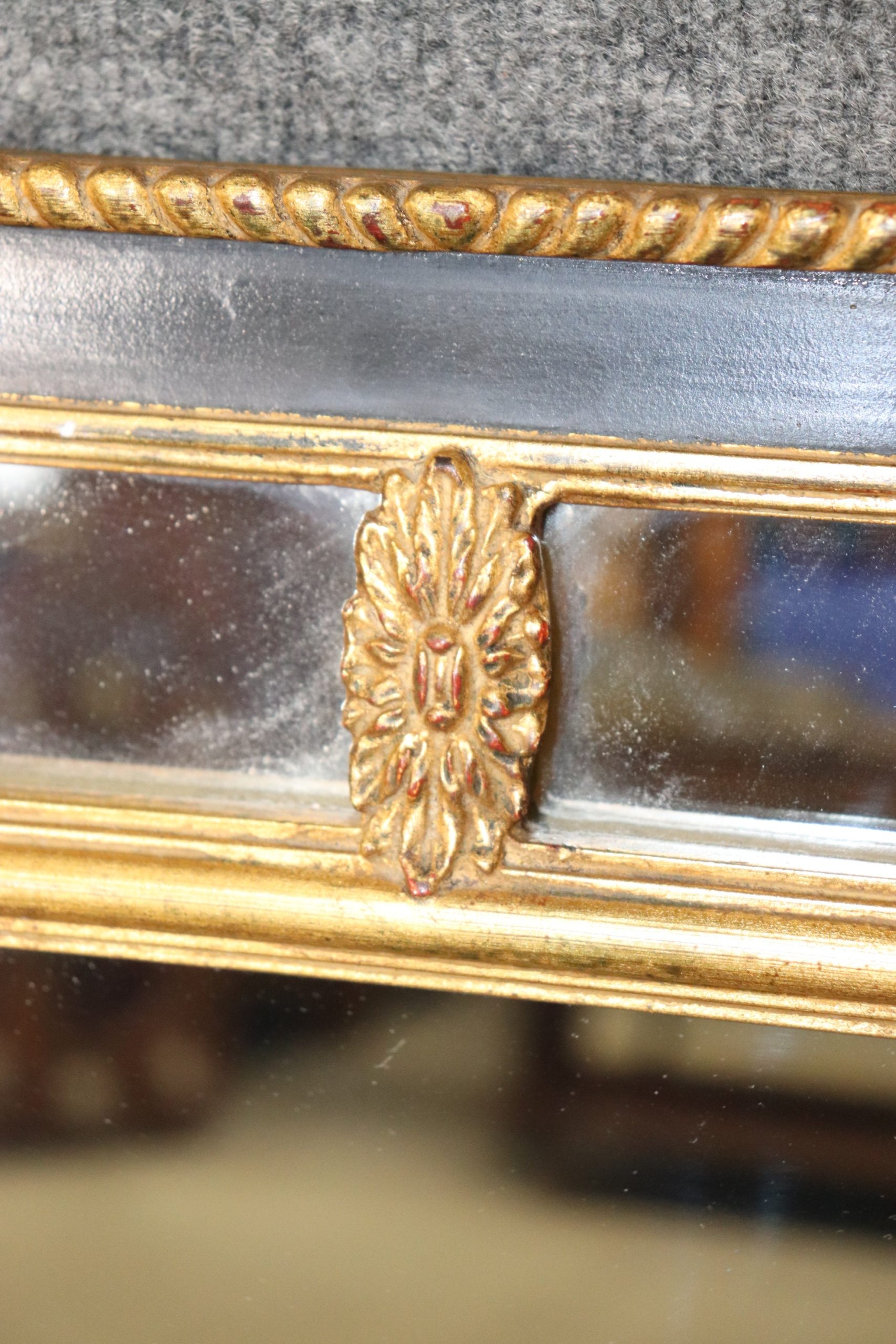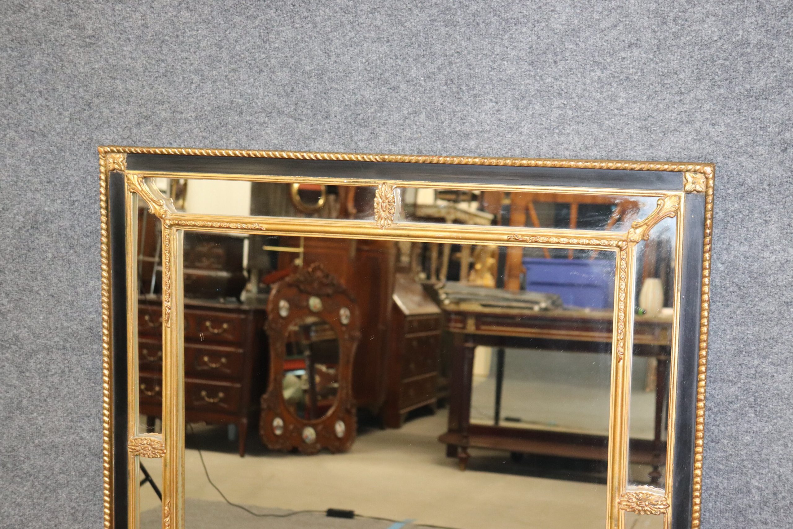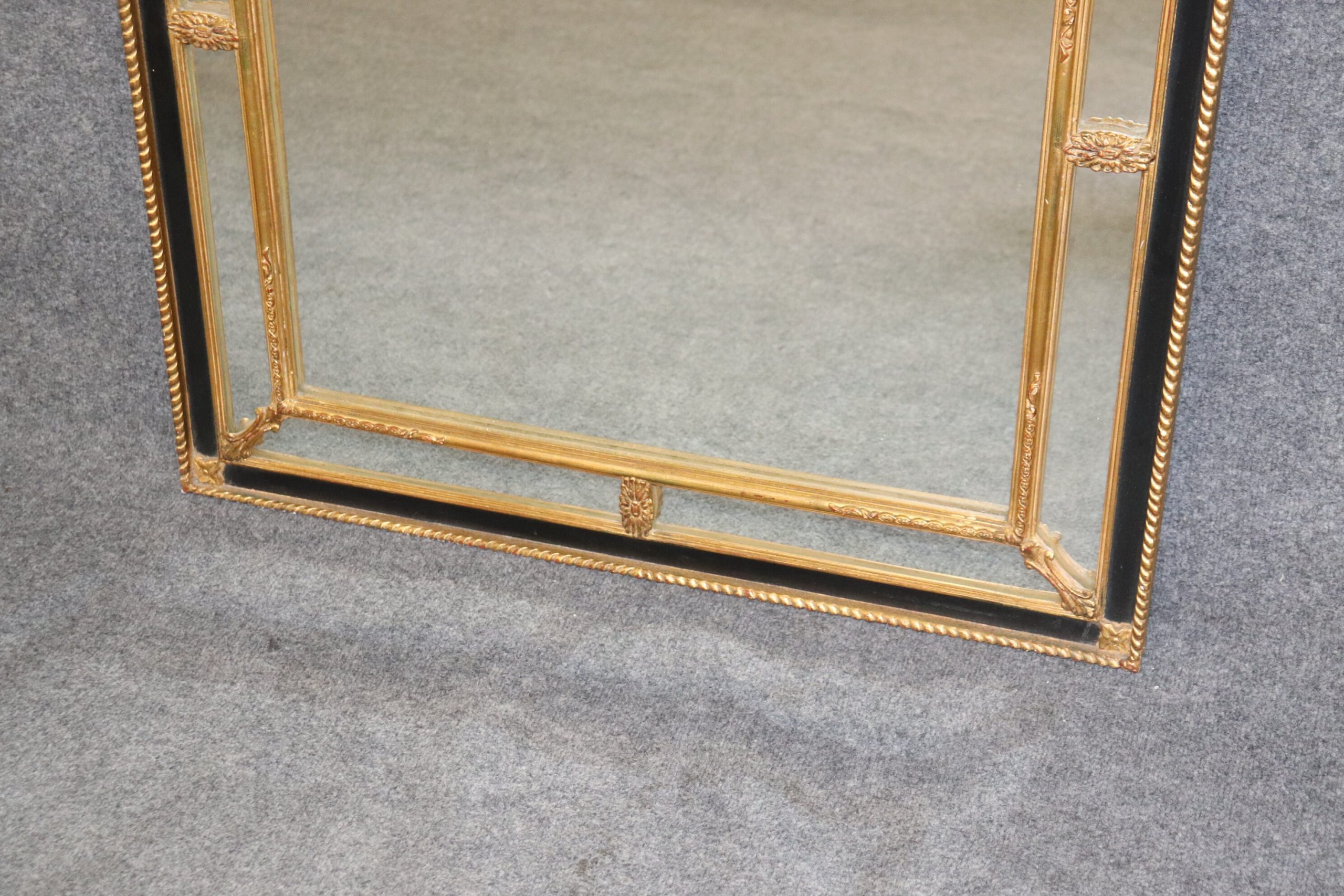 This Louis XVI Directoire Style Ebonized and Gilt Rectangular Wall Hanging Mirror By Carvers Gild gives off a very nice look and is bound to bring sophistication and a sense of luxury into your home. This mirror is equipped with a black lacquer and gold gilt finish and is equipped with carved decorations. This piece is perfect for use as an entryway mirror, bathroom mirror, hallway mirror, bedroom mirror or living room mirror and can be paired with a variety of other styles you may already have in your home or place of choosing. This mirror was made by the Carvers Guild a company that started in 1970 and is still in business today. They are based in the united states and specialize in making high quality mirrors! The mirror is in good vintage condition with the exception of some light surface scratches as well as a small scratch that is a little deeper at the bottom of the actual mirror which is shown in the photos.