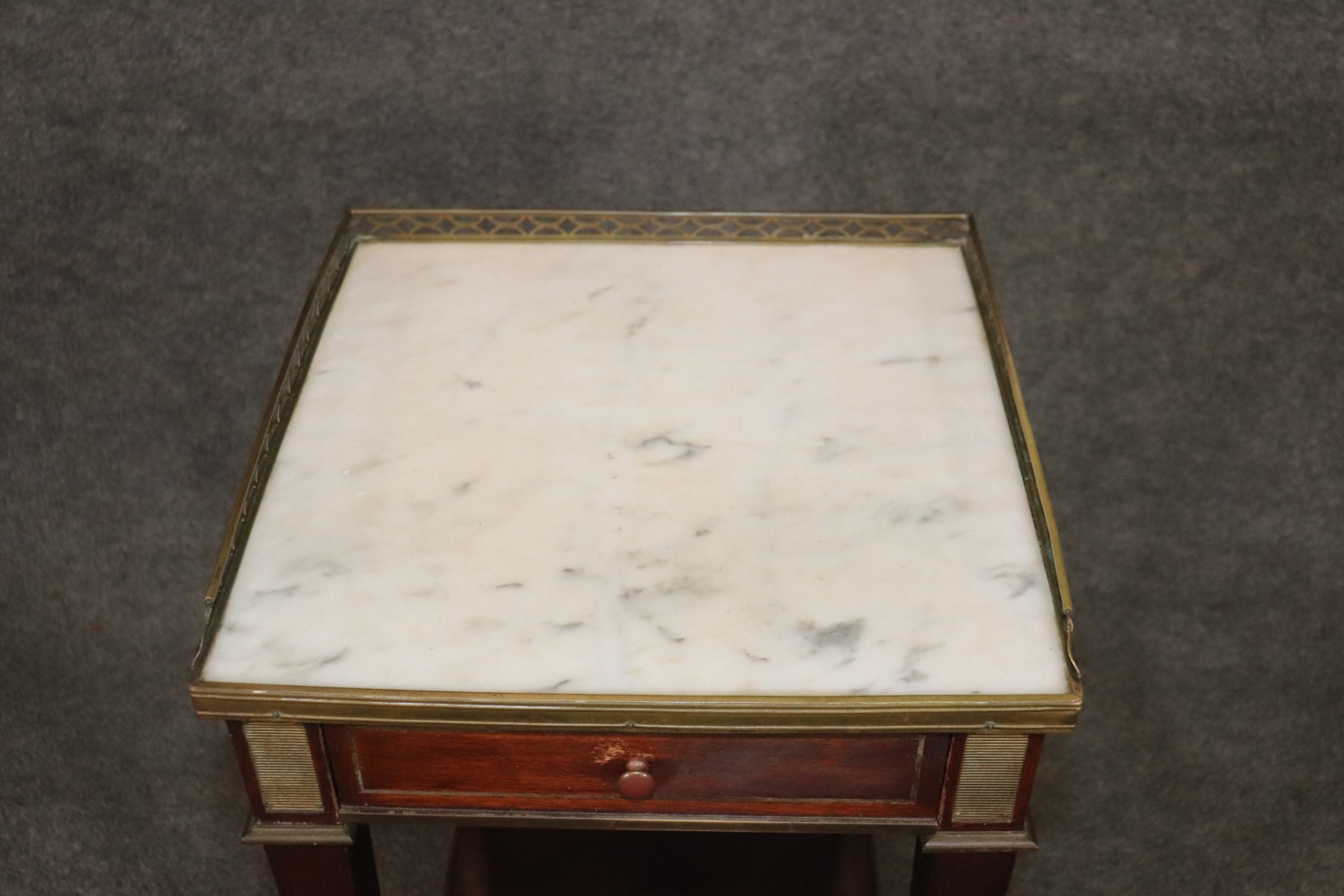 This Louis XVI Style French Marble Top Stand is made of the highest quality and is truly remarkable! Although small this little stand/end table packs a punch! and will most definitely be a conversation starter! This stand can be paired with just about any style you may already have in your home or place of choosing and can be placed just about anywhere due to its size! This piece gives off an overwhelming sense of character and luxury and tells its own story as people catch themselves staring at it! This piece is made of the highest quality. The Stand is in good antique condition with minor surface scratches, finish loss and some blushing to finish as well as some imperfections to the marble top as to be expected with an item of this age! Otherwise good condition.