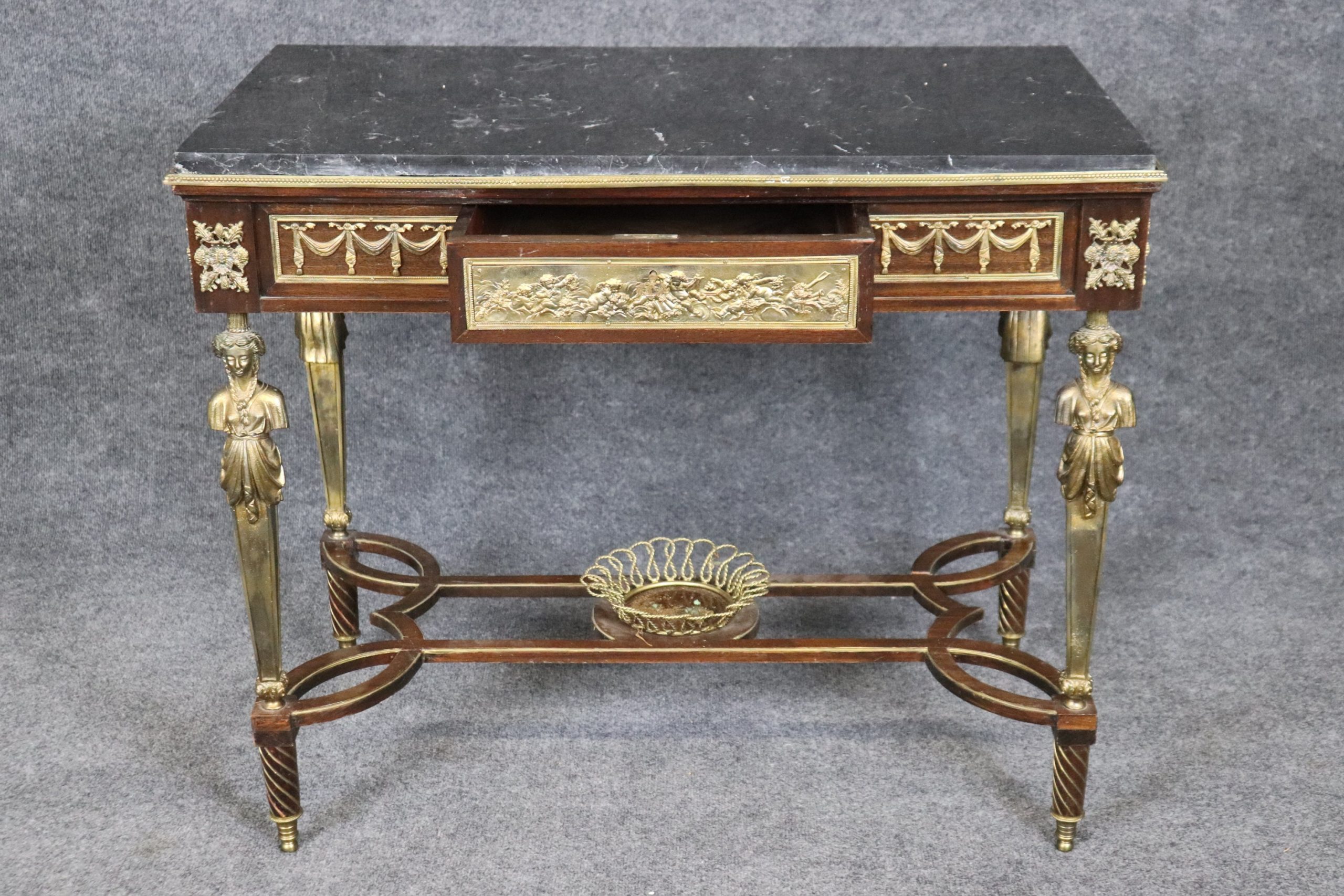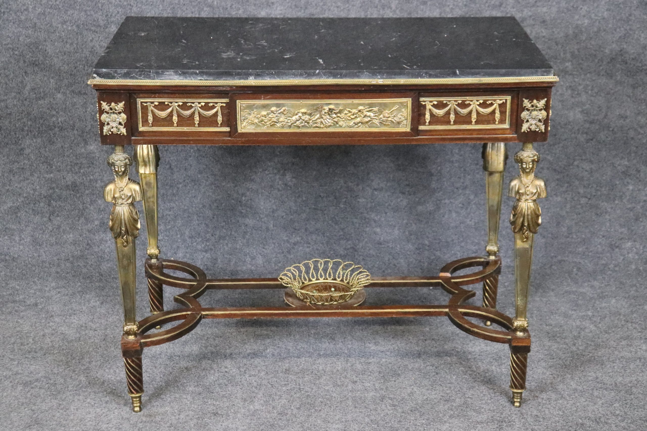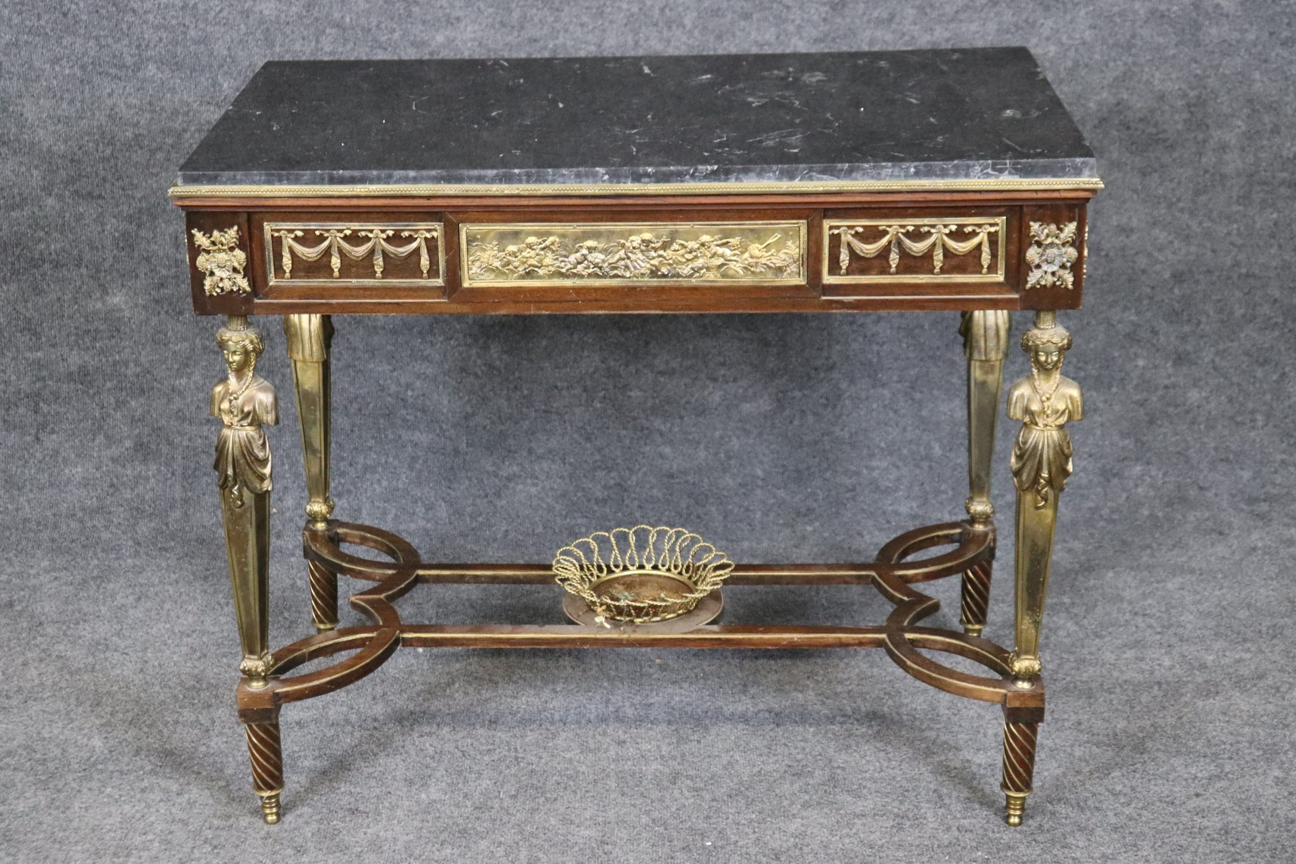 This Vintage Louis XVI style style marble top accent table, in the manner of Adam Weisweiler, is of the highest quality! Adam Weisweiler was a pre-eminent French master cabinetmaker in the Louis XVI period, working in Paris. If you look at the photos provided, you can see the attention to detail in the figural supports. This table is bound to bring a sense of luxury and sophistication into your living room, office or place of choosing and will surely be a conversation starter at your next gathering. Antique Furniture and vintage pieces have stood the test of time and this marble top table is no exception! With its quality materials and good craftsmanship this table will last you and your family for many years to come. The table is in vintage used condition with finish loss, surface scratches and tarnishing to the metal. This is an opportunity to own an extremely rare item in your home or place of choosing.